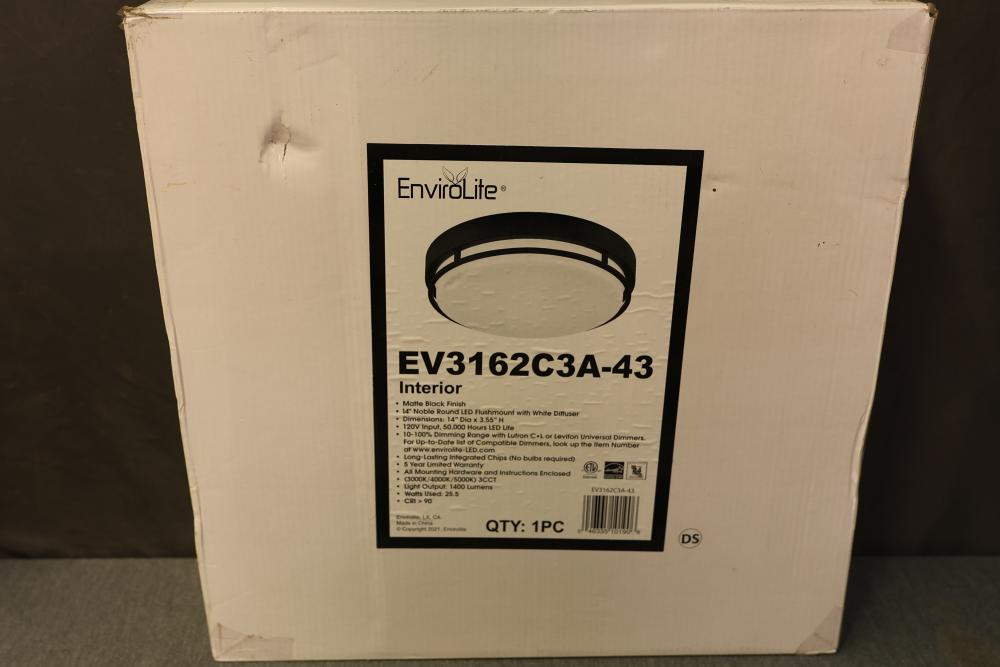 EnviroLite EV316C3A-43 14 Inch Noble Round LED Flush Mount with White Diffuser and EnviroLite EV1570C3A-151 New Winslow 16 Inch Nature Iron Round Ceiling Mount. The EV316C3A-43 features a 120V input, 50,000 hours LED life, matte black finish, and is compatible with dimmers. The EV1570C3A-151 has a nature iron finish, adjustable light temperature (3CCT), and offers up to 50,000 hours of LED life. Both include instructional and installation hardware. Pickup only.