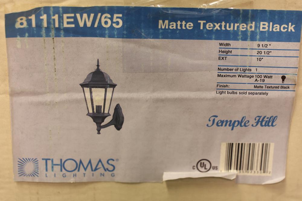 Thomas Lighting by ELK 8111EW/65 Temple Hill 1-Light Outdoor Sconce, 21 Inches High. Finished in matte textured black, this sconce accommodates one 100-watt bulb (sold separately). Dimensions include a height of 21 inches, width of 9.5 inches, and extension of 10 inches. Comes in original packaging. Pickup only.