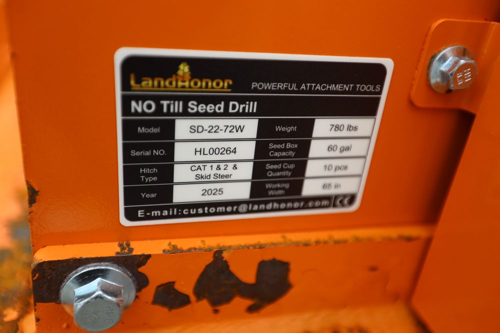 New 2026 Landhonor No Till Seed Drill Model SD-22-72W Fits Skid steer and 3-Point Quick Hitch.