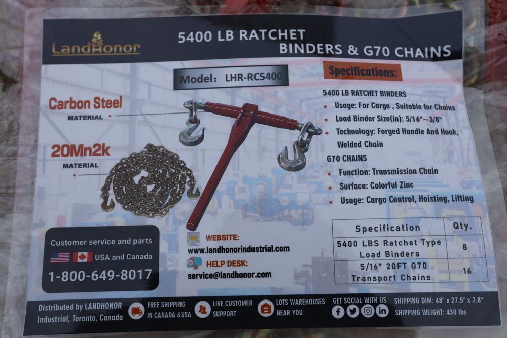New 2026 Landhonor 5400lb ratchet binders and G70 chains with eight binders and 15 5/16" 20ft transport chains model: LHR-RC5400.