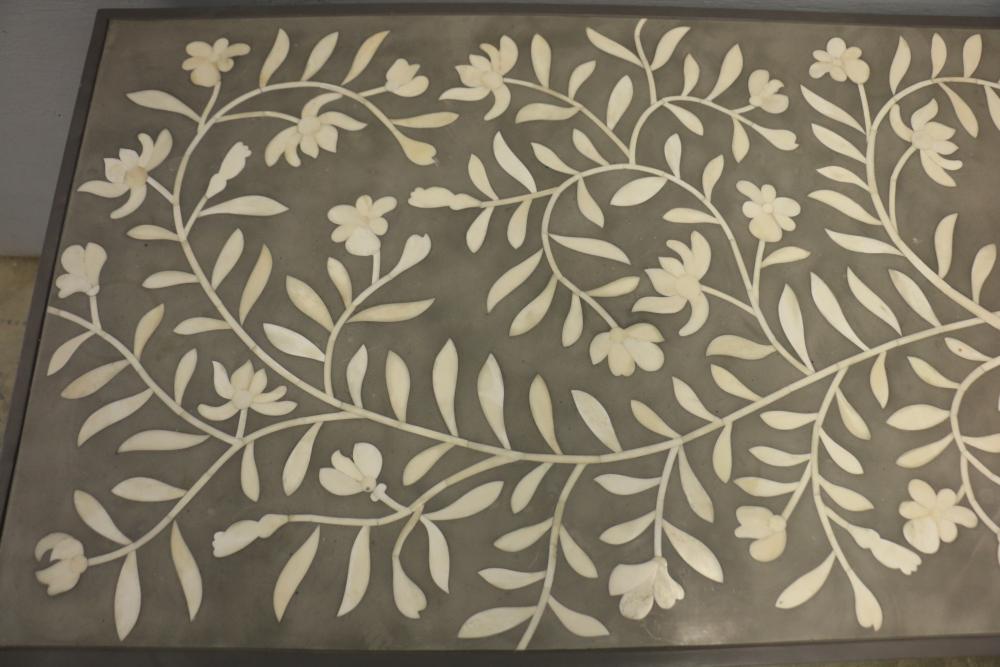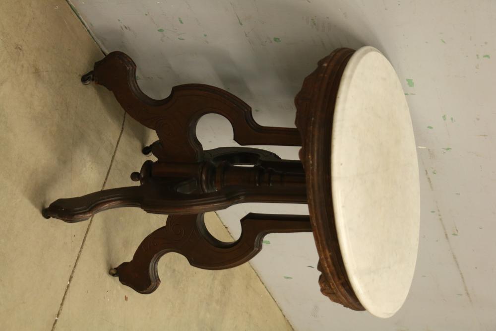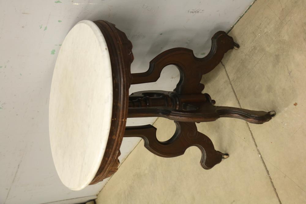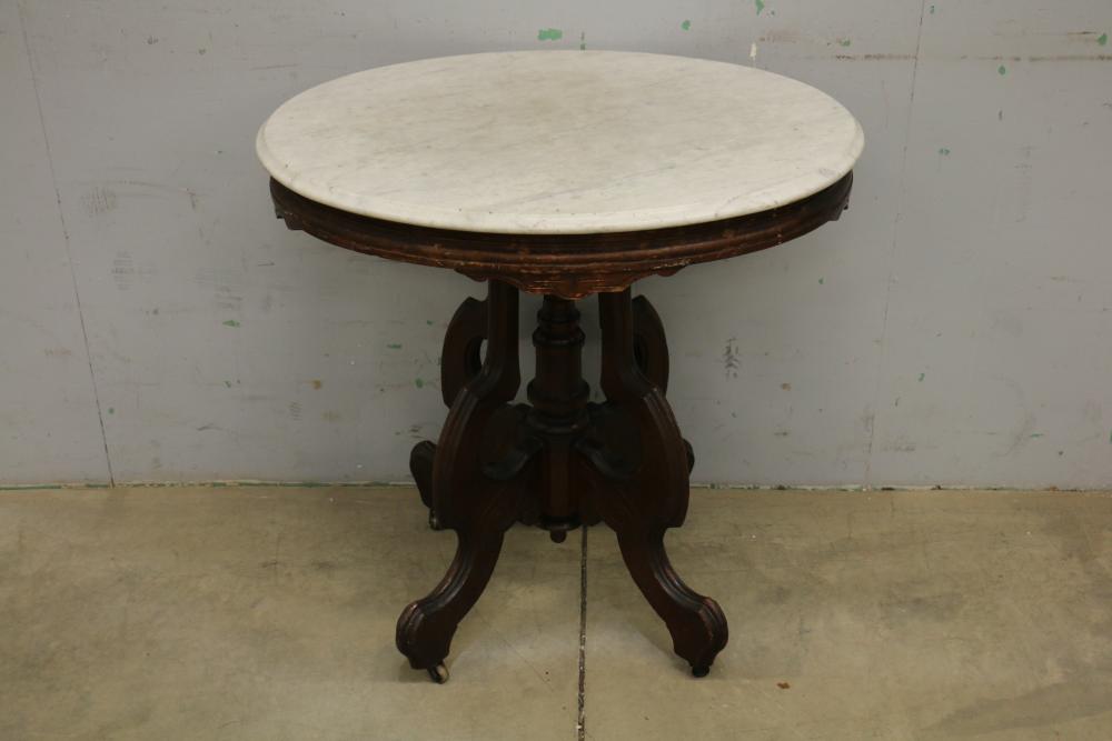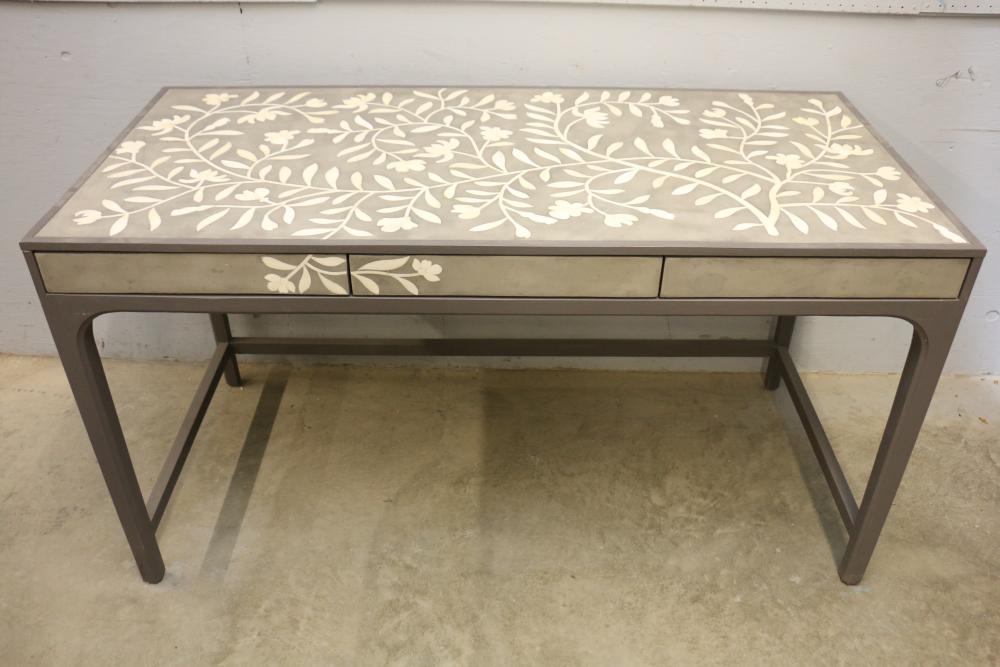 Marble Top Side Table and Inlaid Bone Floral Design Desk. Round side table features a marble top, wooden base with carved legs, and casters on the feet. The desk is decorated with a floral bone inlay on the top, sides, and back, three drawers with green interiors, and a wooden frame. Pickup only.