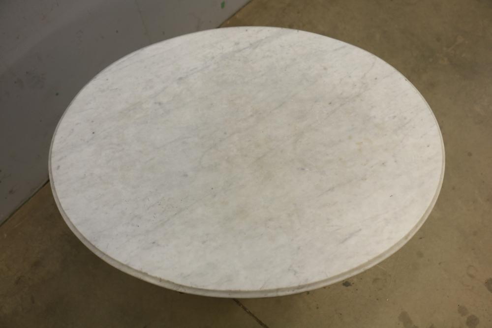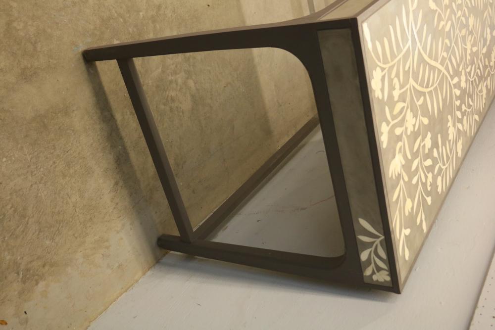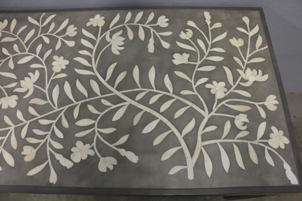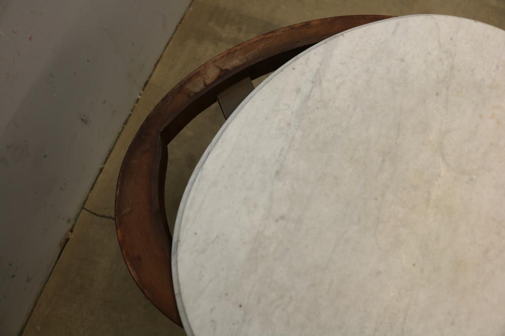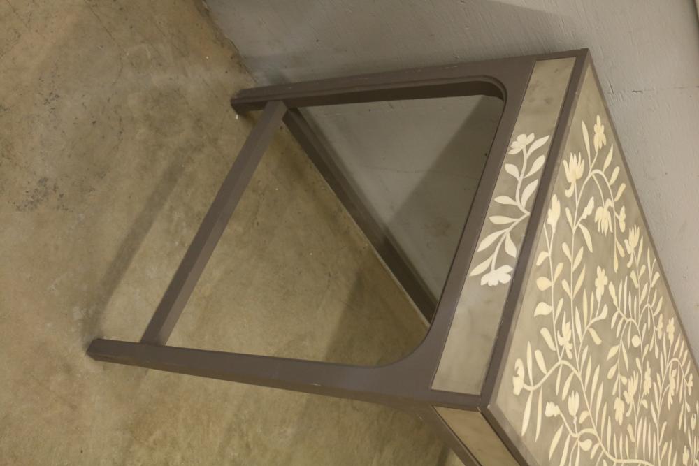 Marble Top Side Table and Inlaid Bone Floral Design Desk. Round side table features a marble top, wooden base with carved legs, and casters on the feet. The desk is decorated with a floral bone inlay on the top, sides, and back, three drawers with green interiors, and a wooden frame. Pickup only.