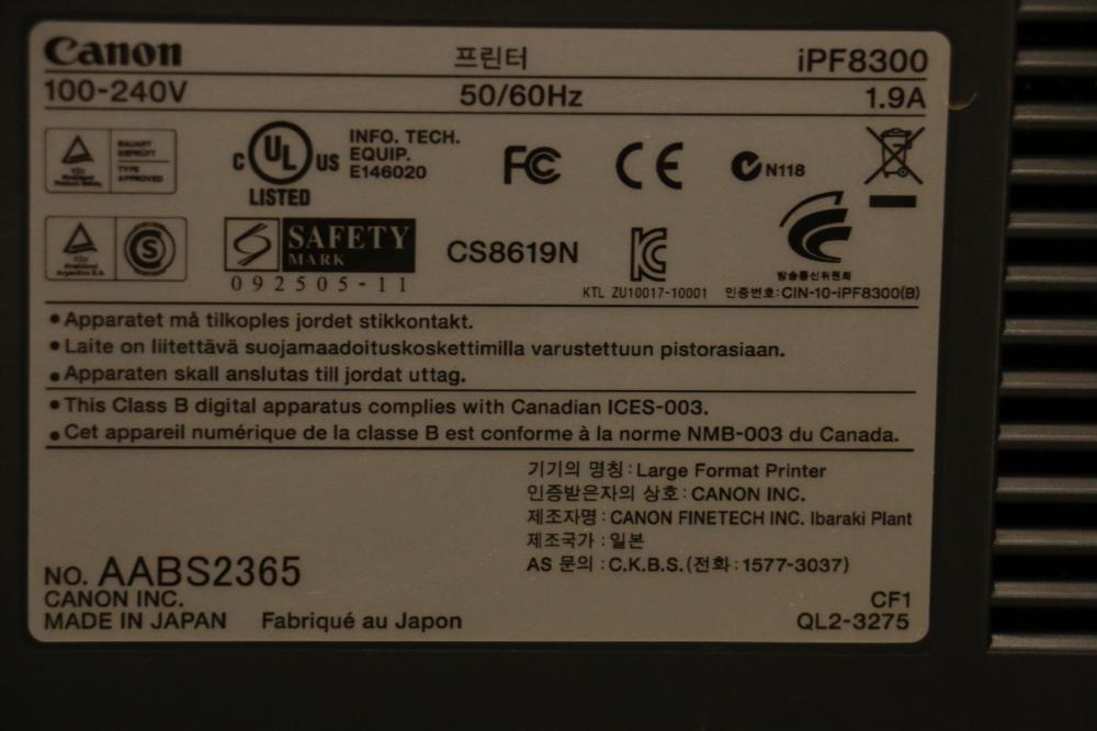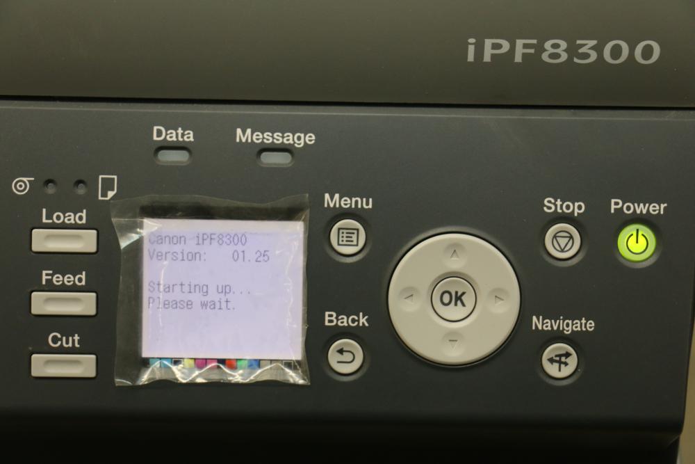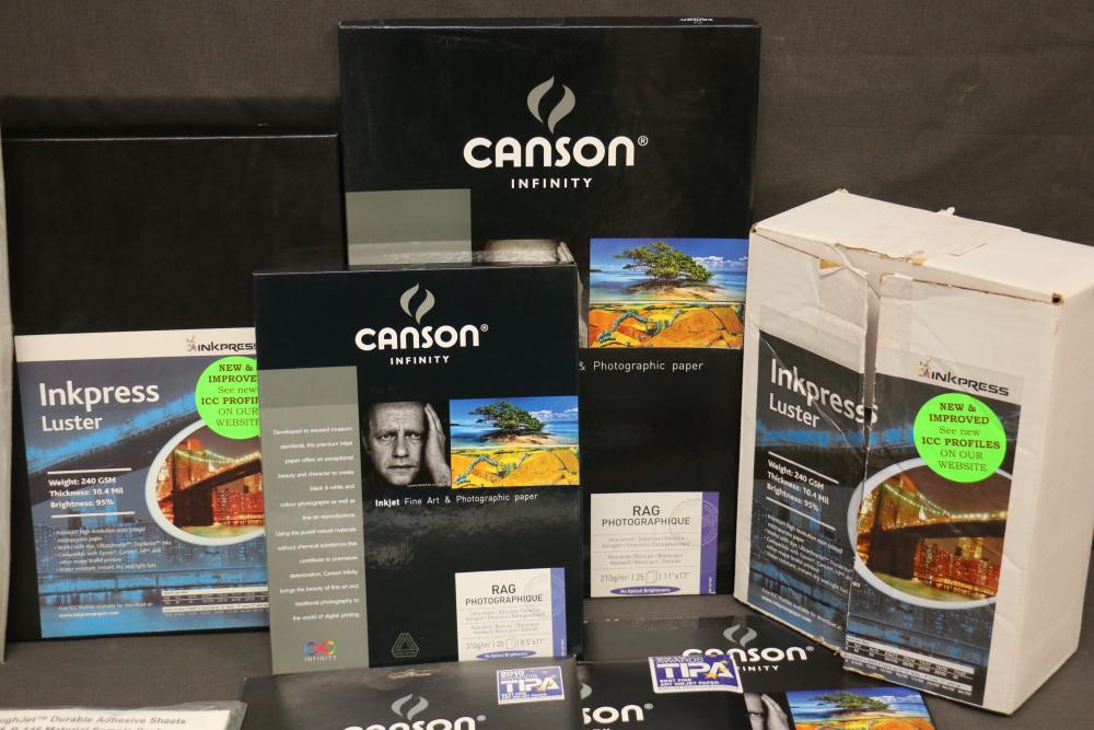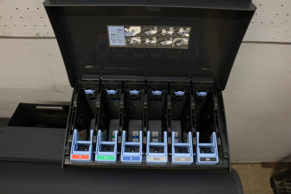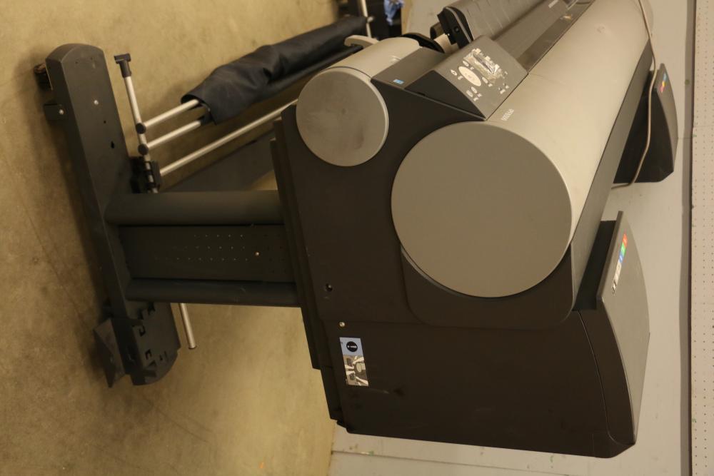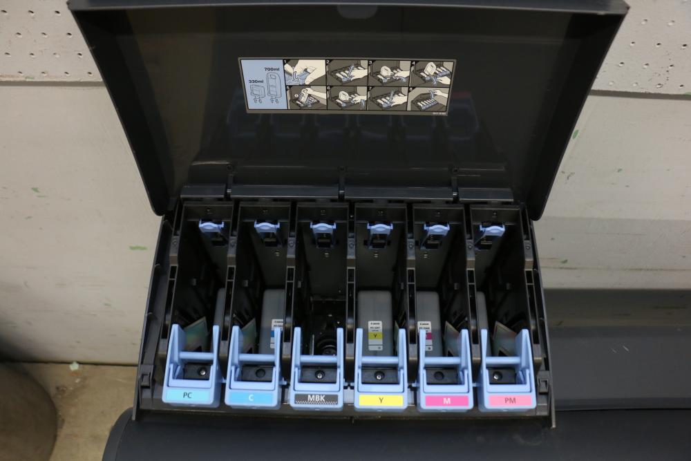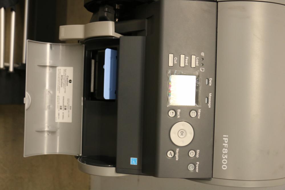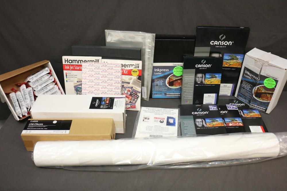 Canon iPF8300 Printer With Printing Supplies. Includes Canon iPF8300 large format printer, multiple Canon ink cartridges, Canson Infinity paper packs in discovery and trial sizes, Hammermill Inkjet Starter Kits, Brady adhesive sheets, and Canon LFM-CPA20S paper roll. Includes various additional paper supplies and accessories. (44.75"H x 72.5"L x 32"W). Pickup only.