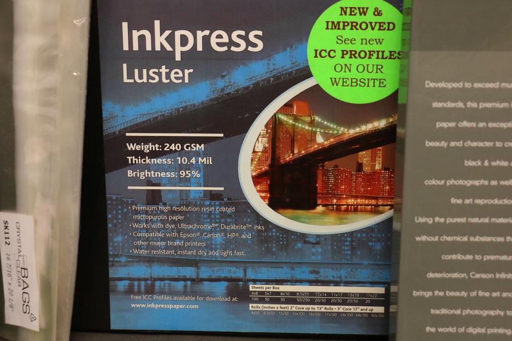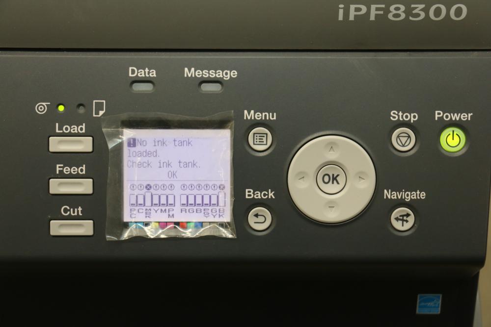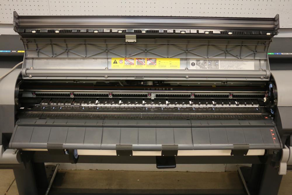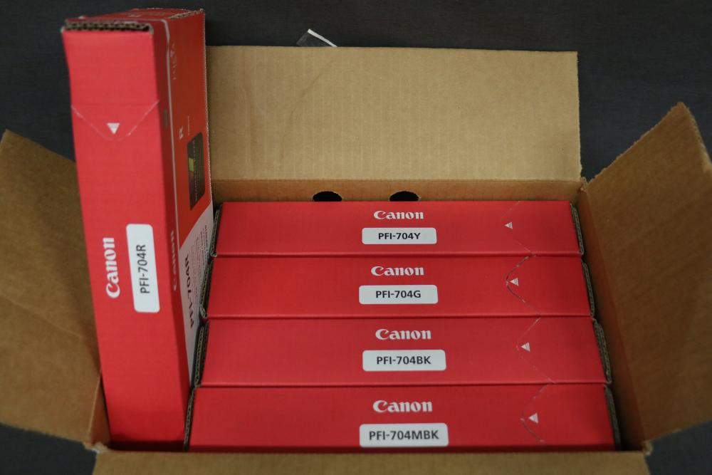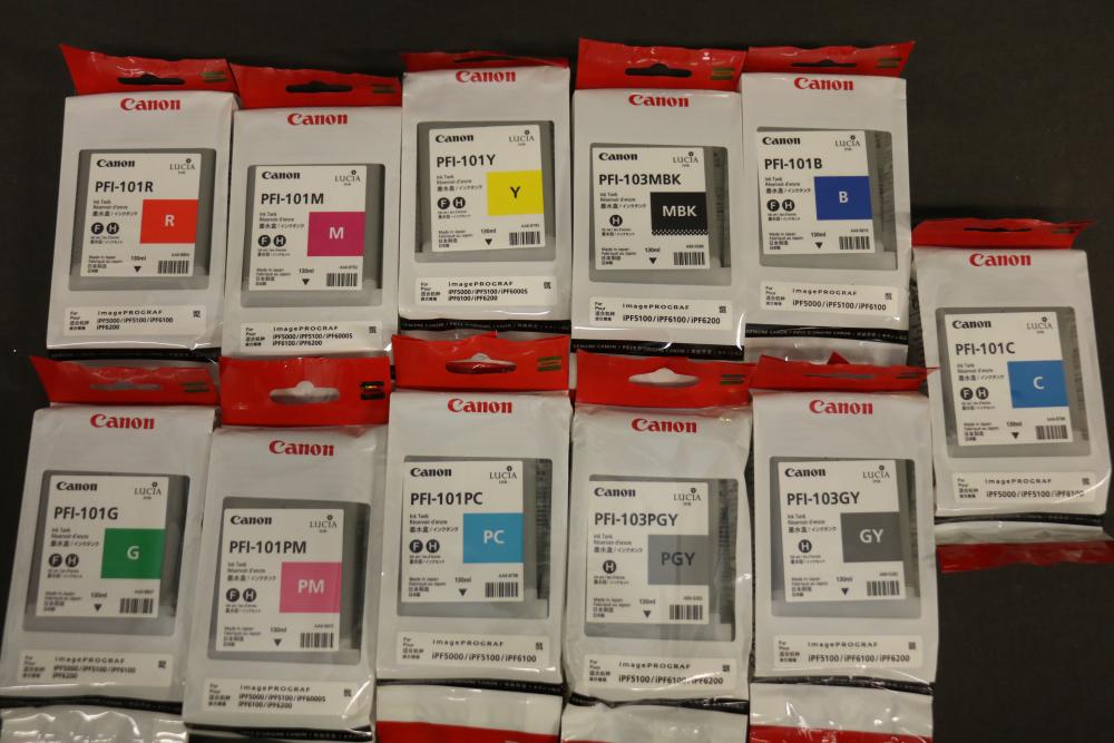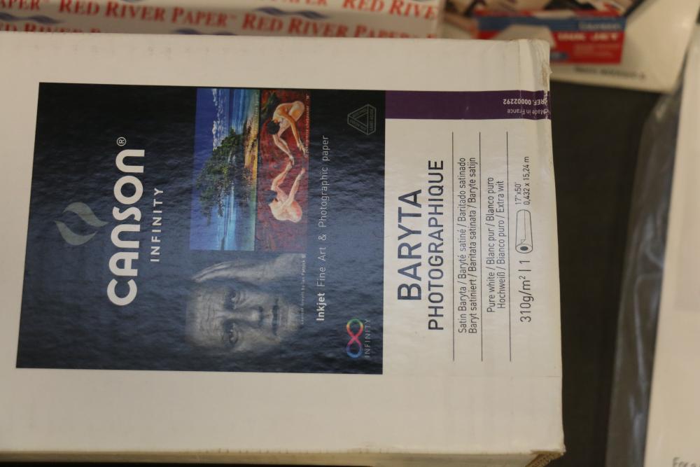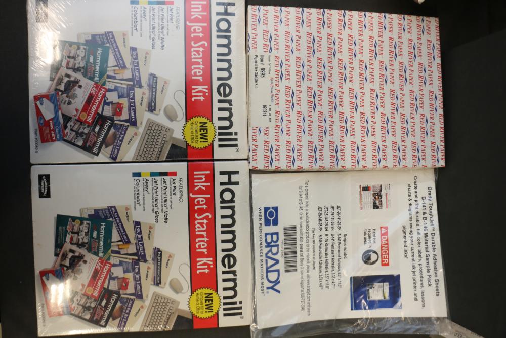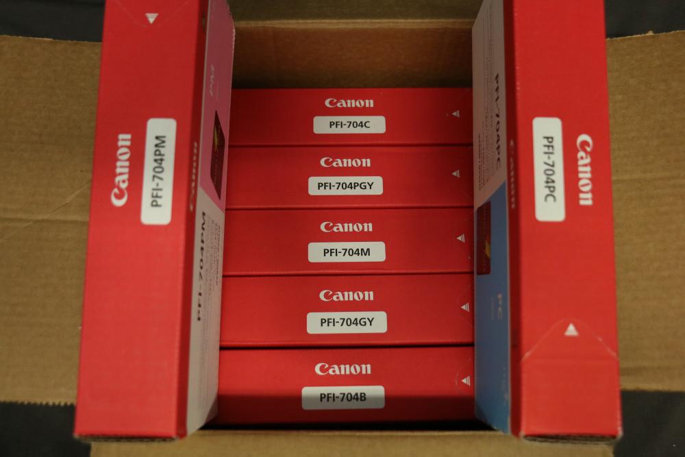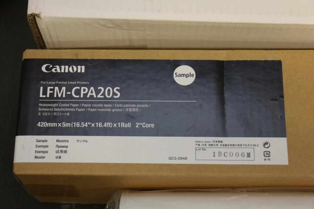 Canon iPF8300 Printer With Printing Supplies. Includes Canon iPF8300 large format printer, multiple Canon ink cartridges, Canson Infinity paper packs in discovery and trial sizes, Hammermill Inkjet Starter Kits, Brady adhesive sheets, and Canon LFM-CPA20S paper roll. Includes various additional paper supplies and accessories. (44.75"H x 72.5"L x 32"W). Pickup only.
