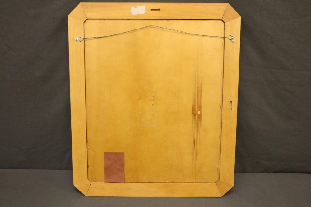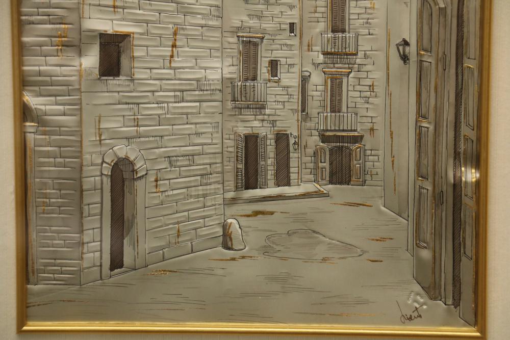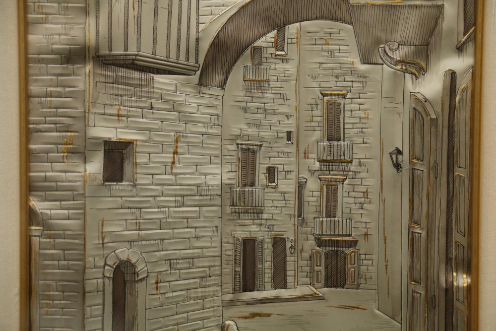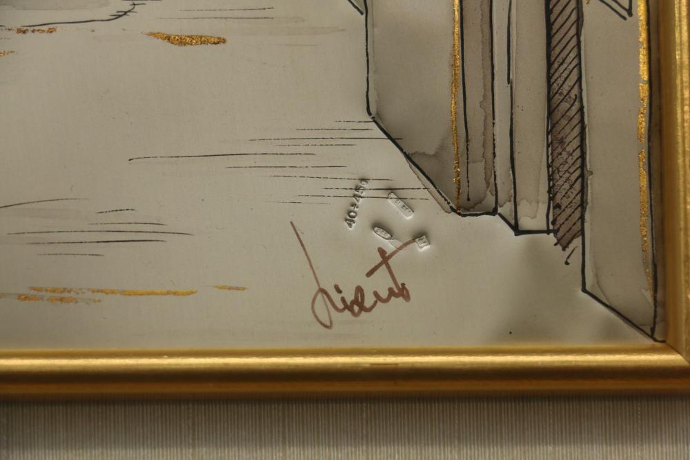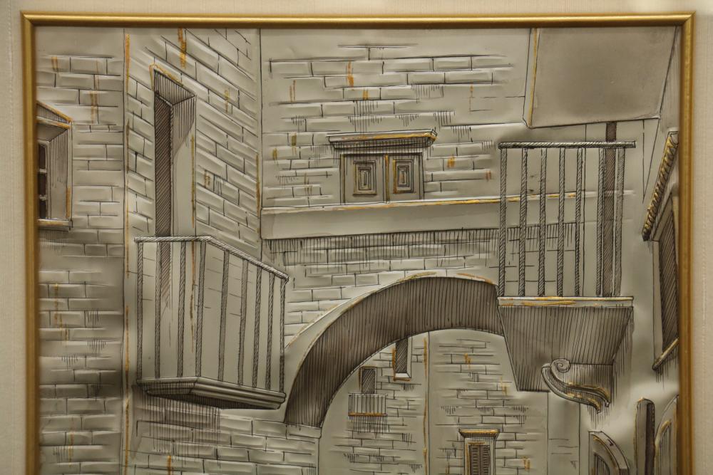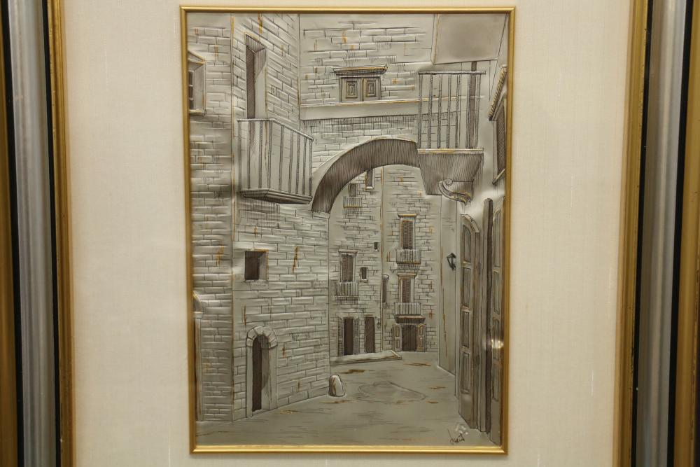 Framed Silver Bas-Relief Artwork with intricate detail, depicting an architectural scene in a detailed stone street with balconies and arches. The piece is stamped ".925" and signed on the bottom right. Weight is unknown. Dimensions of frame (26" x 22"). Pickup only.