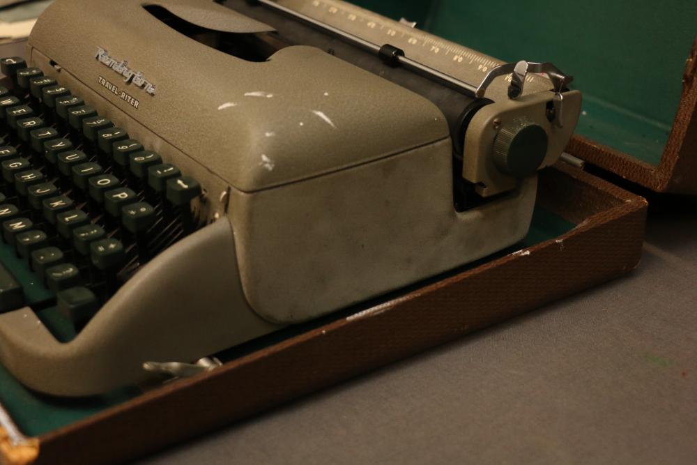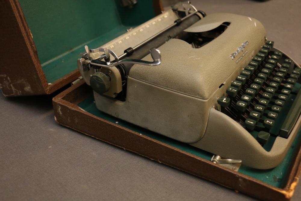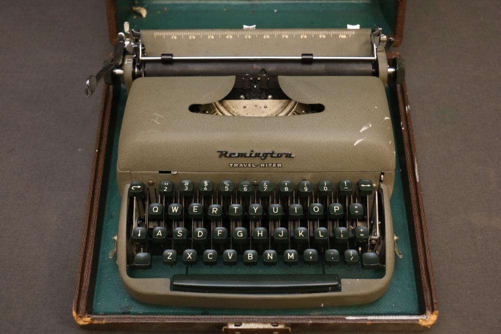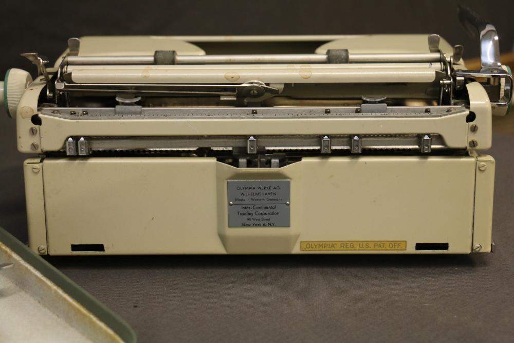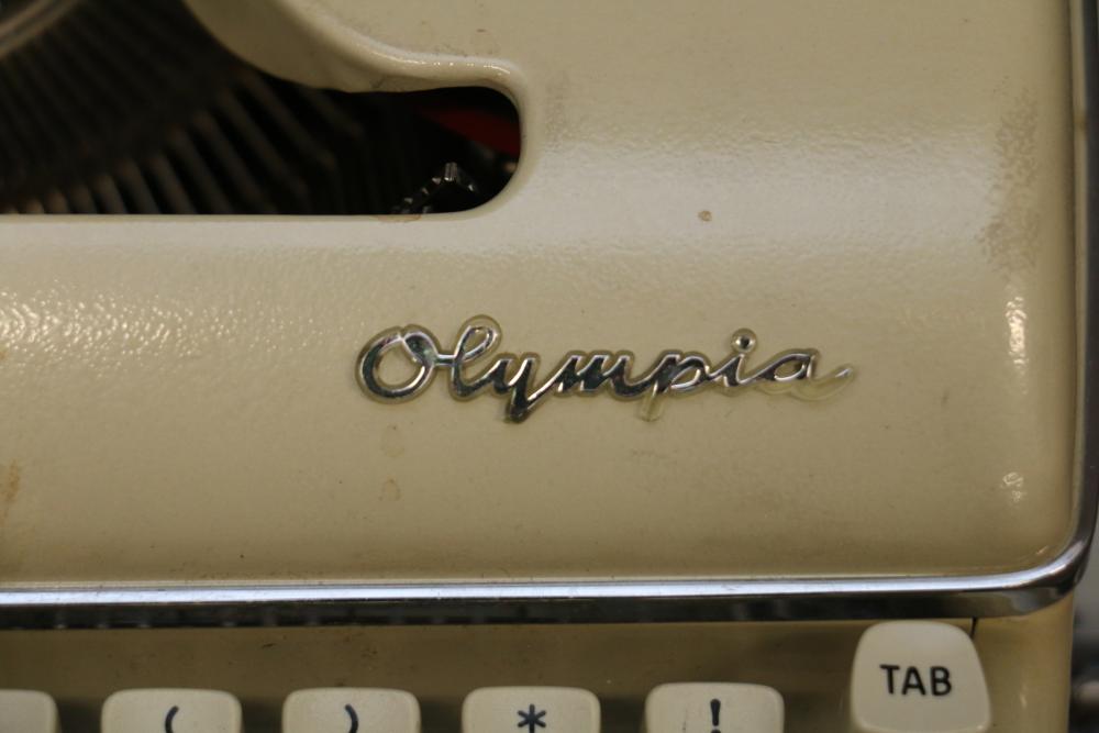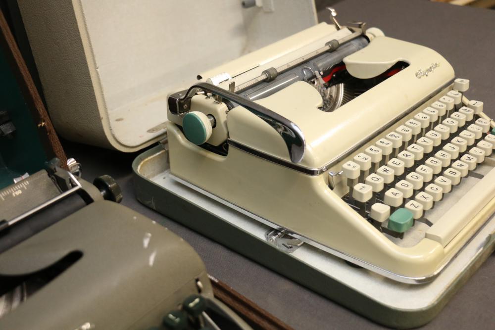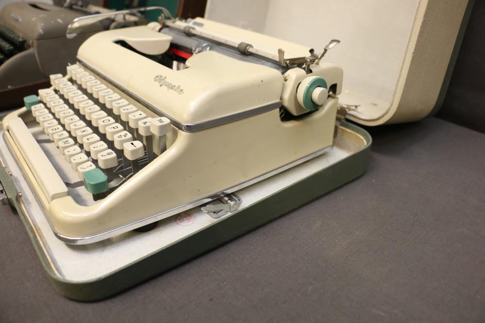 Three Manual Typewriters with Cases and Accessories. Includes an Olympia typewriter in a light-colored case, a Corona black typewriter in a hard case, and a Remington Travel-Riter typewriter in a brown case. Accessories include a ribbon, a cleaning brush, and carbon paper. Pickup only.