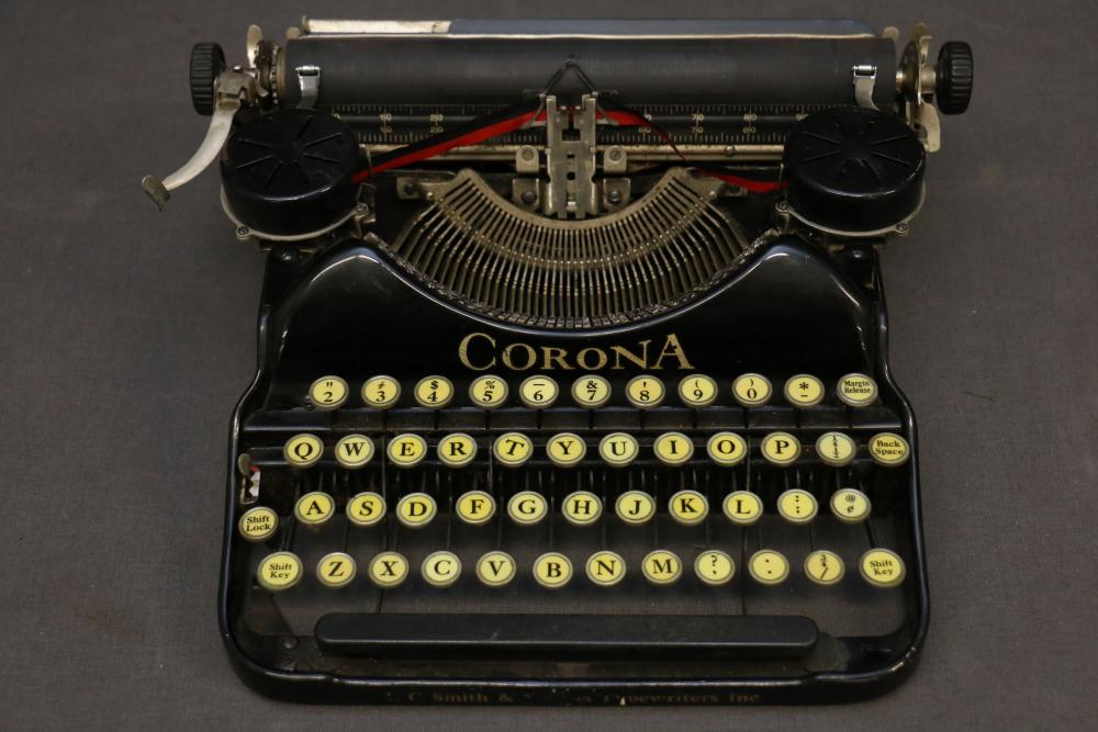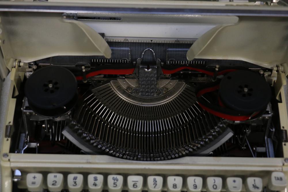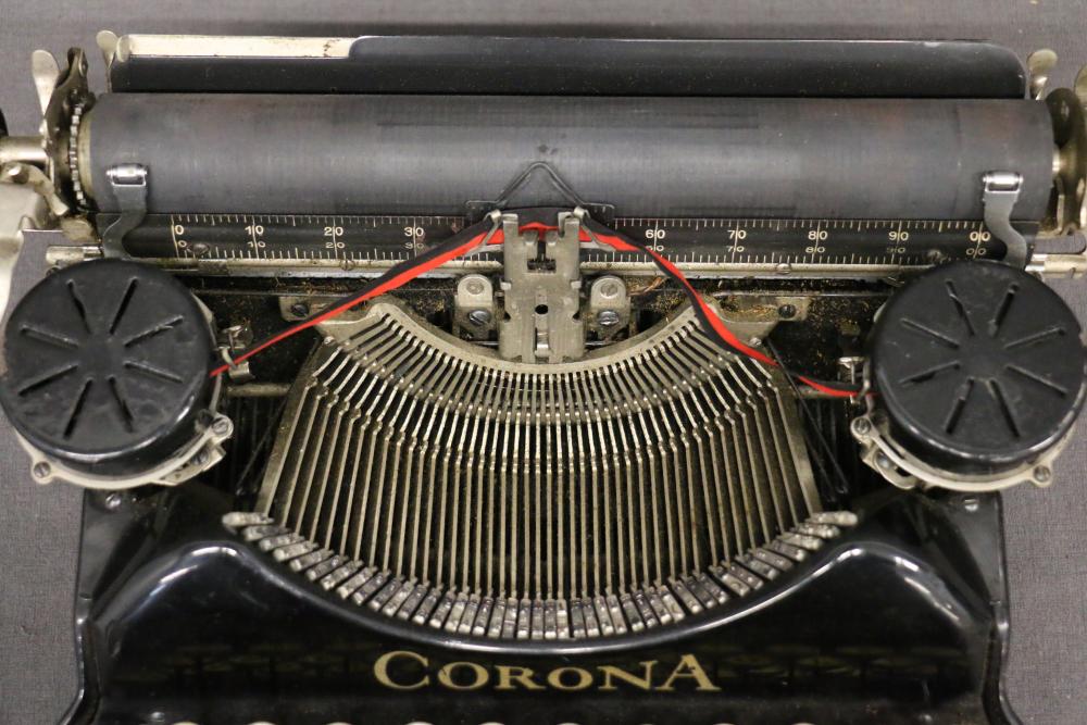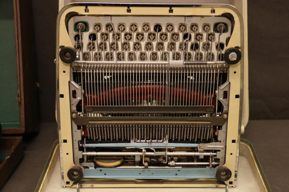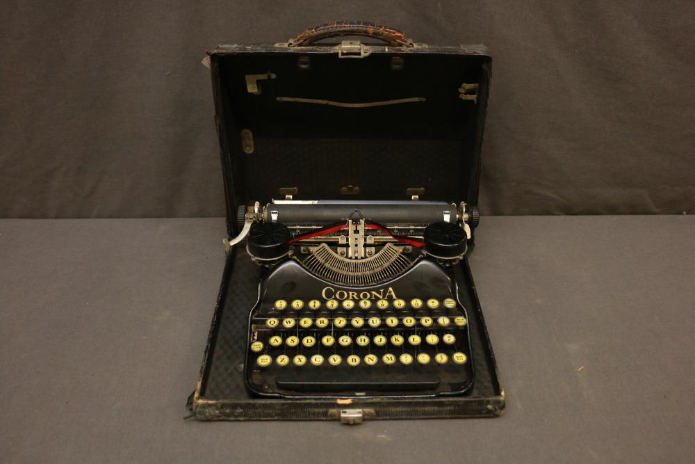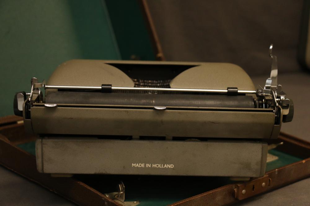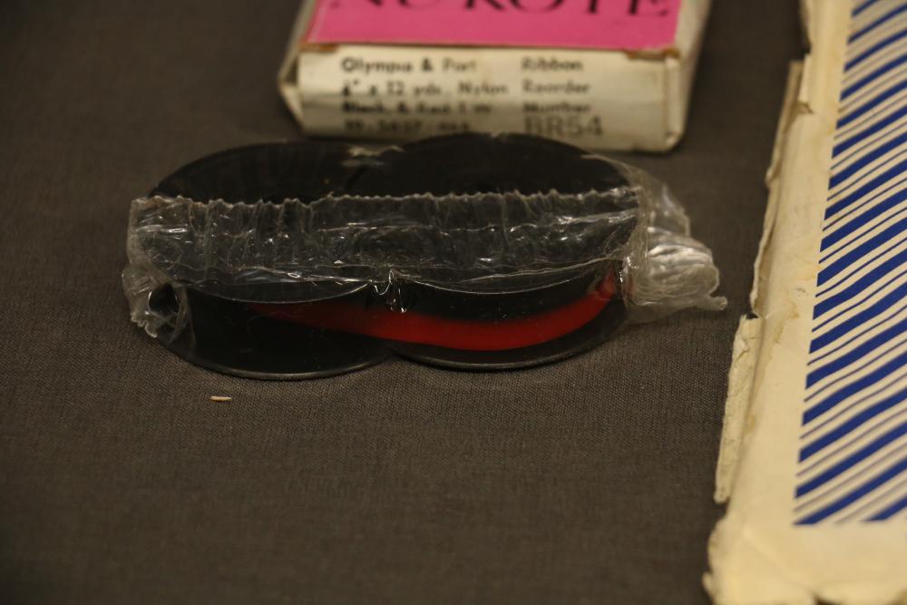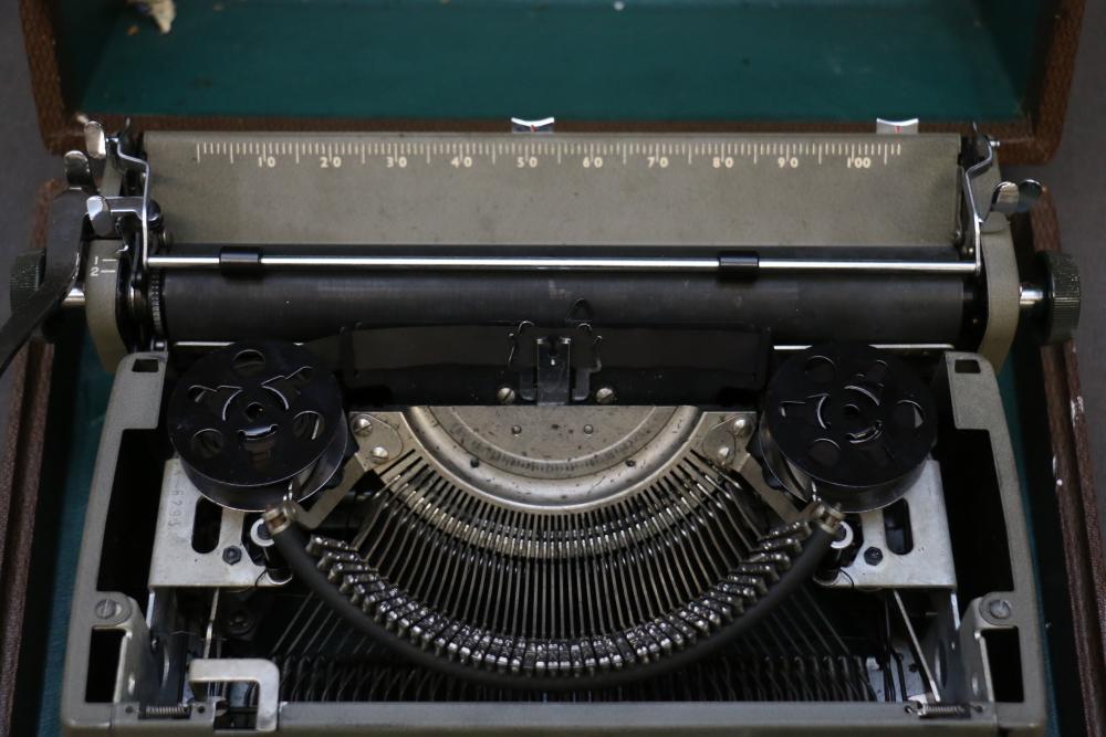 Three Manual Typewriters with Cases and Accessories. Includes an Olympia typewriter in a light-colored case, a Corona black typewriter in a hard case, and a Remington Travel-Riter typewriter in a brown case. Accessories include a ribbon, a cleaning brush, and carbon paper. Pickup only.