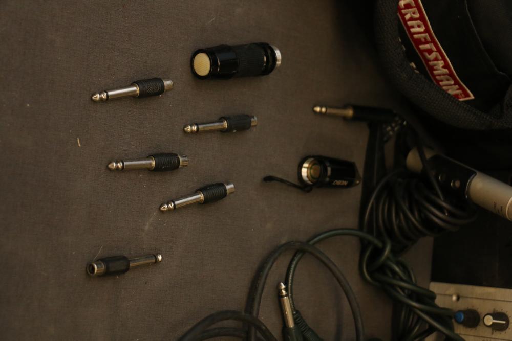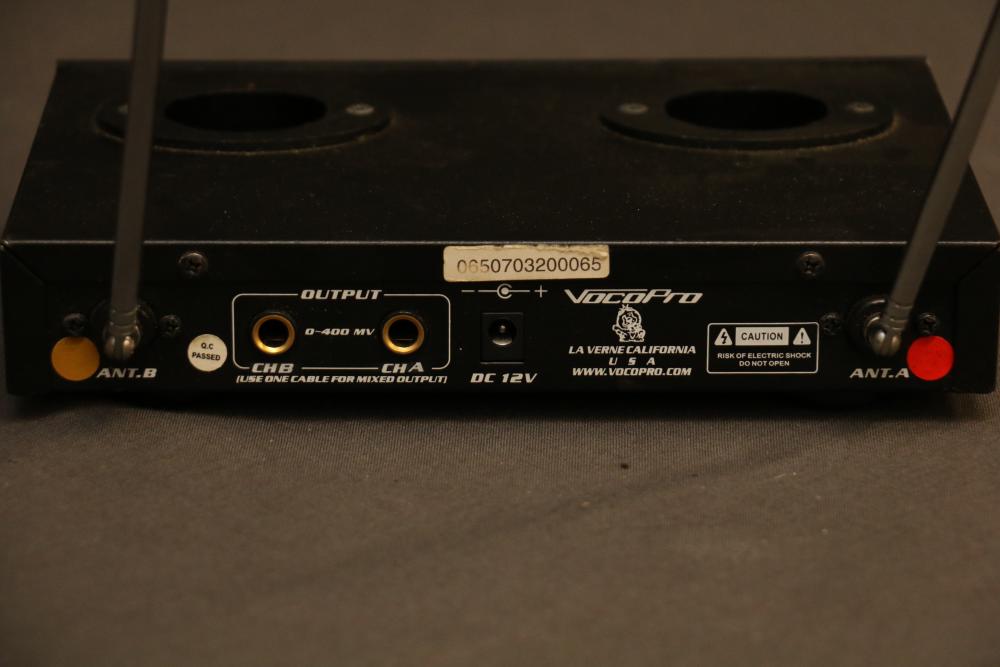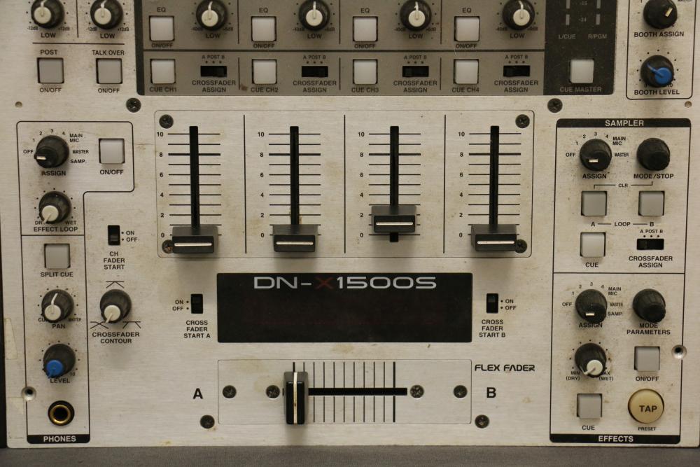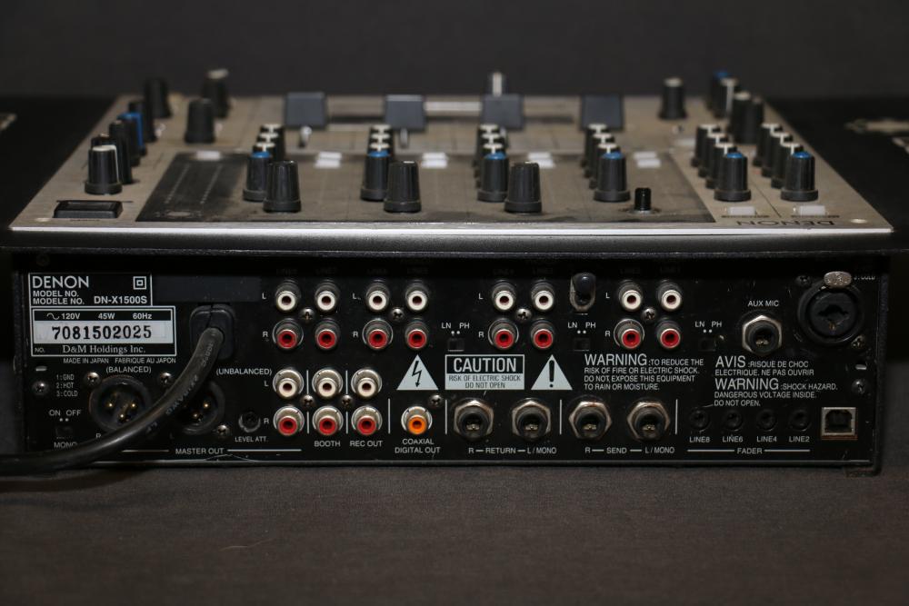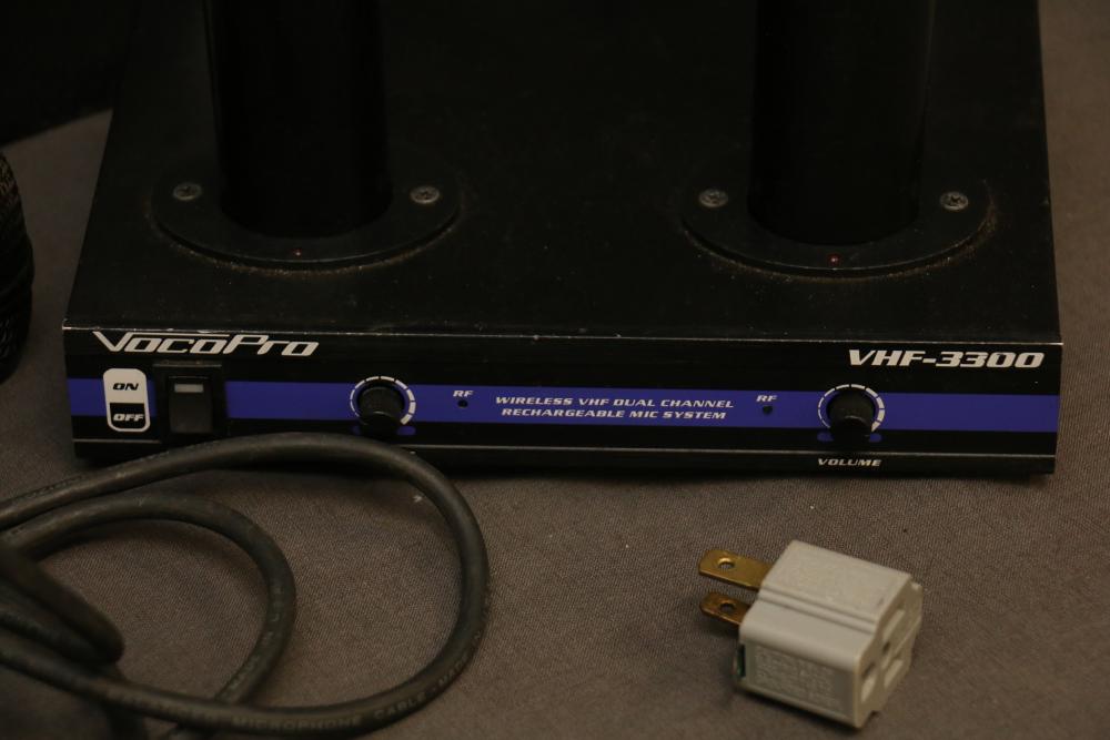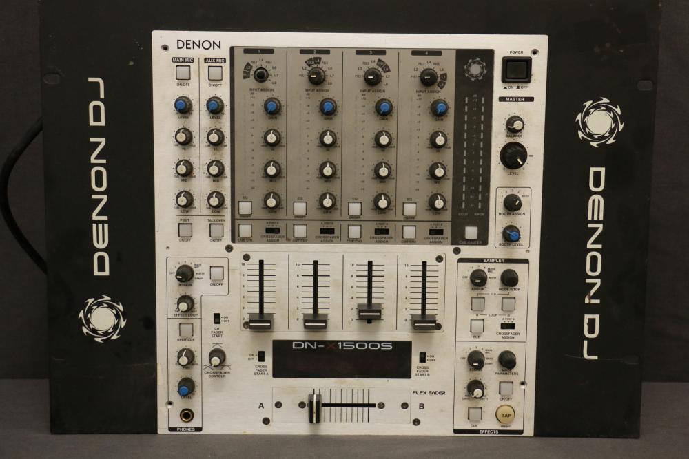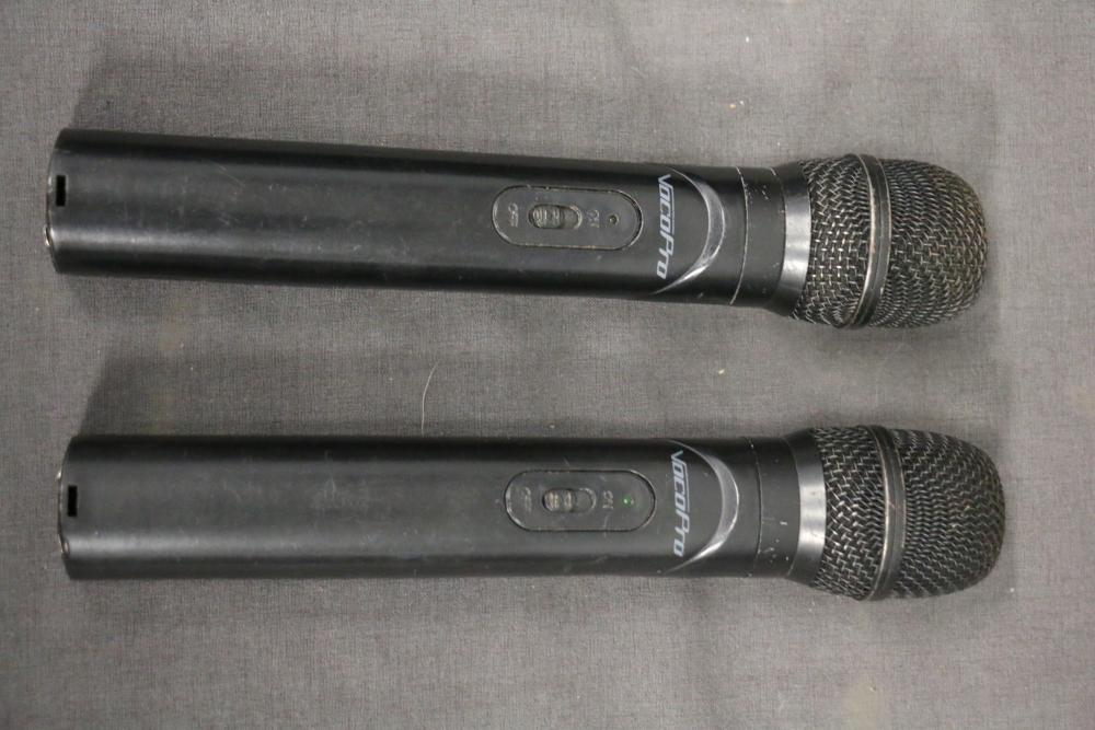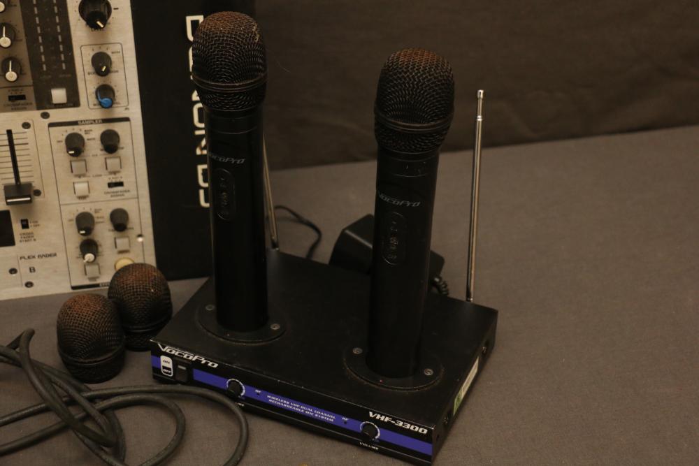 Denon DJ DN-X1500S Mixer with VocoPro VHF-3300 Microphone Set. DJ Mixer comes with faders, control knobs, input/output connections, and a power cable, designed for professional DJ settings with digital and analog input compatibility. The set also includes a VocoPro VHF-3300 Dual Channel VHF Rechargeable Wireless Microphone System featuring two handheld wireless microphones, and a vintage Panasonic WM-1240 wired microphone with a coiled cord and stand. A bag with cables and accessories, including XLR and power supply cables, is included. Channel 1 L-selector dial is broken. Pickup only.