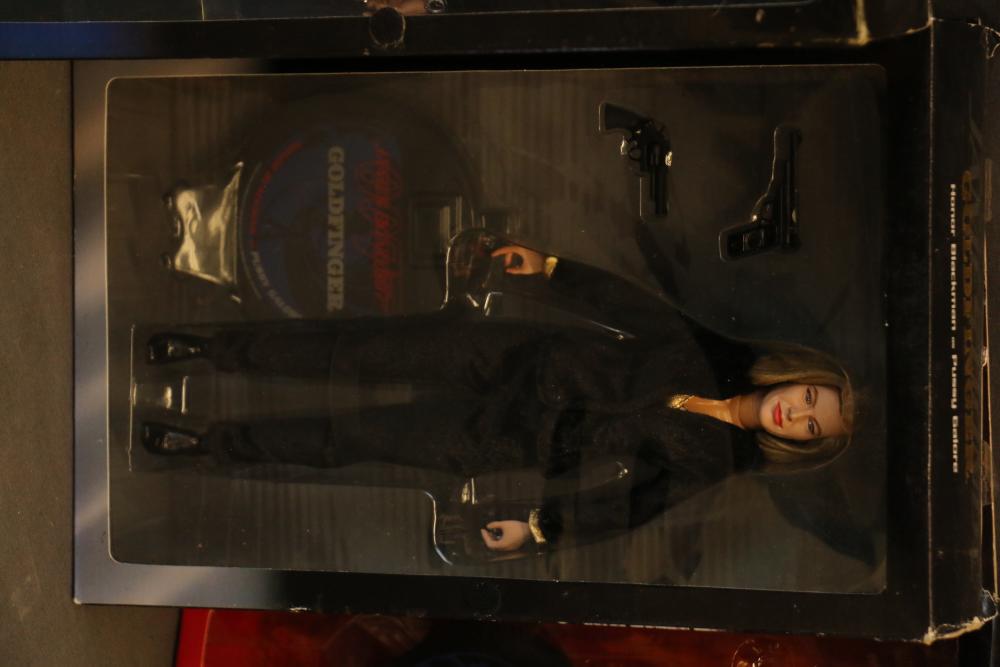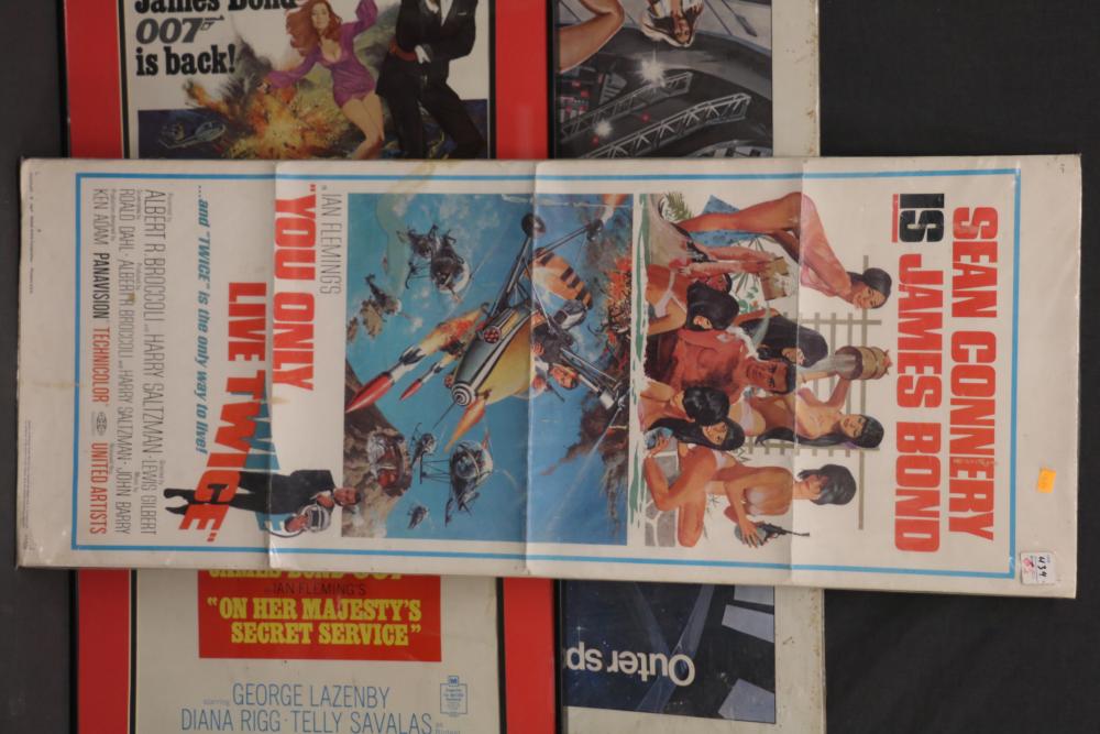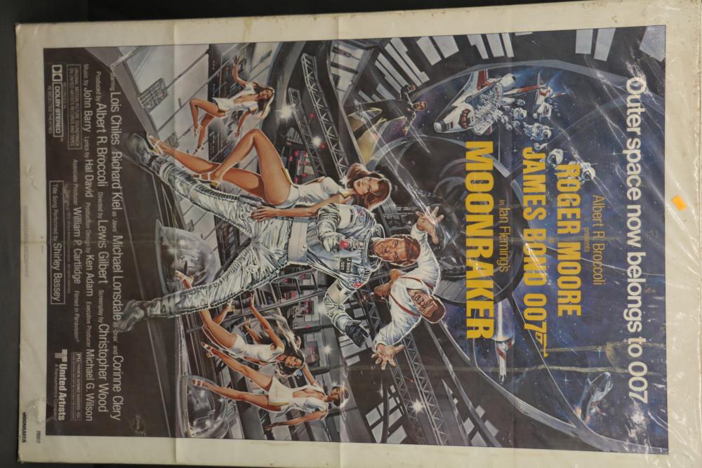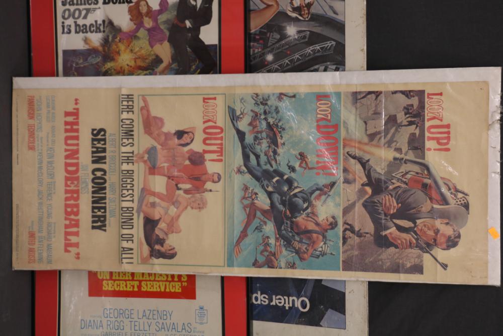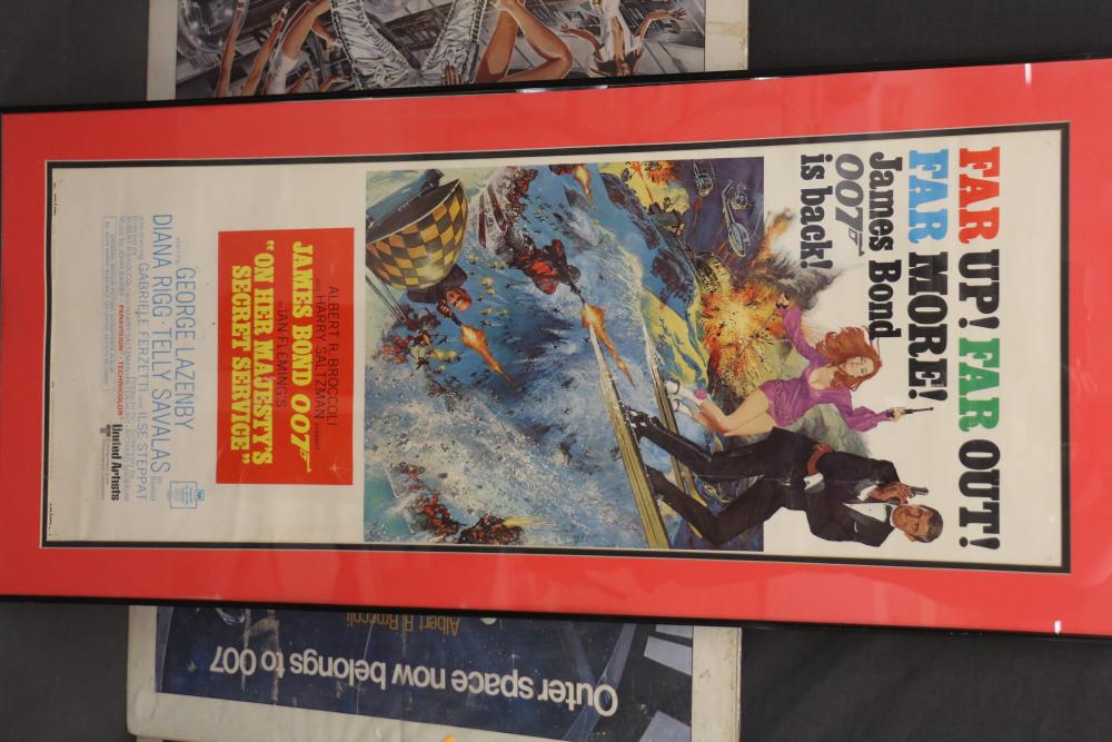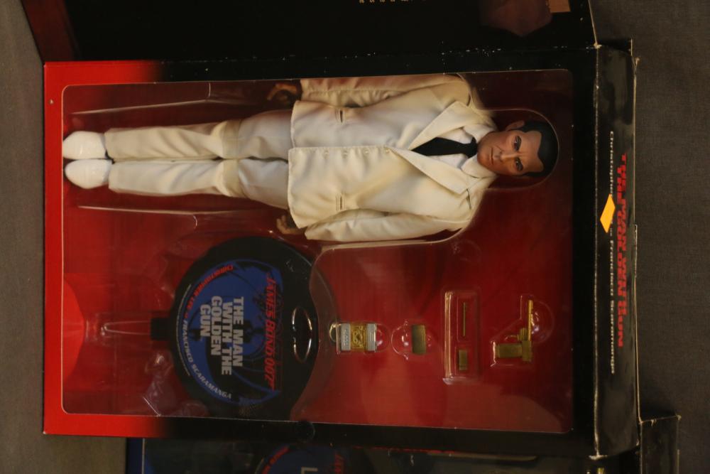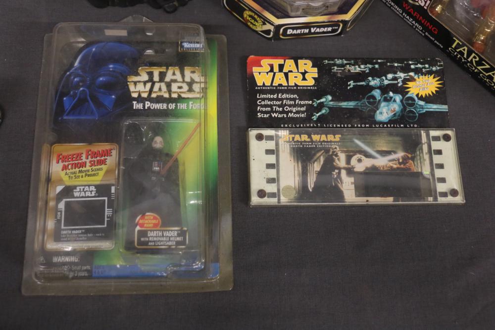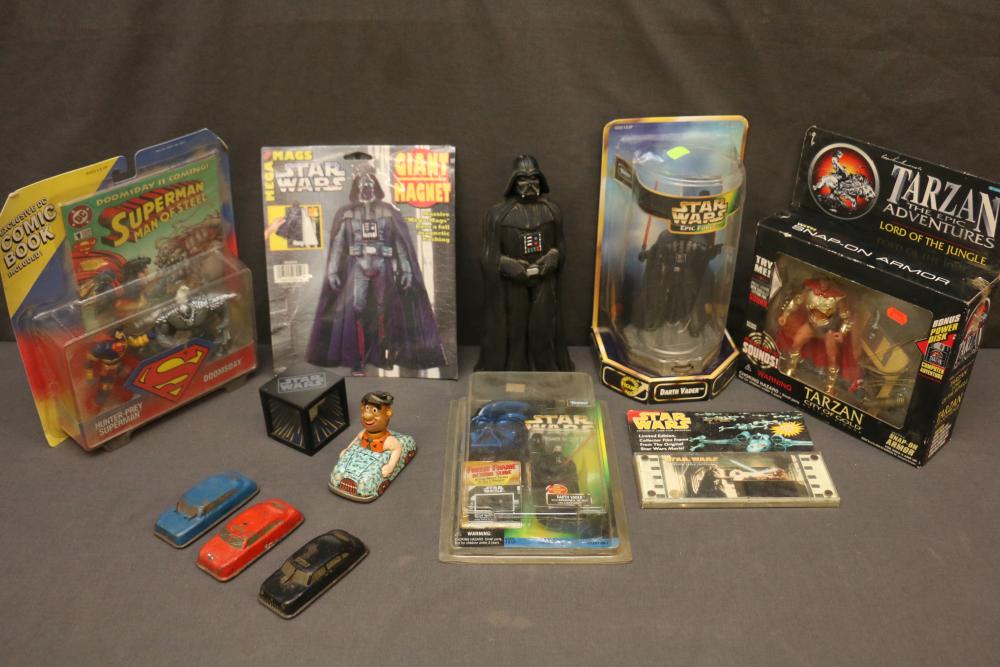 James Bond, Star Wars, Tarzan, and other memorabilia including action figures, collectible items in original packaging, and vintage James Bond movie posters featuring Thunderball, You Only Live Twice, and Moonraker. Items include Star Wars toys, a Tarzan action figure, vintage toy cars, and Superman boxed items. Pickup only.