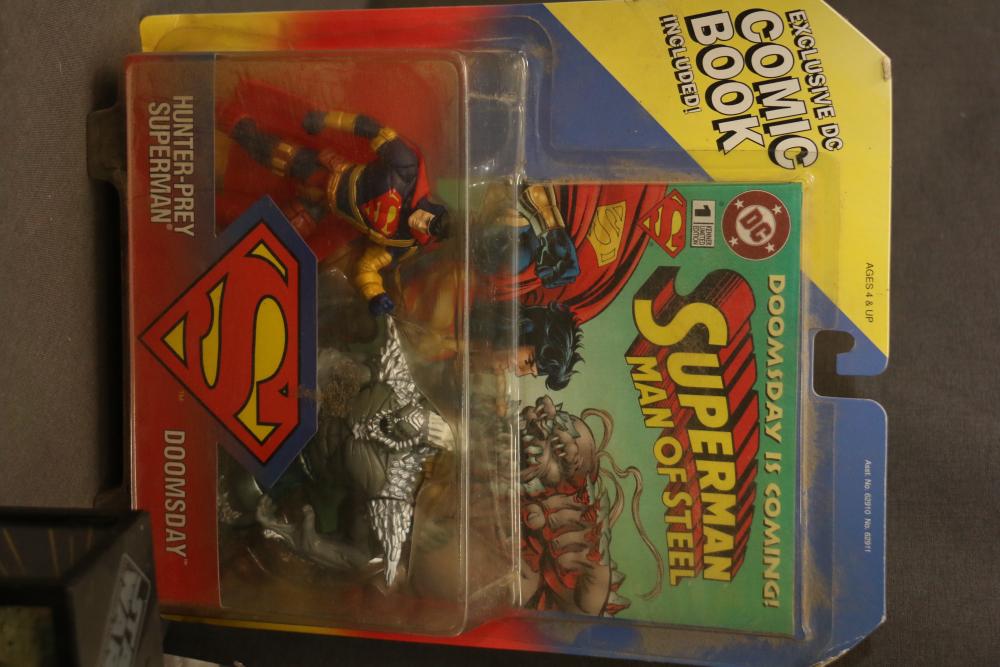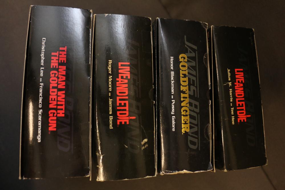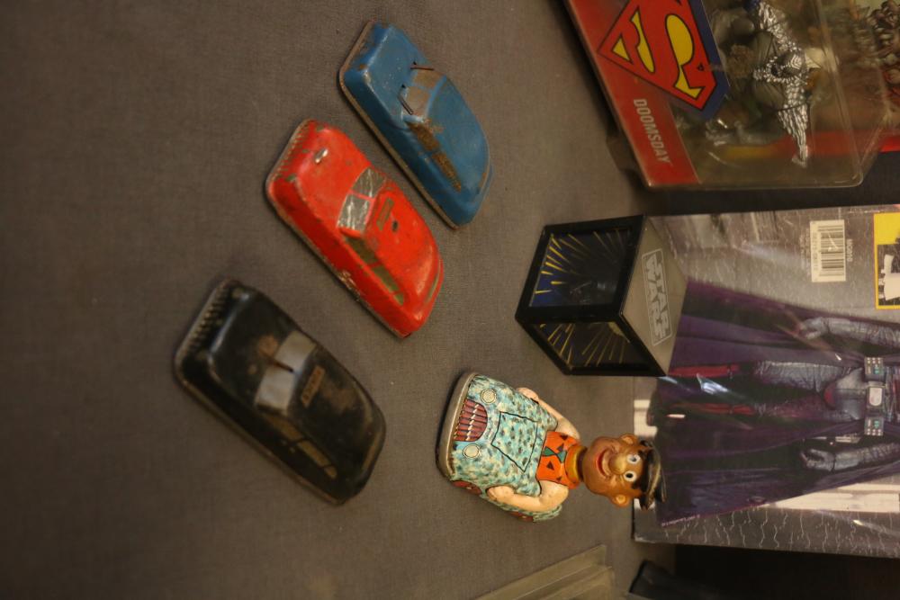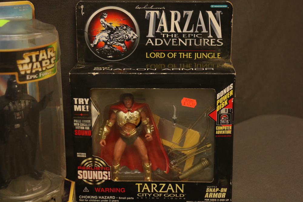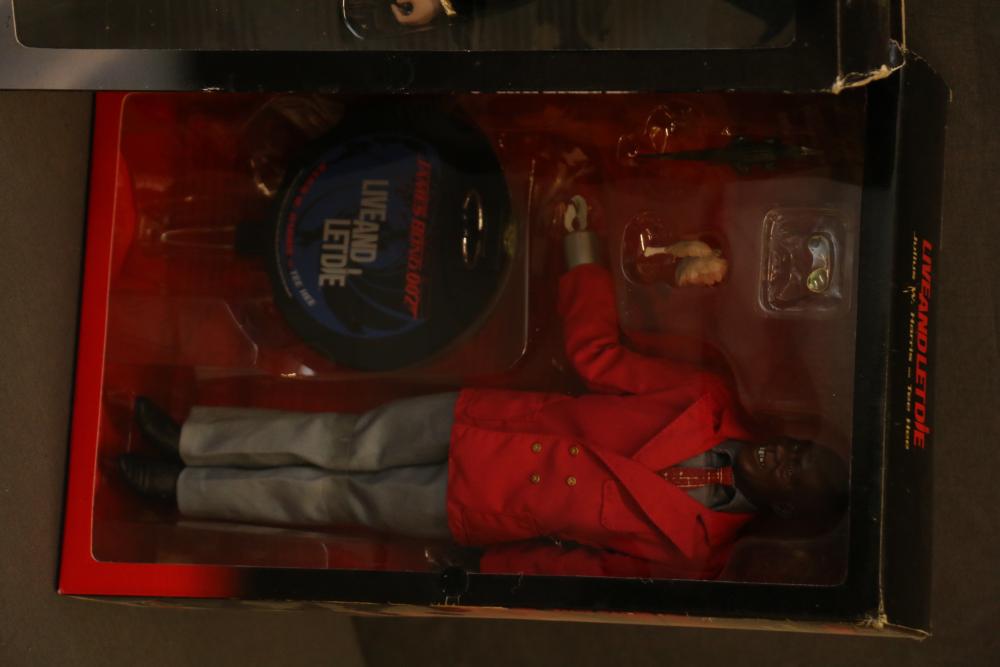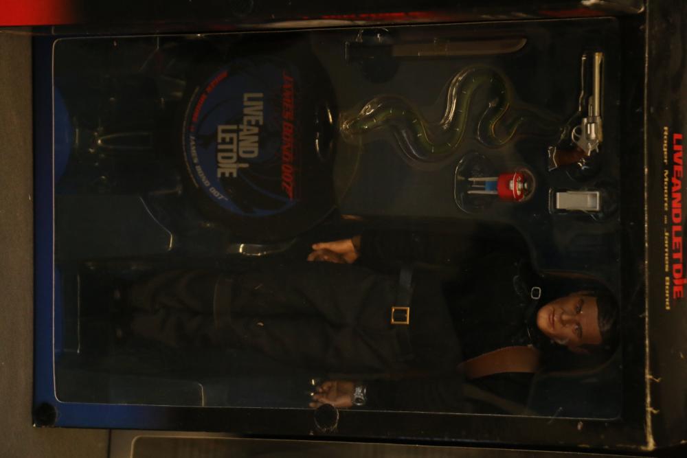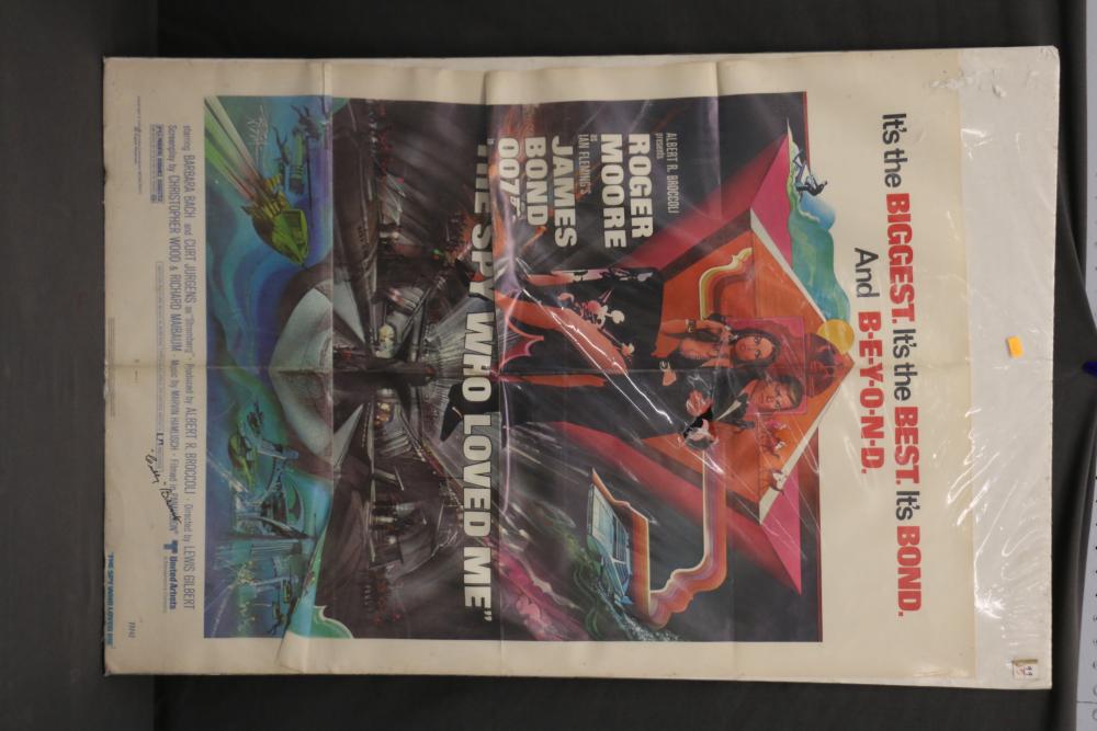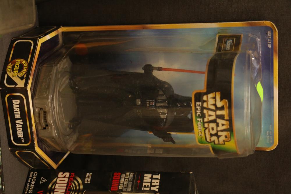 James Bond, Star Wars, Tarzan, and other memorabilia including action figures, collectible items in original packaging, and vintage James Bond movie posters featuring Thunderball, You Only Live Twice, and Moonraker. Items include Star Wars toys, a Tarzan action figure, vintage toy cars, and Superman boxed items. Pickup only.