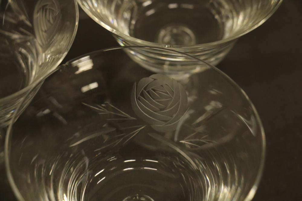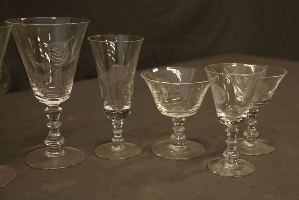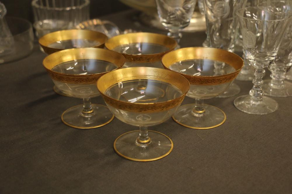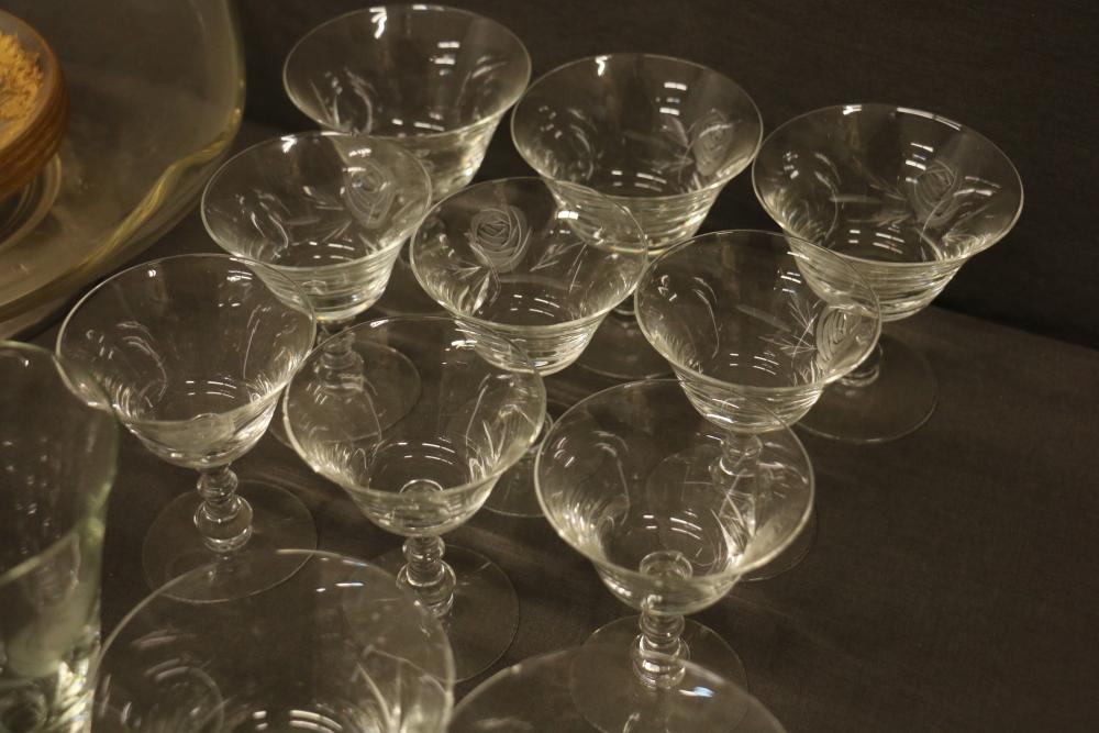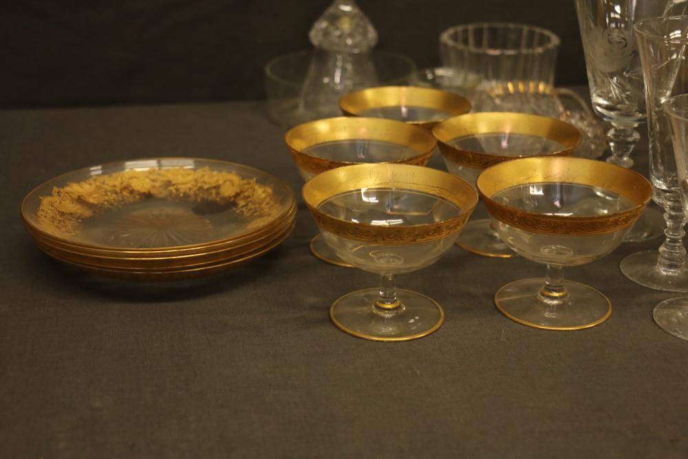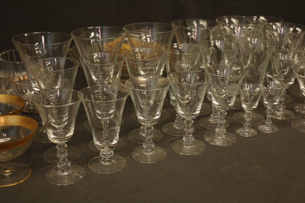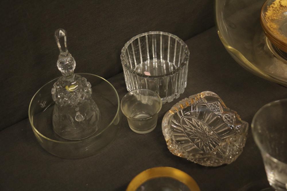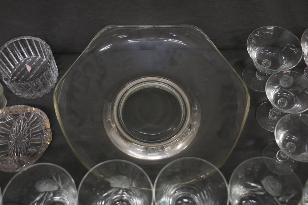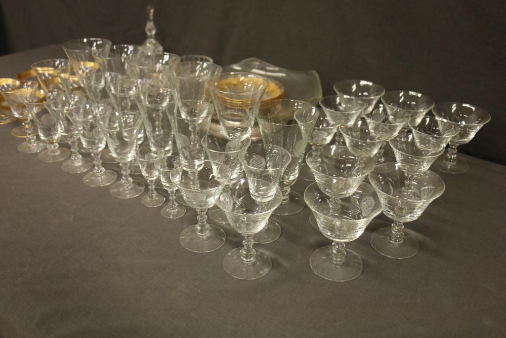 Glassware Set, Stemware, and Serving Pieces. Includes multiple glass types such as coupes, etched goblets, and stemmed wine glasses. Features clear and gold-tone glass accents. Includes a decanter, a variety of serving bowls, and plates. Pickup only.