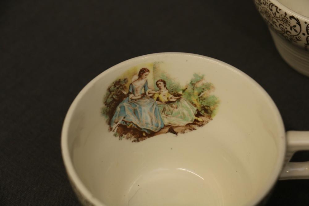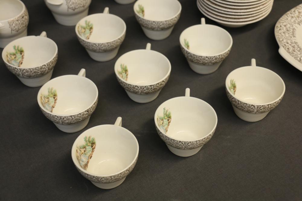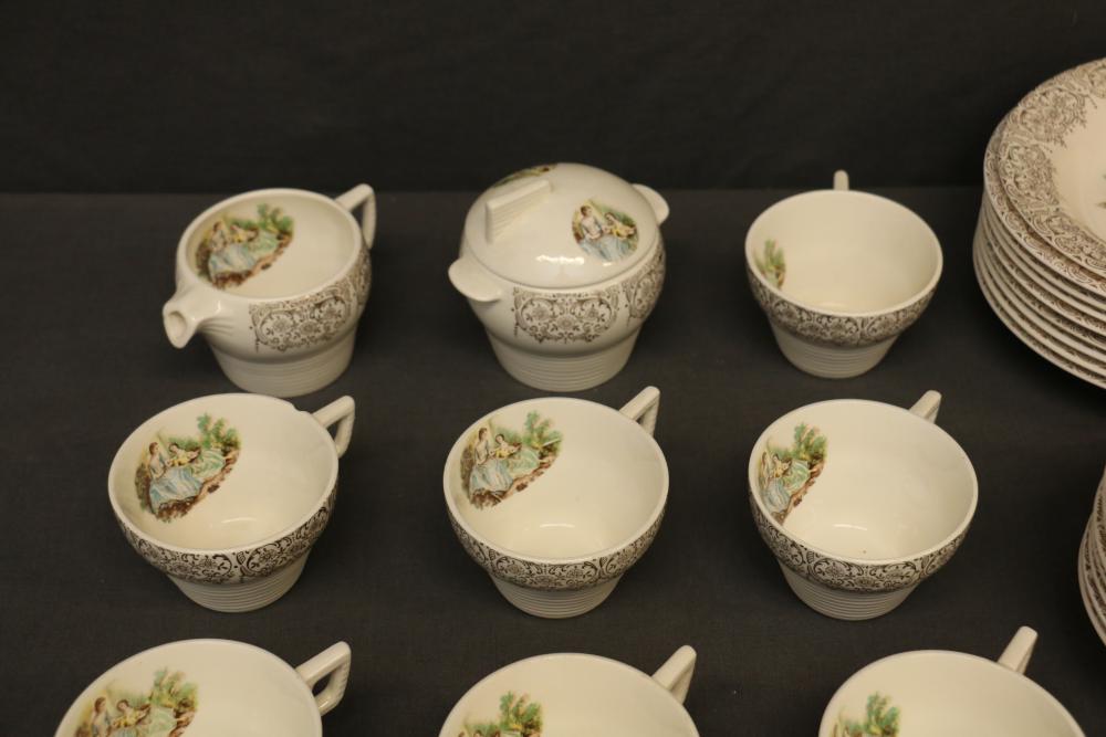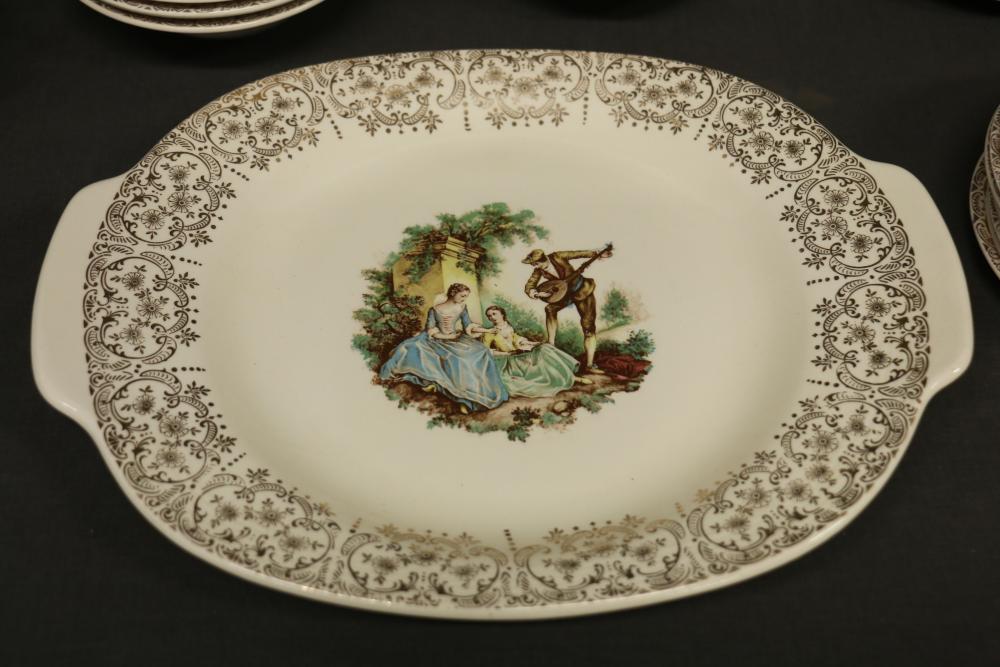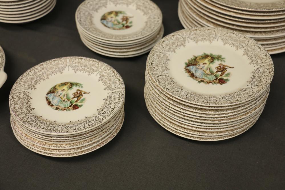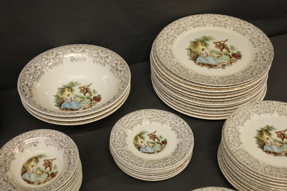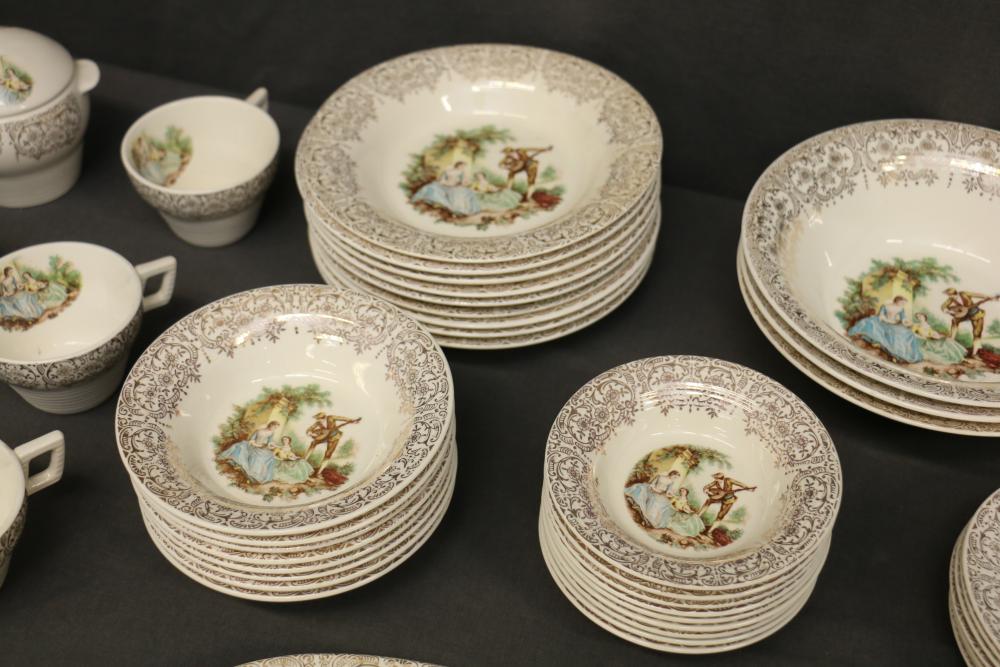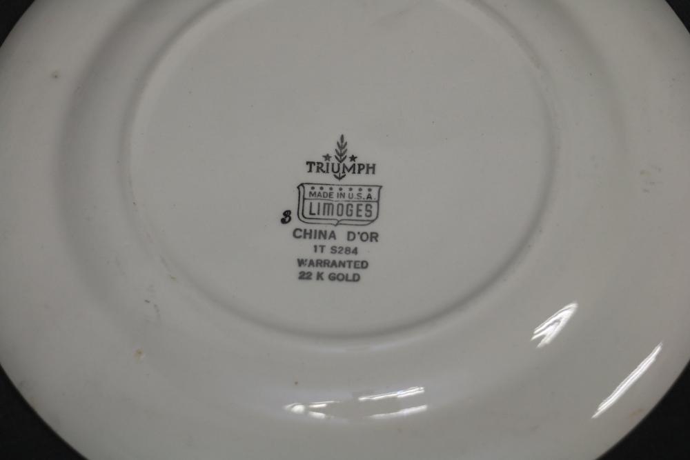 Triumph China D'Or Limoges Dinnerware Featuring Gold-Tone Accents. This dinnerware set includes various plates, bowls, cups, saucers, and a serving platter, each adorned with floral patterns and romantic artwork, complemented by gold-tone accents. Pickup only.