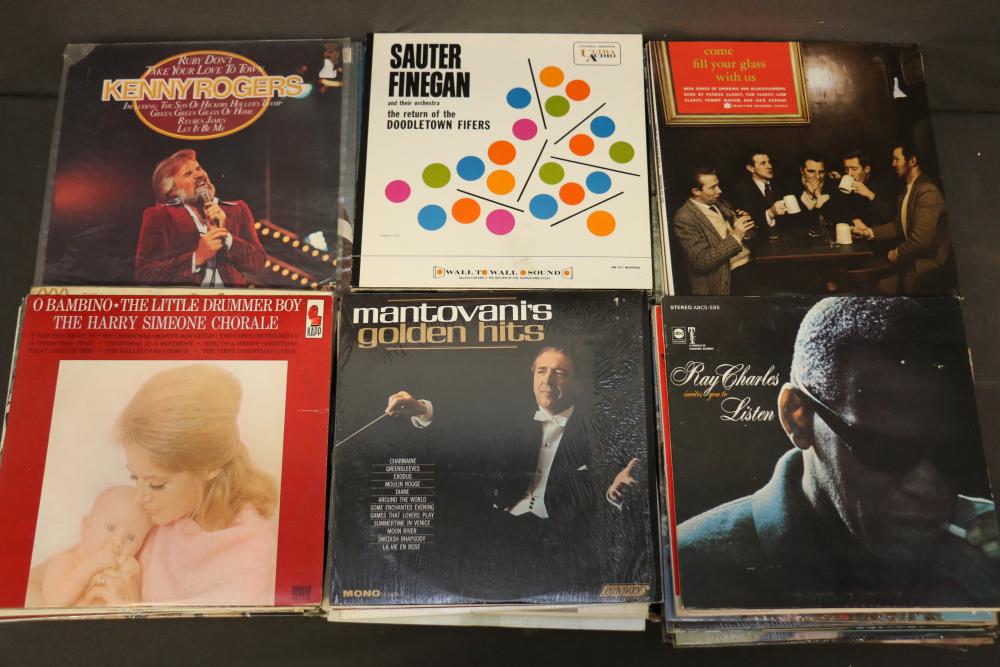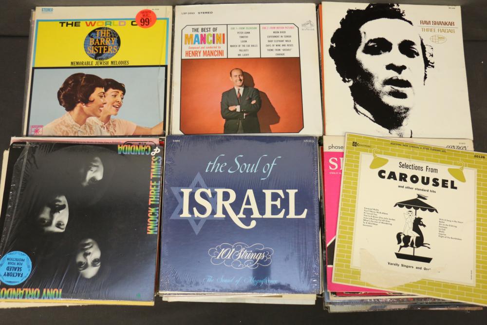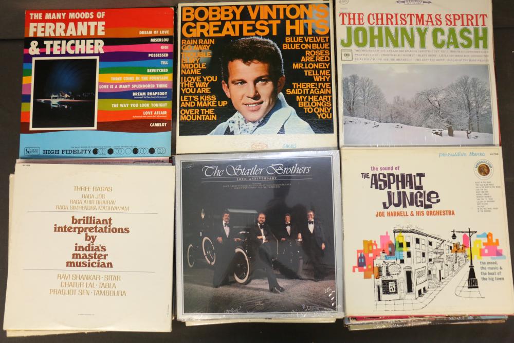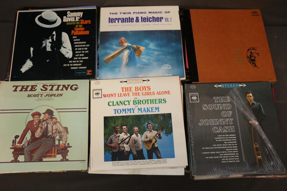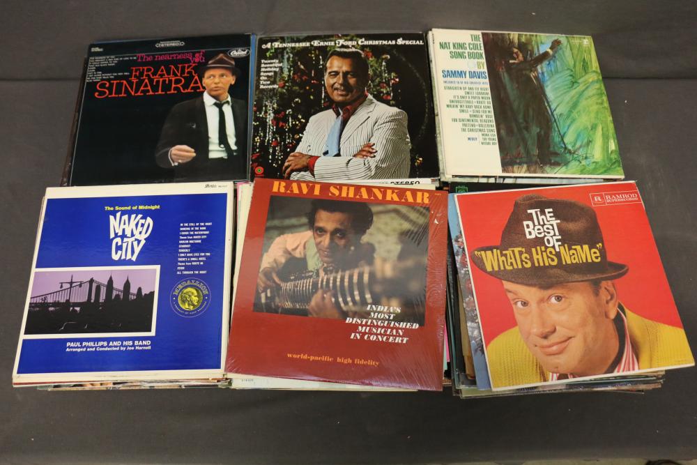 Vinyl Record Collection featuring titles like "Johnny Cash - Strawberry Cake," "Frank Sinatra - September of My Years," "Kenny Rogers - Greatest Hits," "Ravi Shankar - At Concert," and "The Sound of Johnny Cash." Includes genres spanning Christmas, Broadway, Country, Rock 'n Roll, and Classical music. Pickup only.
