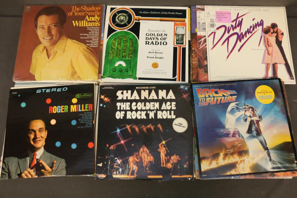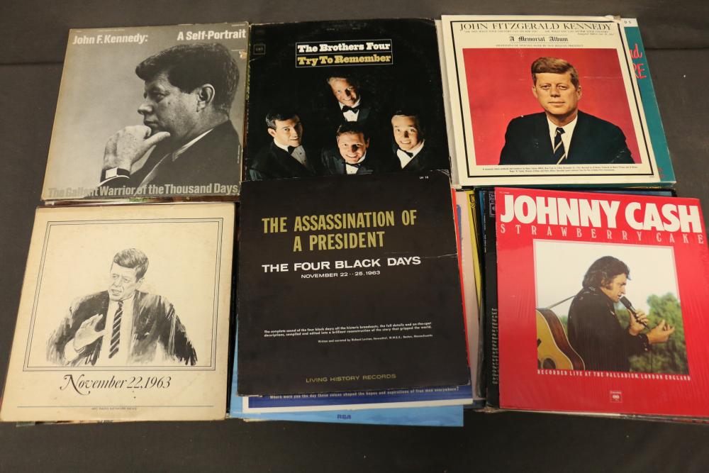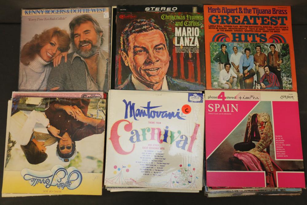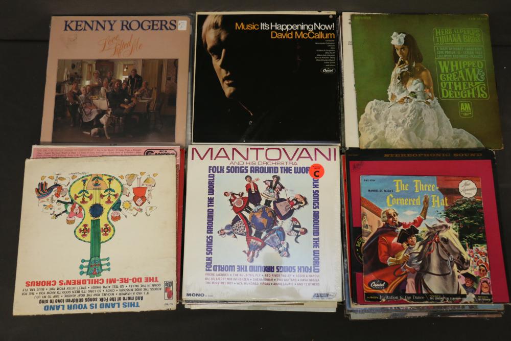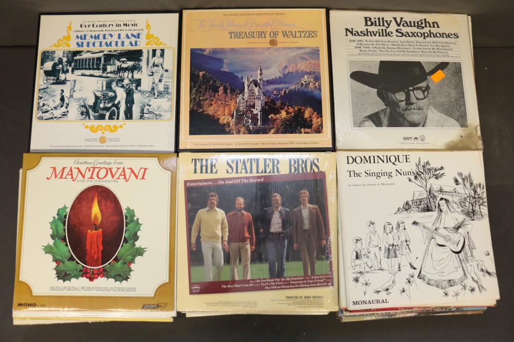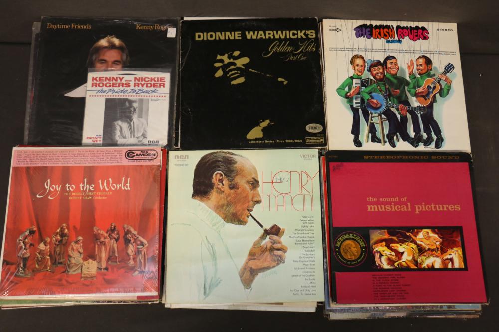 Vinyl Record Collection featuring titles like "Johnny Cash - Strawberry Cake," "Frank Sinatra - September of My Years," "Kenny Rogers - Greatest Hits," "Ravi Shankar - At Concert," and "The Sound of Johnny Cash." Includes genres spanning Christmas, Broadway, Country, Rock 'n Roll, and Classical music. Pickup only.