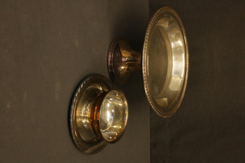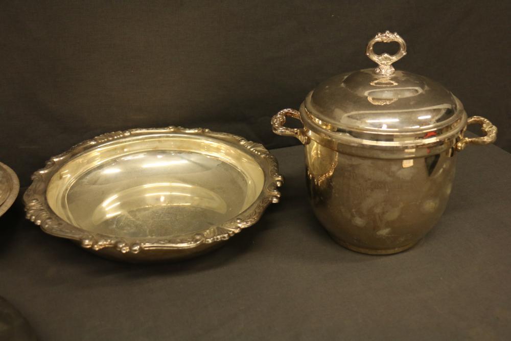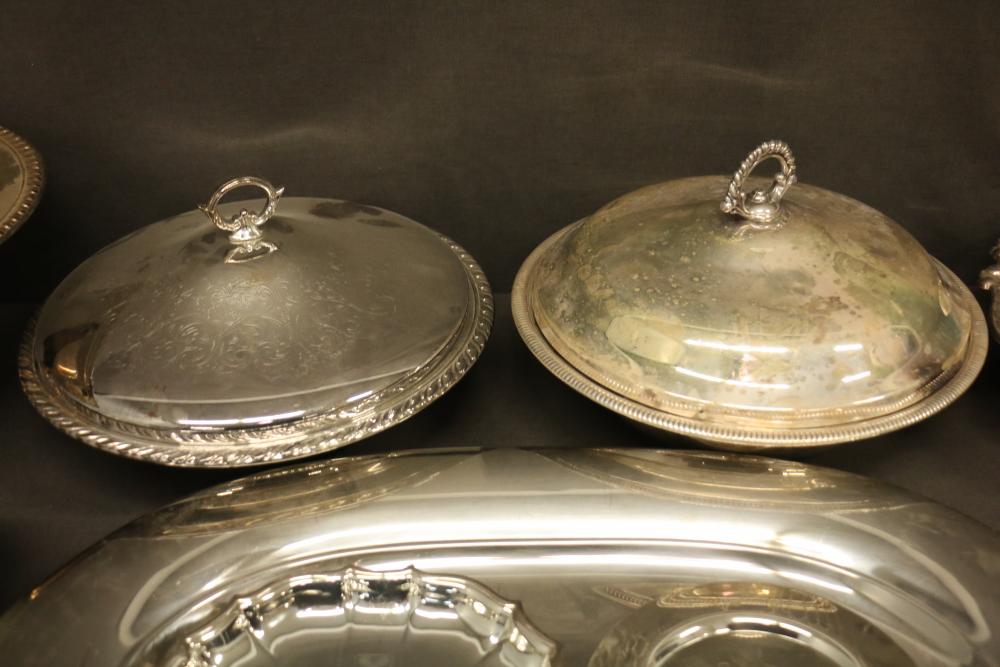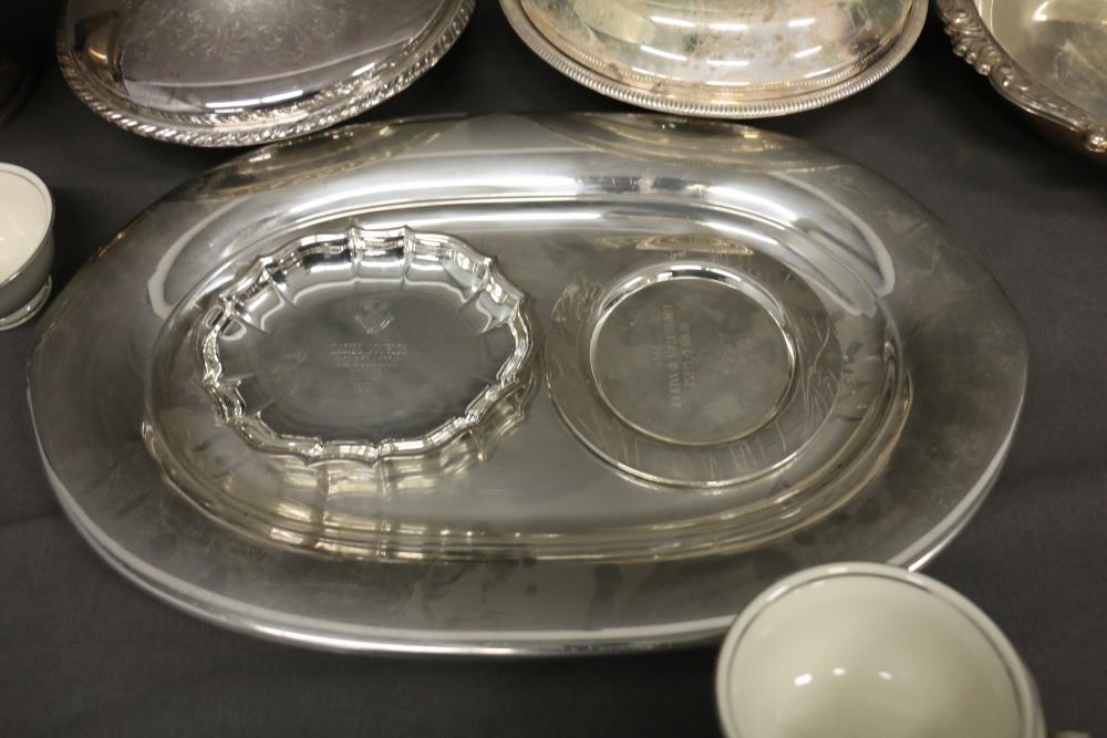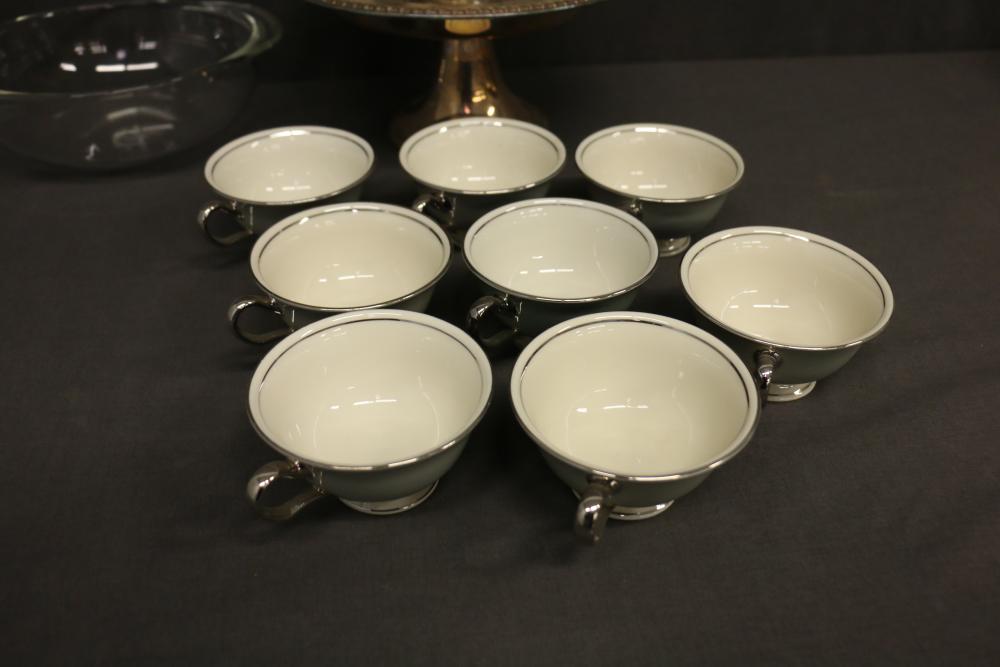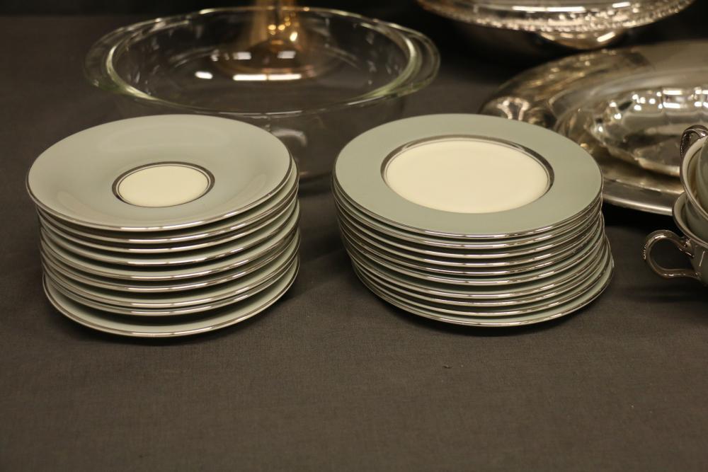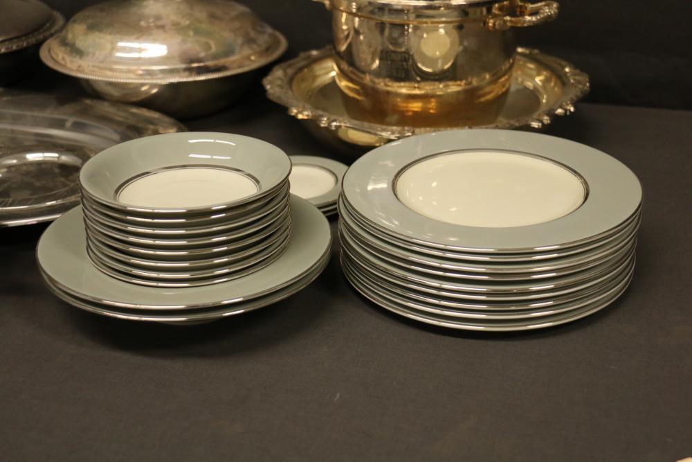 Silver-Tone Tableware and Porcelain Dinnerware Set. Includes an assortment of silver-tone serving pieces with decorative details and a porcelain dinnerware set featuring a gray and white color scheme with metallic trim. The dinnerware includes plates, saucers, and cups. Pickup only.