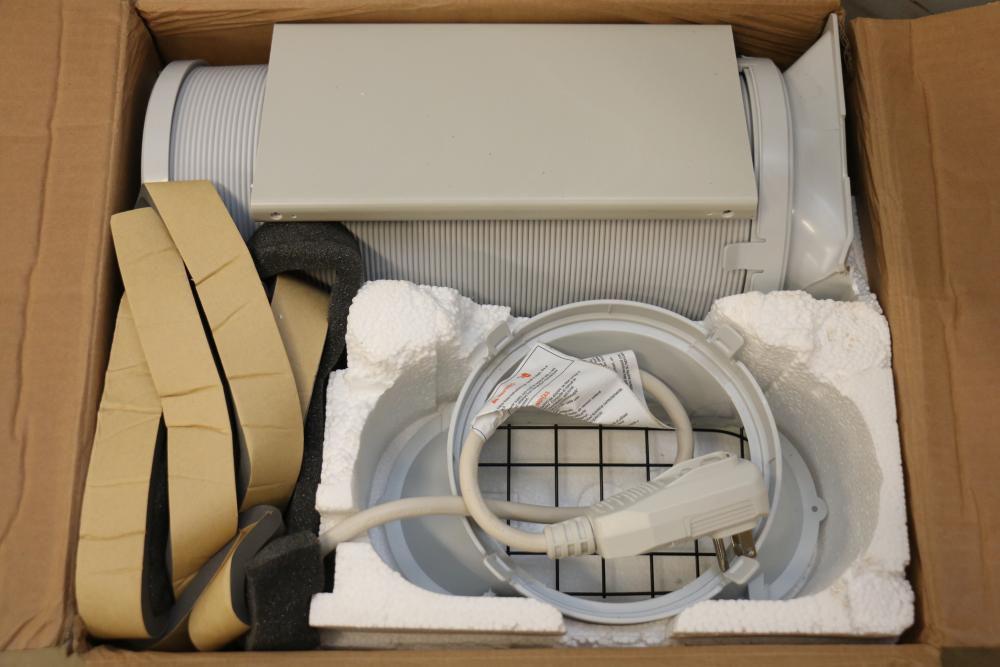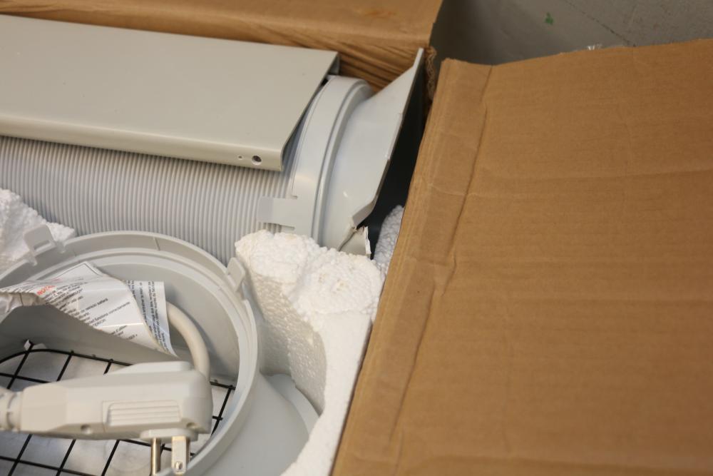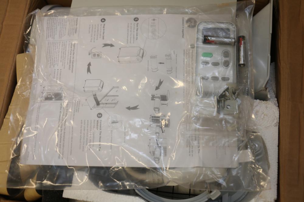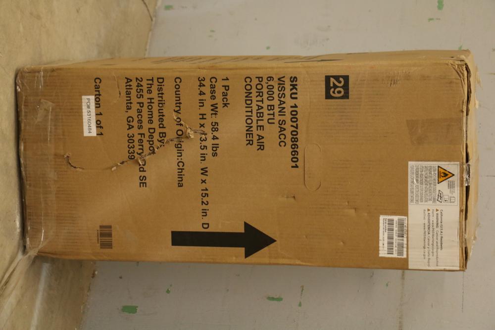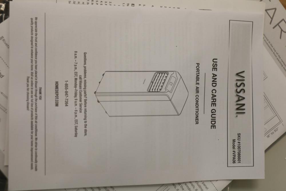 Vissani 6,000 BTU Portable Air Conditioner with Accessories. Model SKU 1007086601. Unit comes in original packaging, including use and care guide, hoses, remote control, and additional components as shown. Window vent has minor damage. Pickup only.
