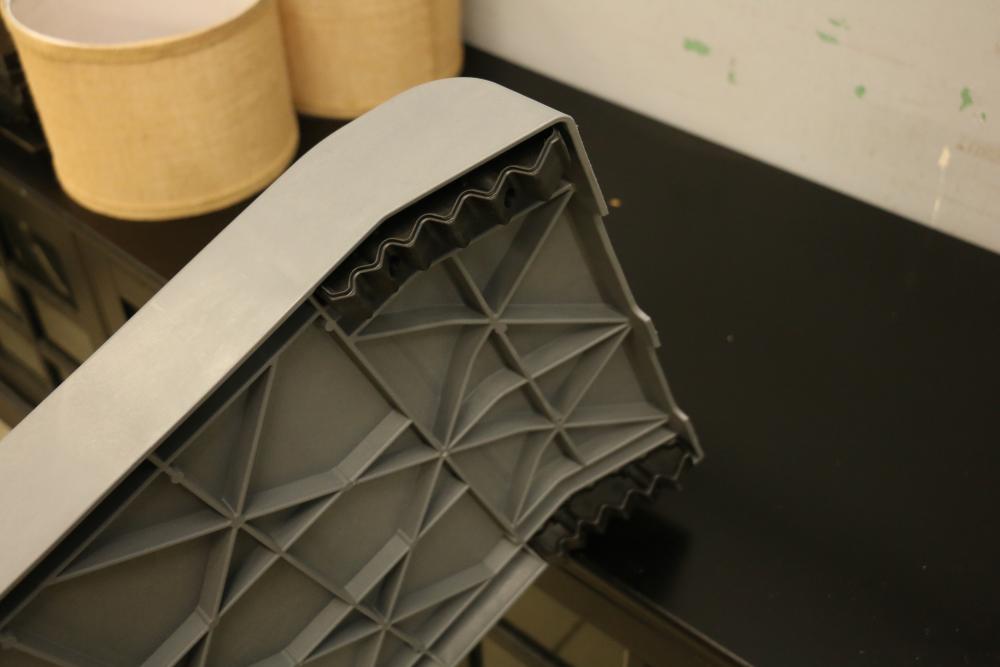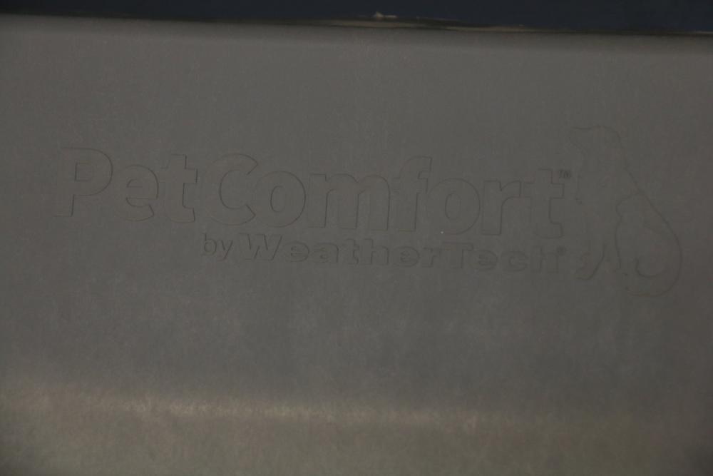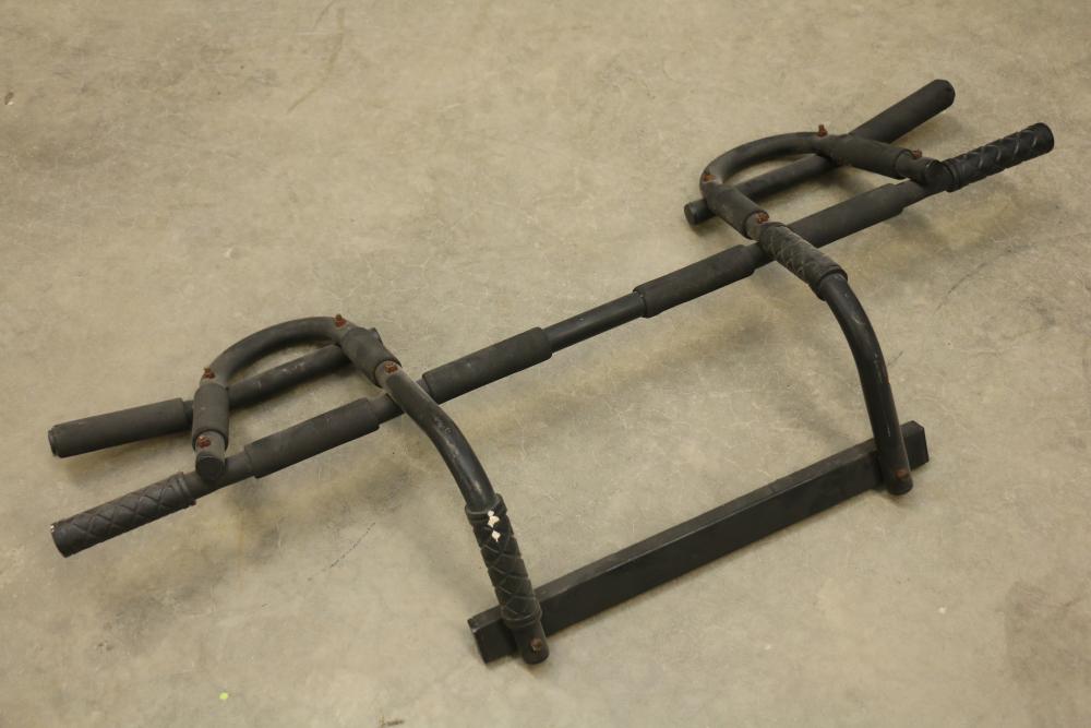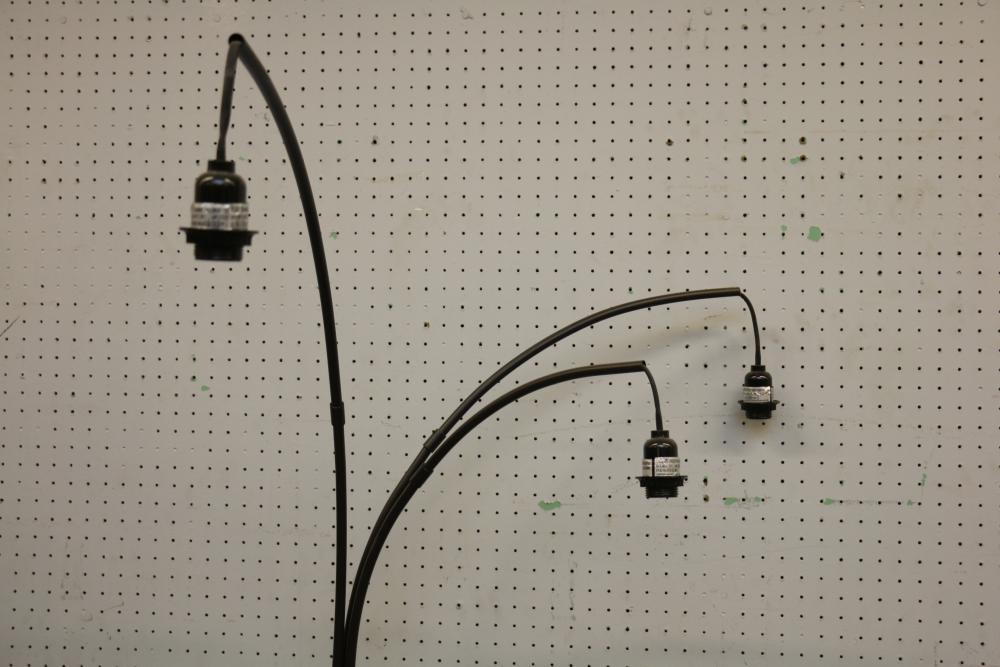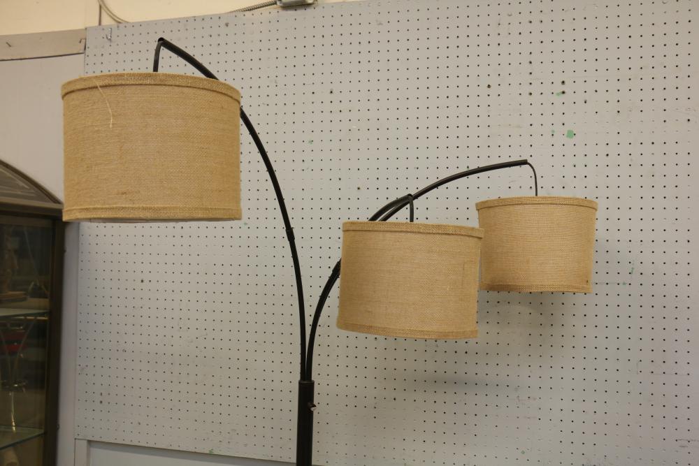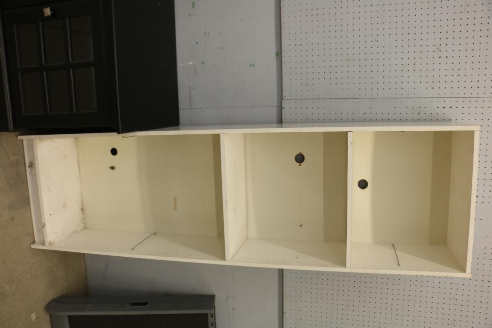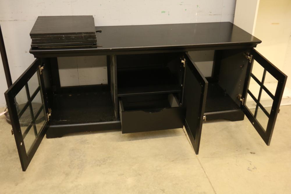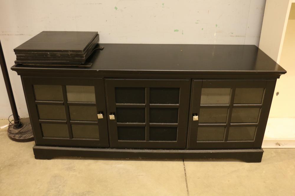Floor lamp with three adjustable arms and fabric shades, black cabinet with three compartments including two glass paneled cabinets and a center drawer, white three-shelf unit, PetComfort gray ramp, and a black pull-up bar. Includes shelf pegs. (Cabinet: 26"H x 61"L x 20.5"W) Pickup only.