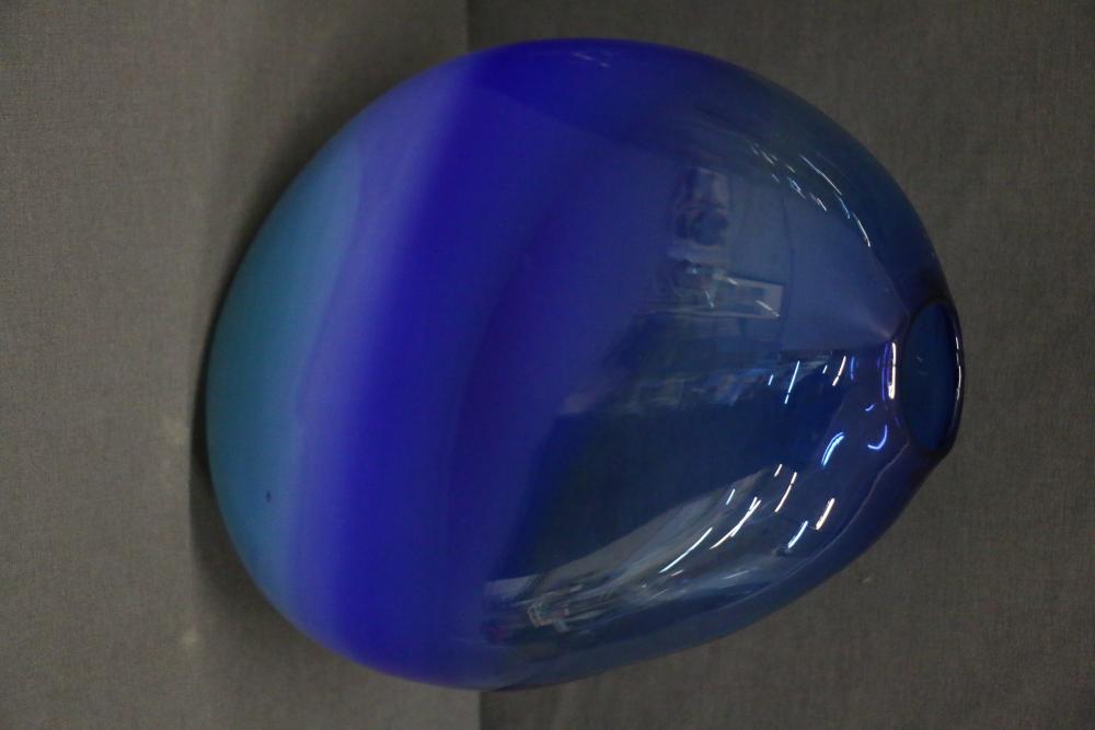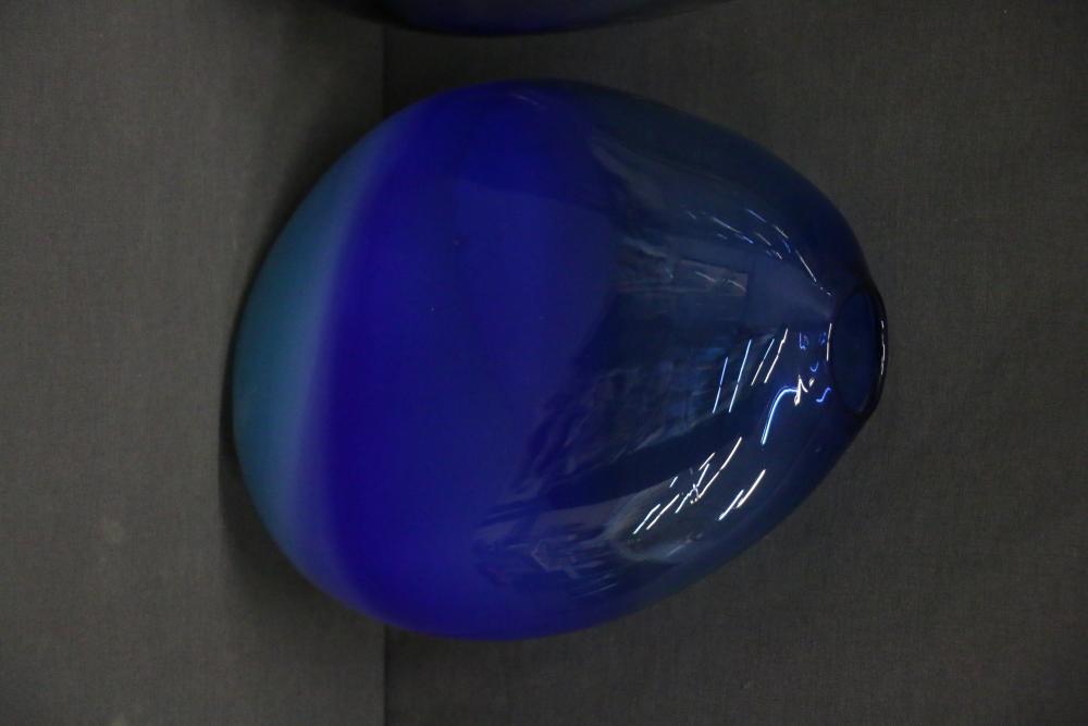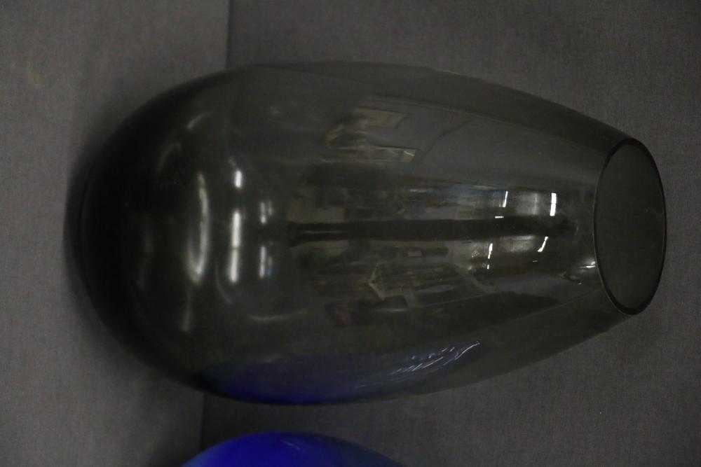 Two Decorative Glass Vases, Blue and Smoky Gray. One vase features a gradient blue design transitioning into a lighter tone, while the other is a smoky gray tone. These vases are made of glass and exhibit a smooth, rounded structure. Pickup only.