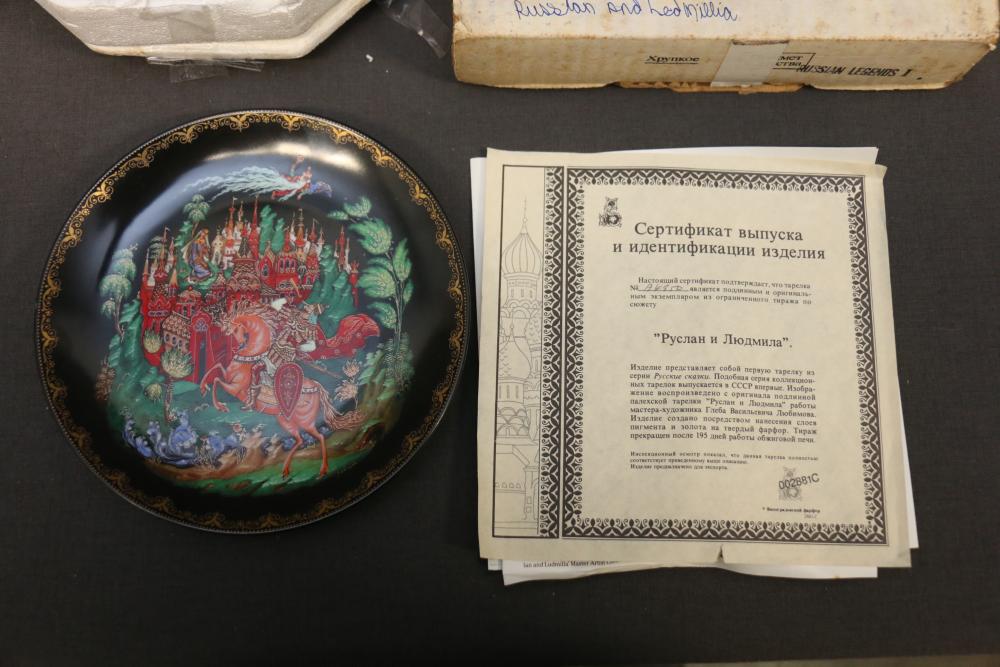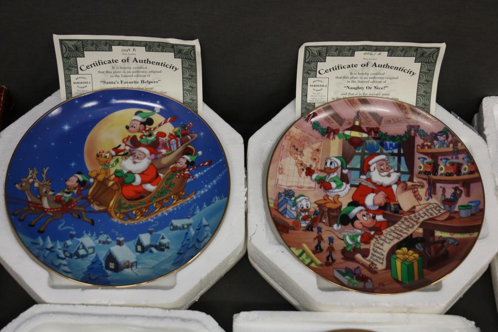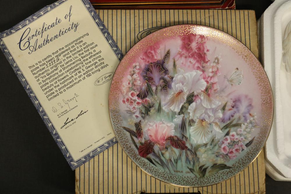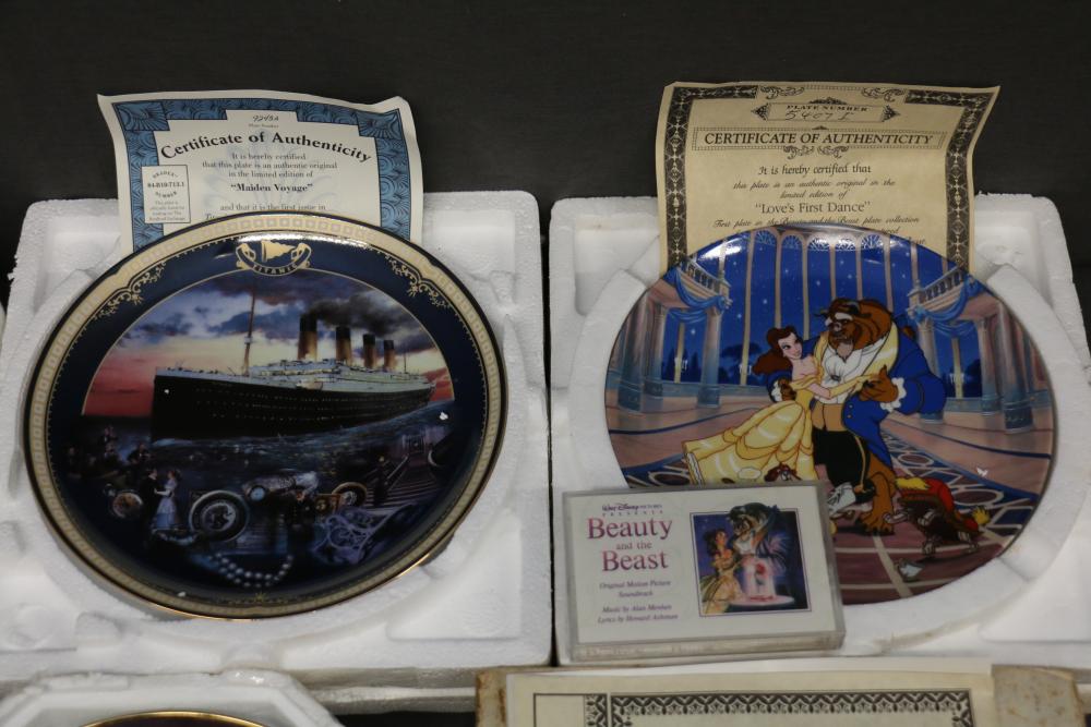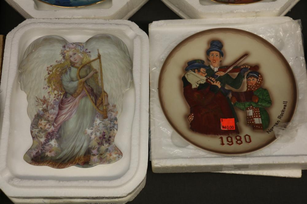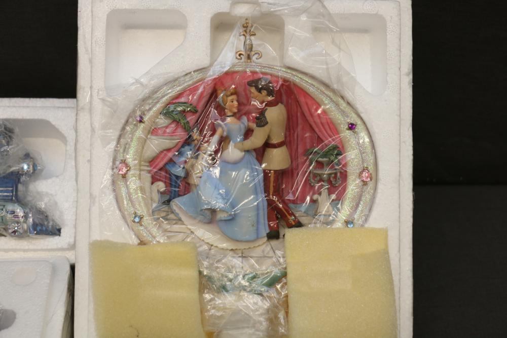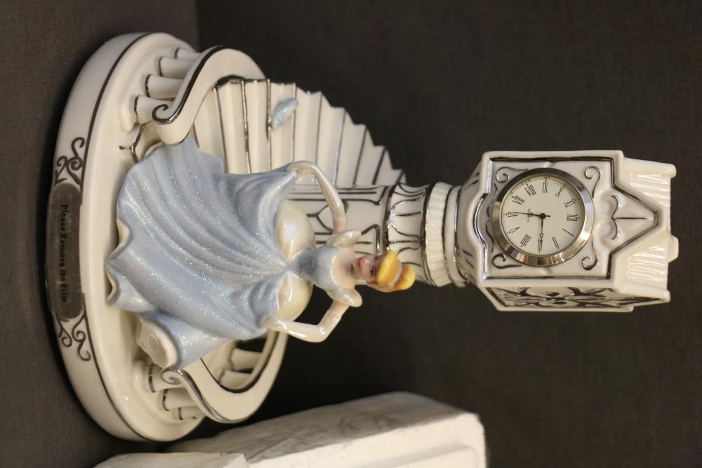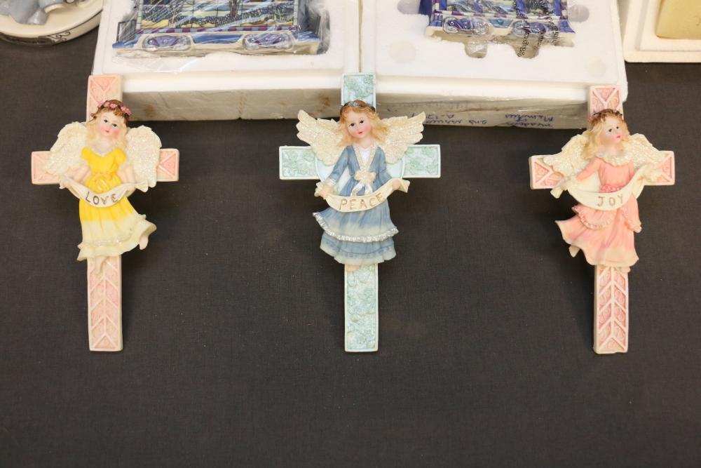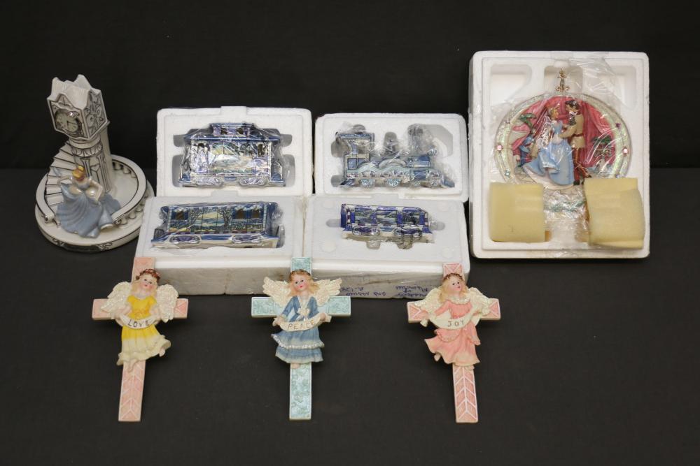Decorative Plates, Figures, and Wall Crosses. Includes collectible plates with accompanying certificates, glass decor items, Cinderella-themed ceramic figures, a clock figurine, and angel-themed wall crosses. Pickup only.