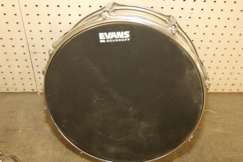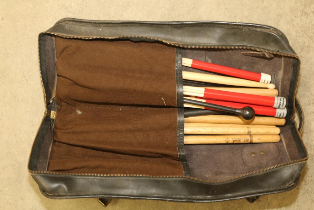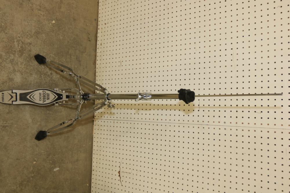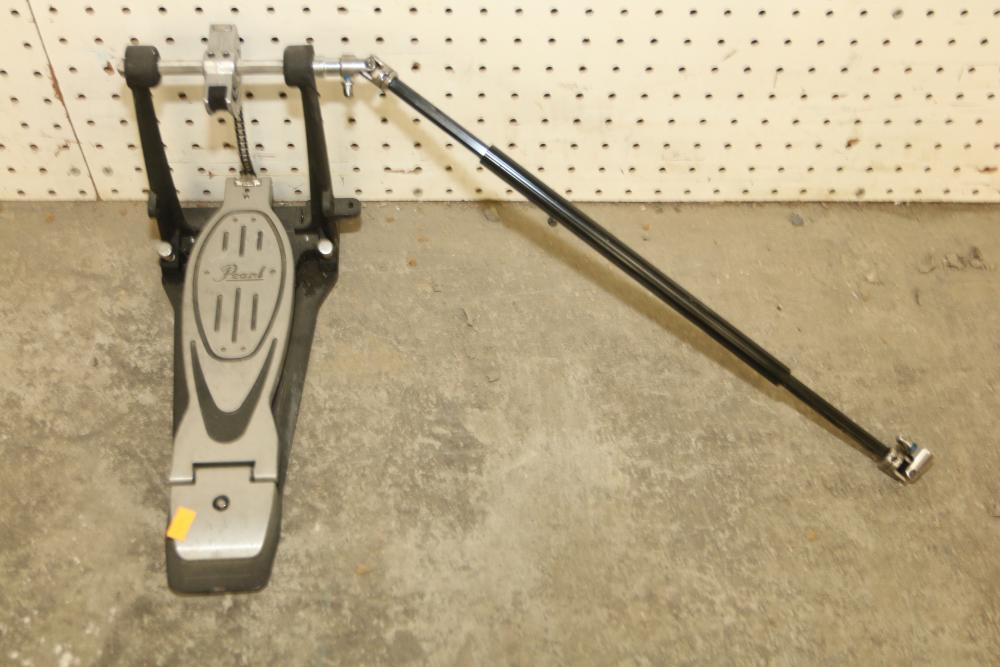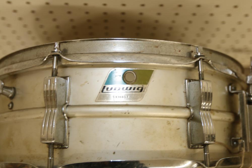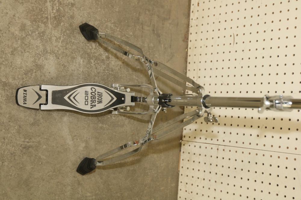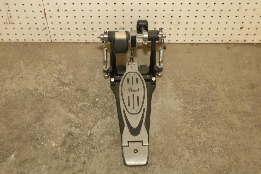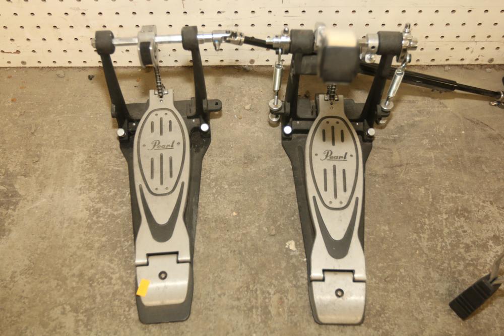Pearl P-902 Power Shifter Double Bass Drum Pedal, Tama Iron Cobra 200 Series Hi-Hat Stand, 14-inch Ludwig Snare Drum with an Evans 14-inch drum head, and drumsticks stored in a dedicated zippered case. Functional and ready for use. Pickup only.