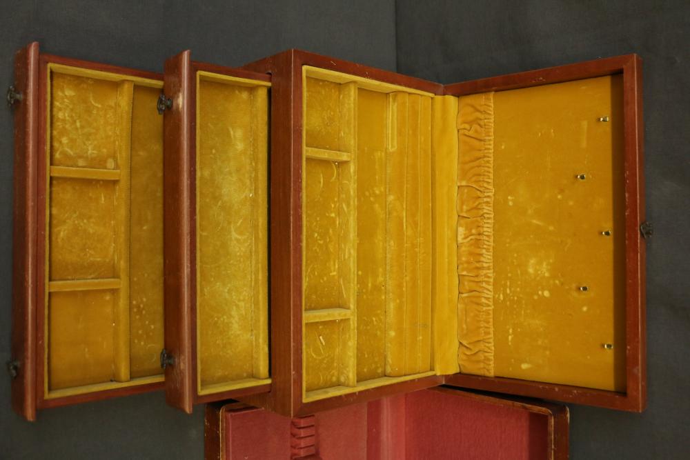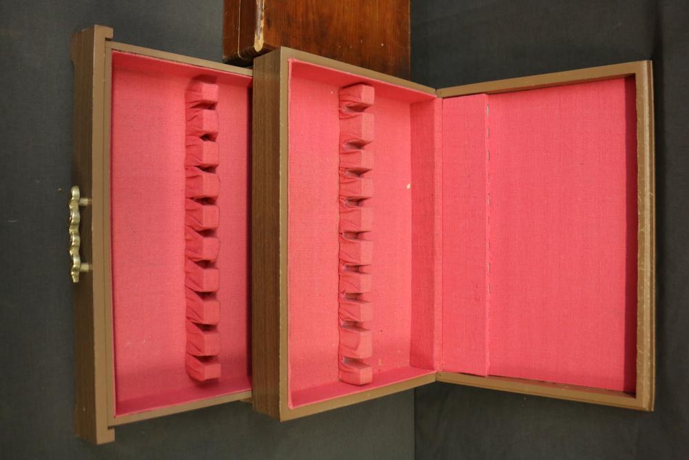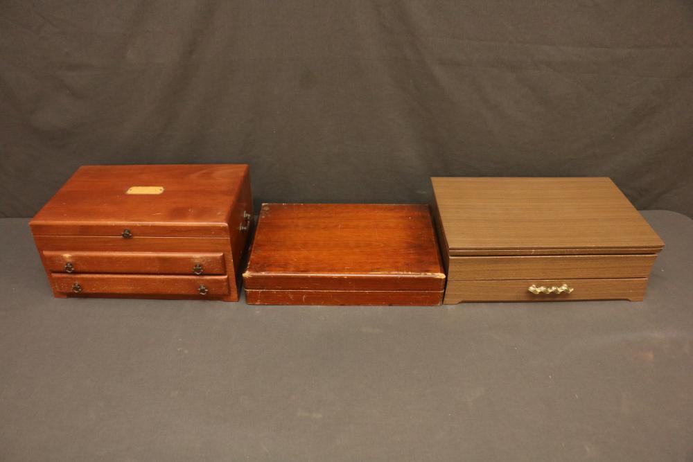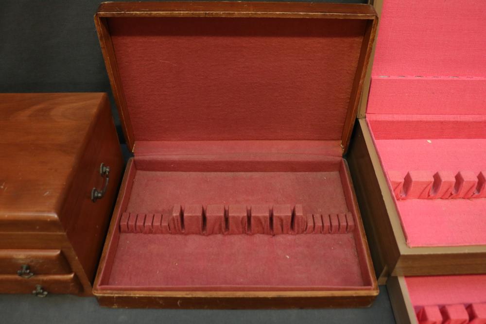 Three Wooden Silverware Storage Boxes with Drawers and Compartments. Includes one box with yellow fabric interior and two drawers, one with red fabric and slotted compartments, and one with red fabric interior and two drawers. Each box features different internal compartments for organizational purposes. Pickup only.
