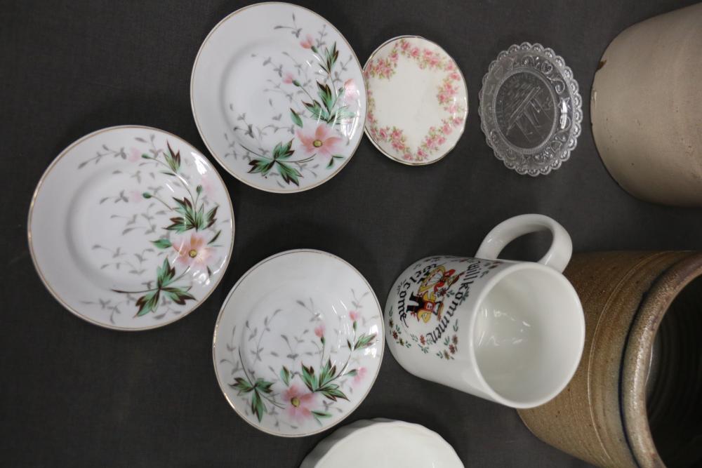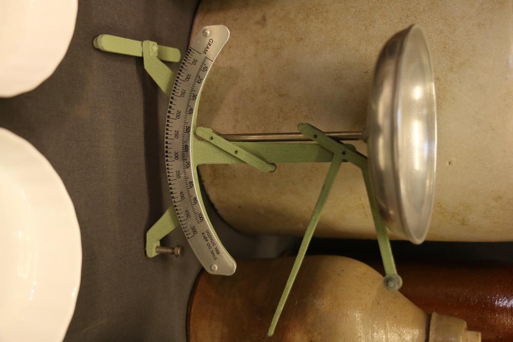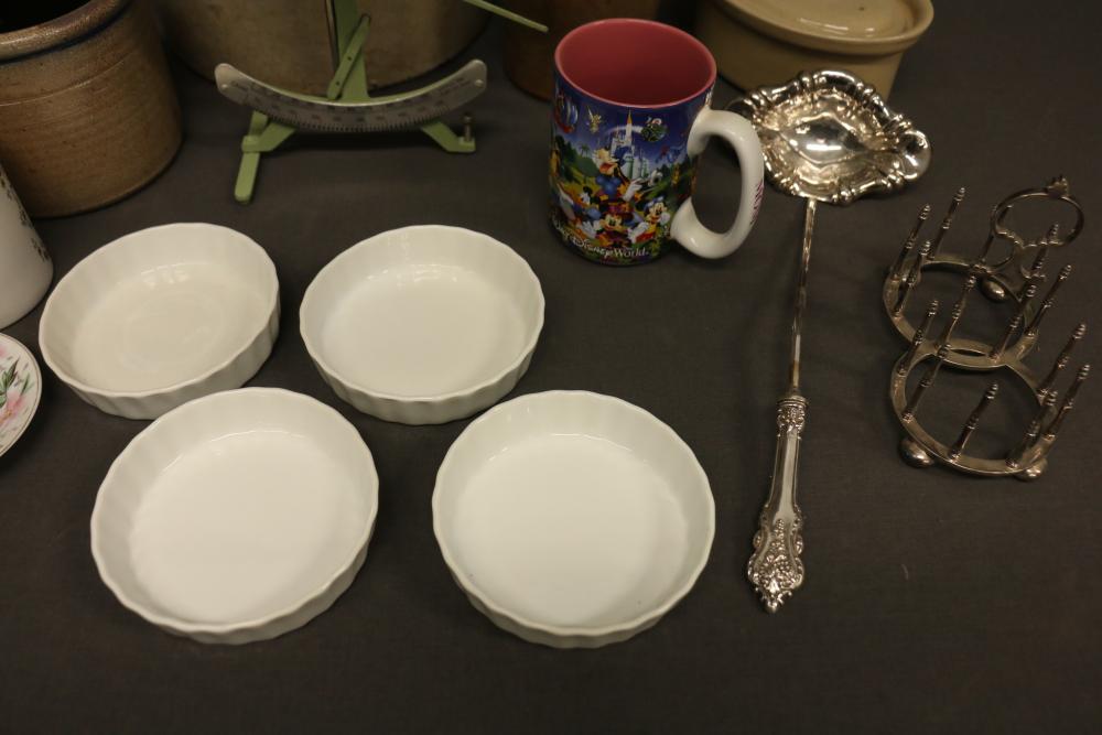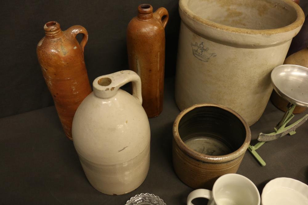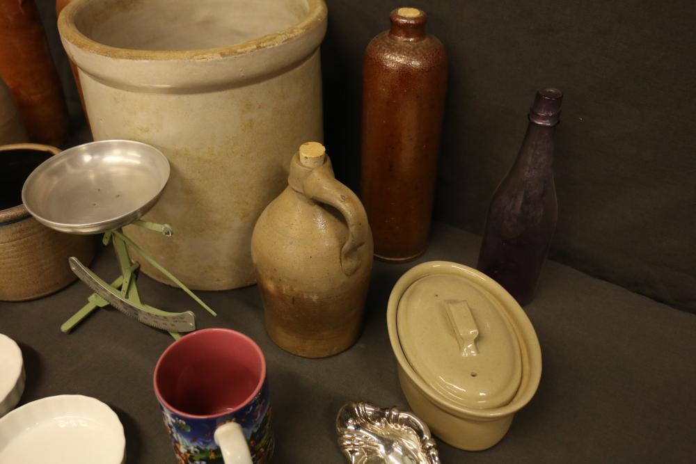 Household Items Including Scale, Crocks, and Cups. Includes a green balance scale with a metal dish and measurement markings, multiple pottery crocks and jugs of various colors and designs, tea cups and saucers with floral patterns, a silver-tone ladle marked "Sterling" on the handle, a silver-tone egg holder, and additional ceramic and glass items. Pickup only.