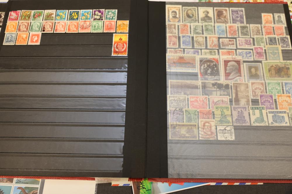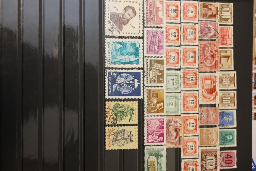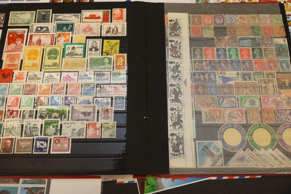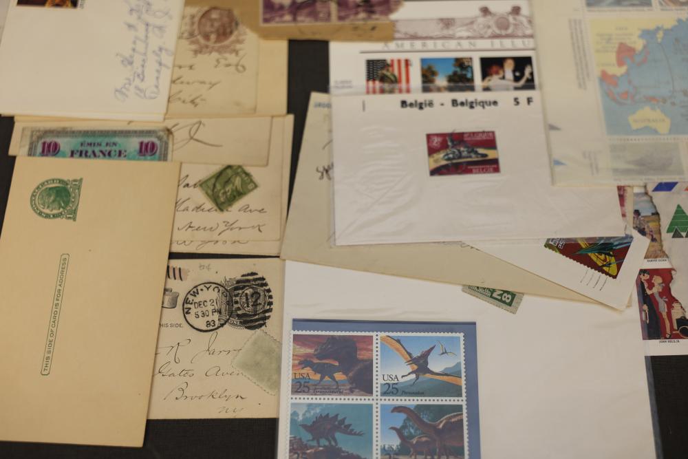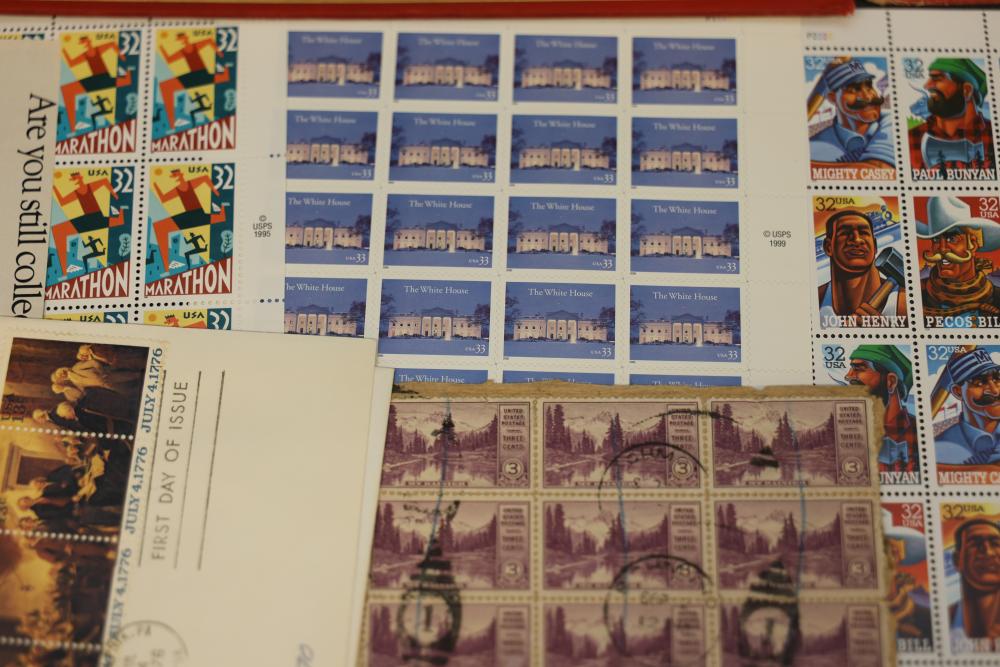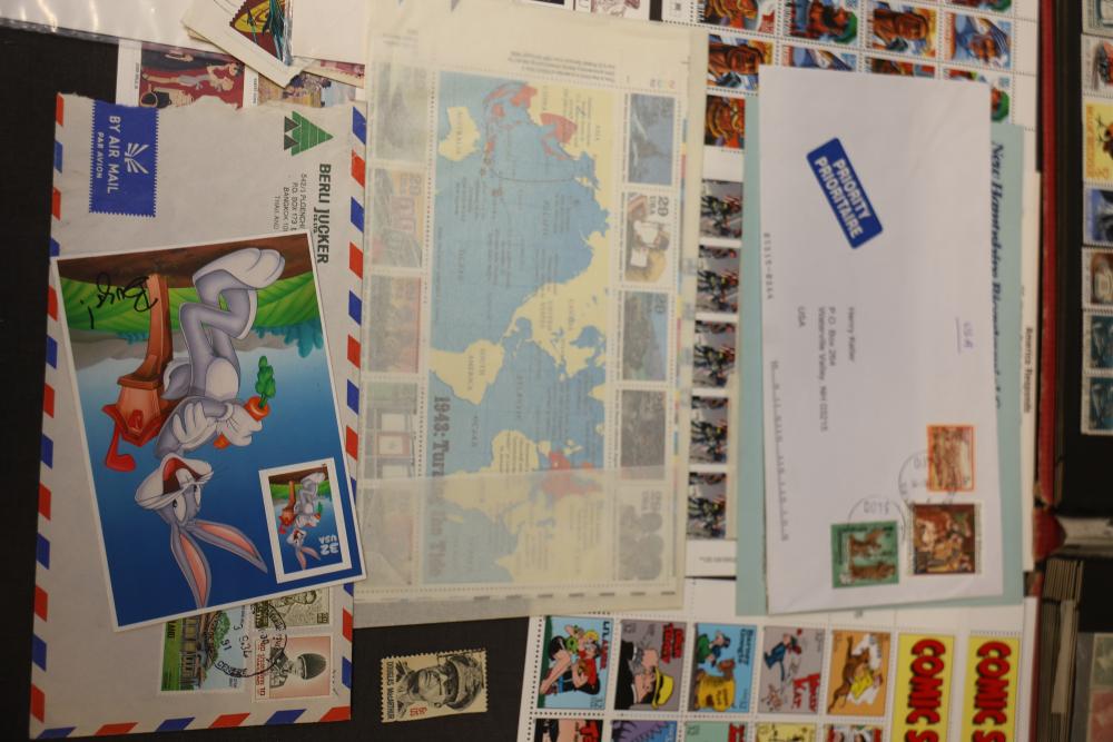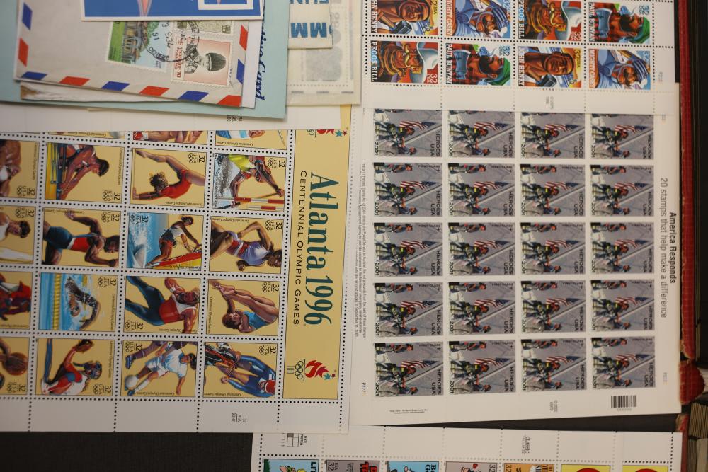 Extensive Assortment of Worldwide Stamps Including Sheets and Covers. Includes commemorative issues, historic stamps, canceled examples, first-day covers, and various envelopes. Features U.S. topics such as Black Heritage, Olympic Games, and Comic Strip Classics alongside European and other global stamps. Pickup only.