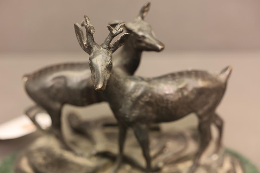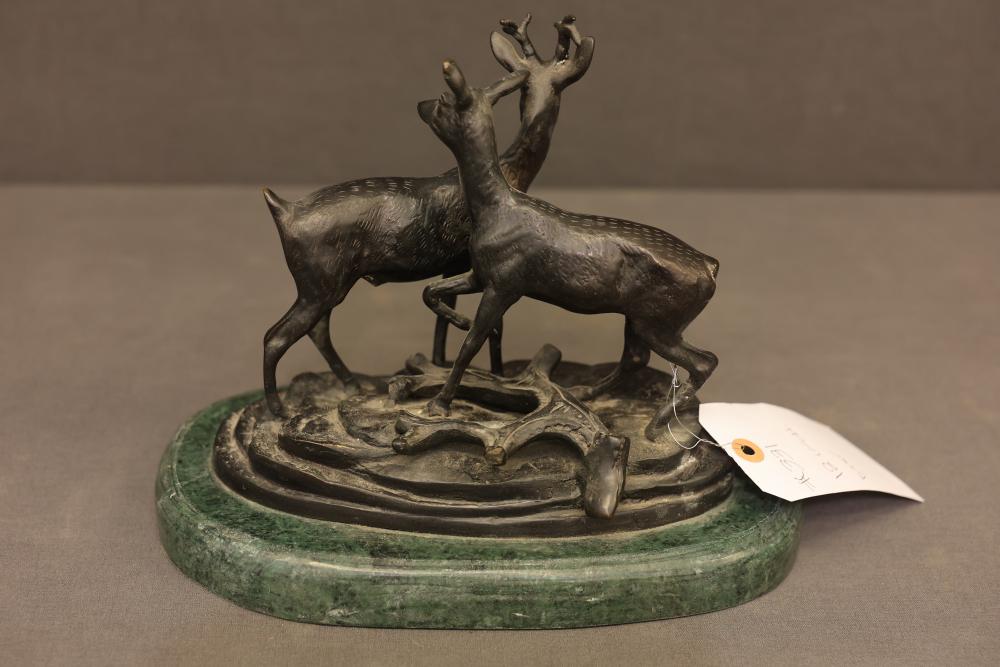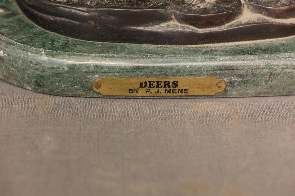Metal Sculpture of Deer on Green Marble Base. Features two deer standing with an antler at their feet, mounted on an oval green marble base. A nameplate reading "Deers by P.J. Mene" is affixed to the base. Pickup only.