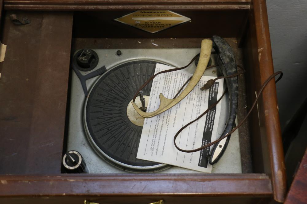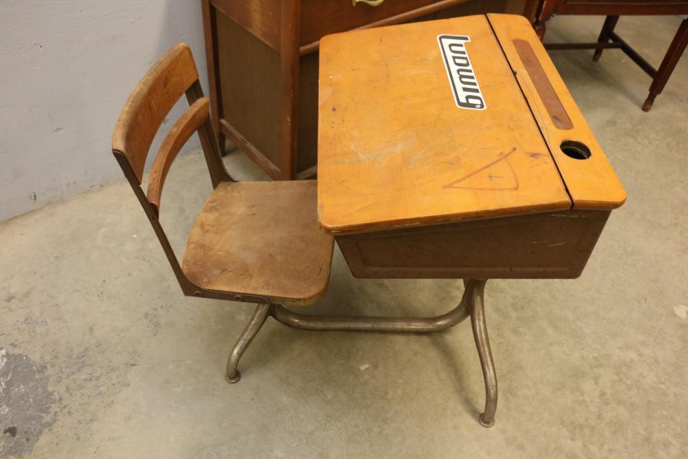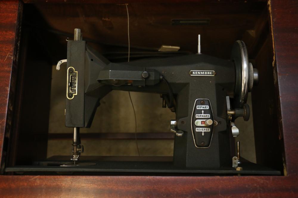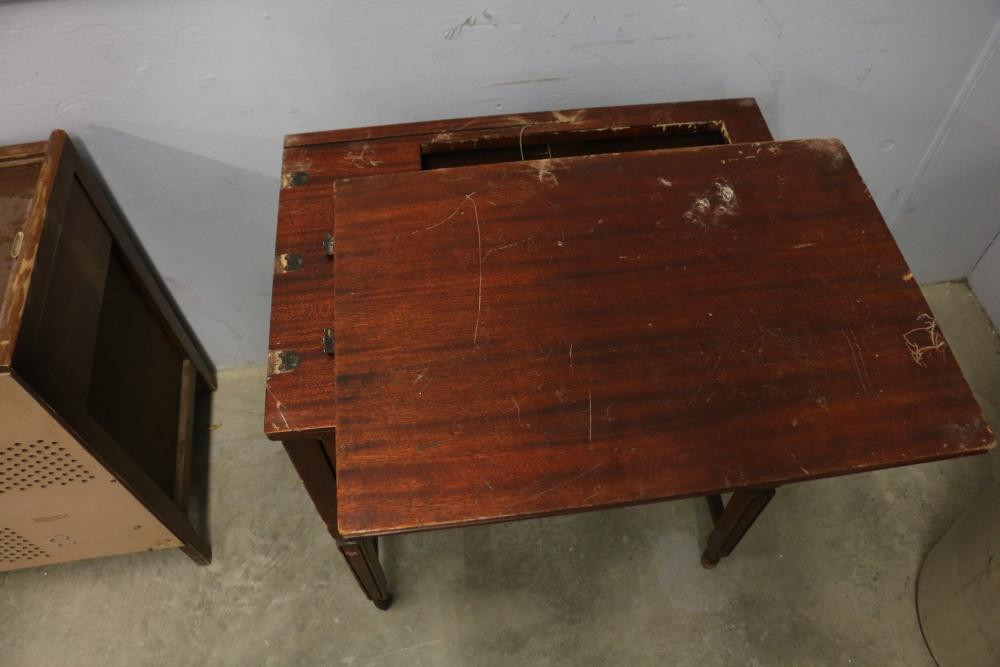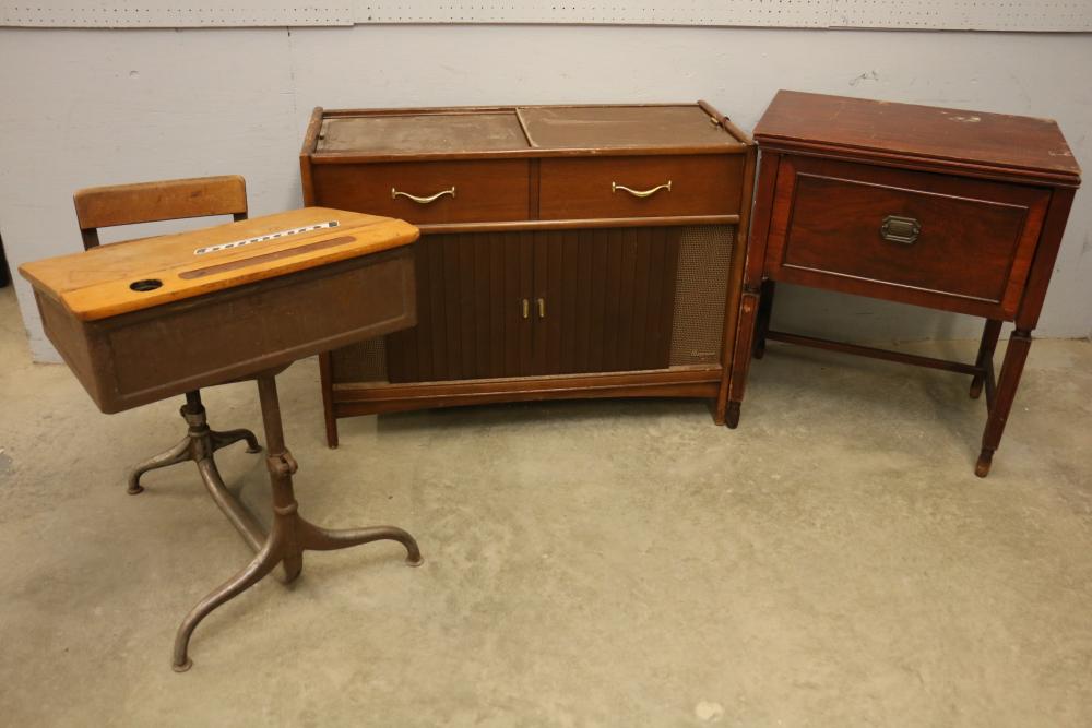 Furniture and Equipment Including Kenmore Sewing Machine, Ludwig School Desk, and Magnavox Record Player. This group includes a Kenmore sewing machine with a wooden cabinet, a Ludwig school desk and chair, a Magnavox record player, and additional storage furniture. Functionality of electric items is unknown. Largest item being (29.5"H x 40"L x 16.75"W) Pickup only.