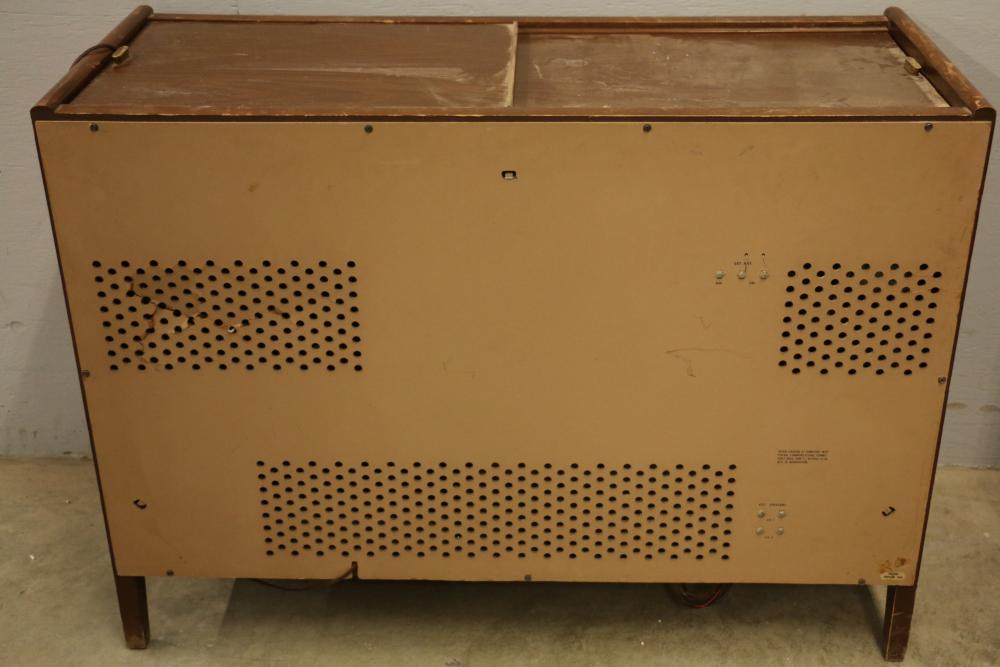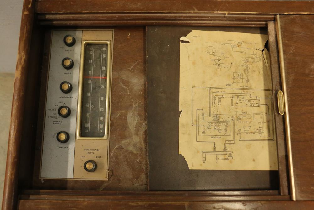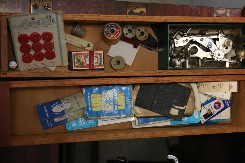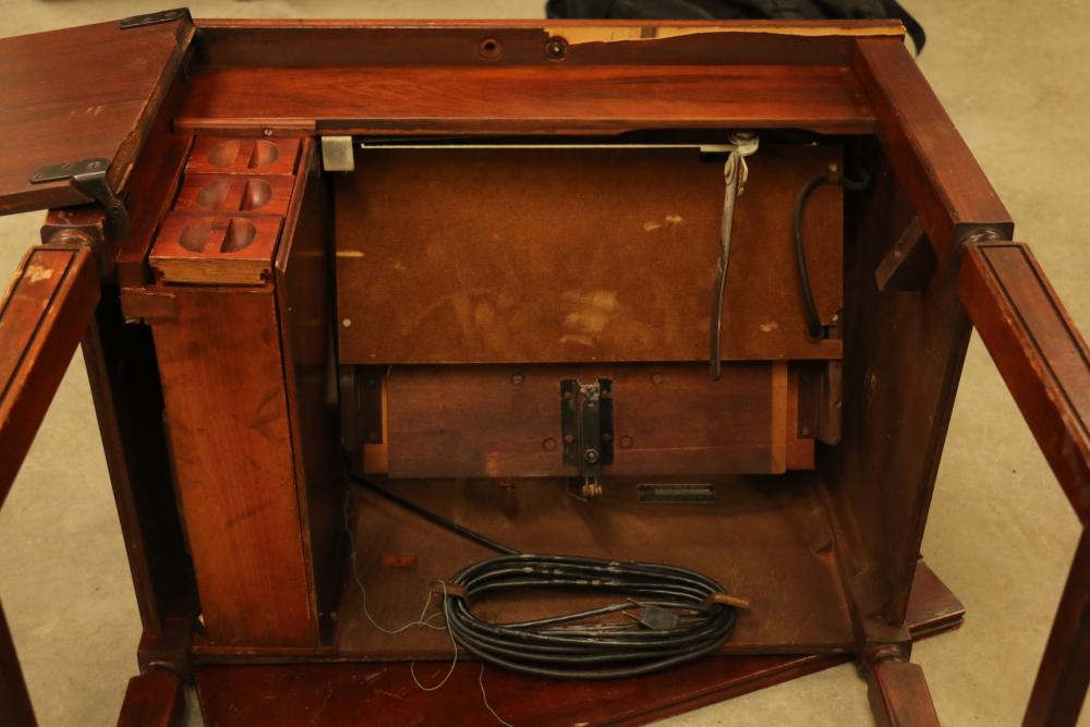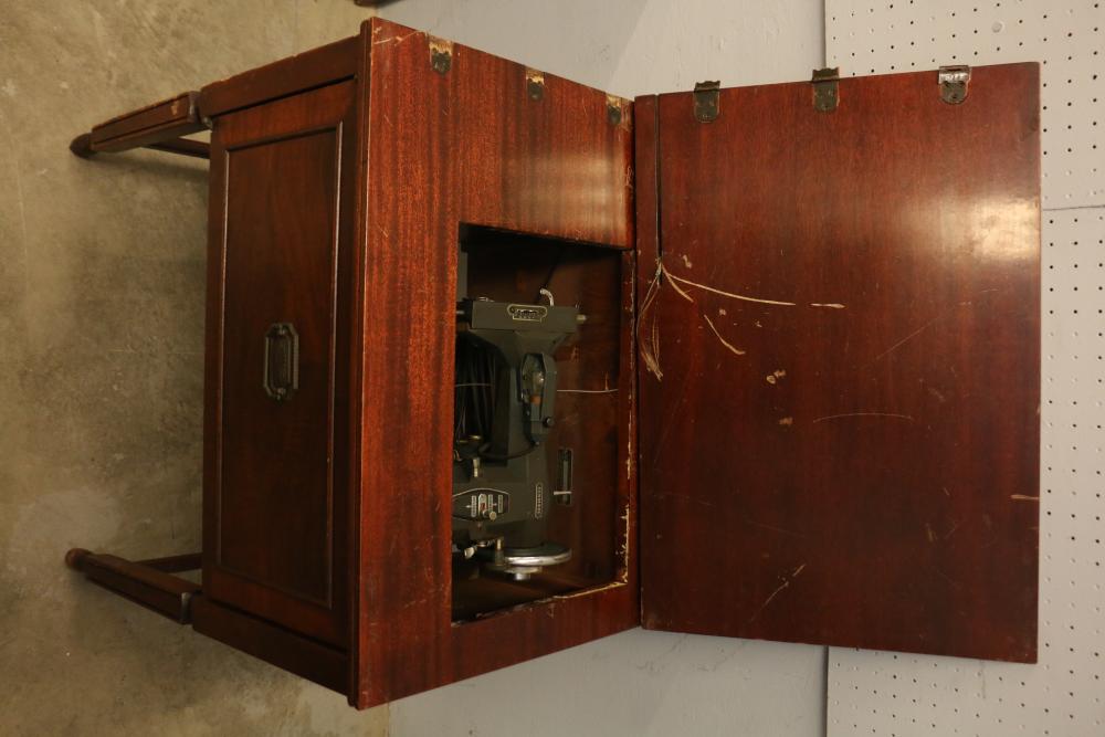 Furniture and Equipment Including Kenmore Sewing Machine, Ludwig School Desk, and Magnavox Record Player. This group includes a Kenmore sewing machine with a wooden cabinet, a Ludwig school desk and chair, a Magnavox record player, and additional storage furniture. Functionality of electric items is unknown. Largest item being (29.5"H x 40"L x 16.75"W) Pickup only.