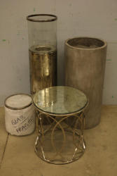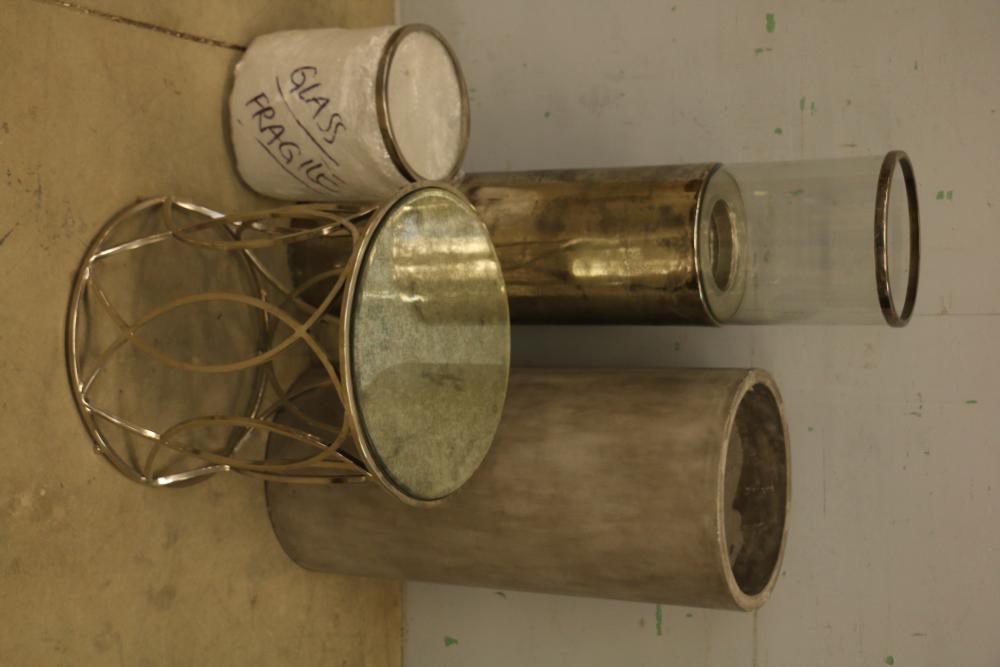 Decorative home items featuring an RH slate boat trough, a tall cement planter, a round side table with a glass top and metal frame, and a silver-tone stand with two glass shades. Pickup only.