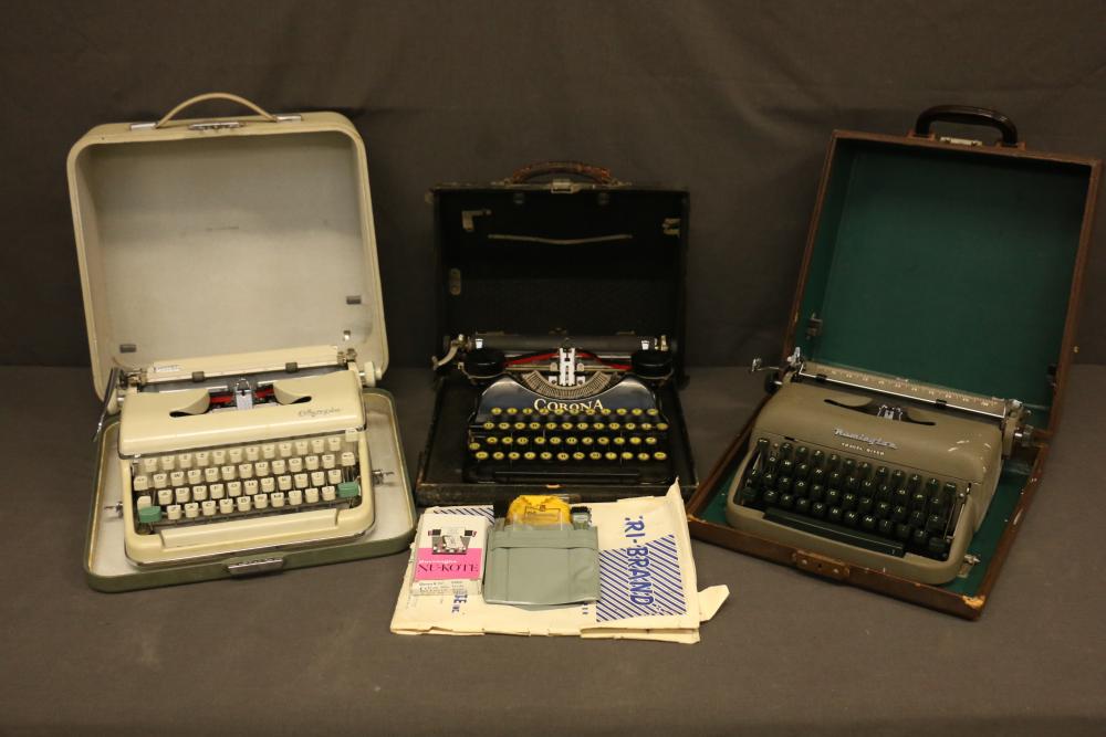Three Manual Typewriters with Cases and Accessories. Includes an Olympia typewriter in a light-colored case, a Corona black typewriter in a hard case, and a Remington Travel-Riter typewriter in a brown case. Accessories include a ribbon, a cleaning brush, and carbon paper. Pickup only.