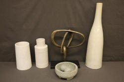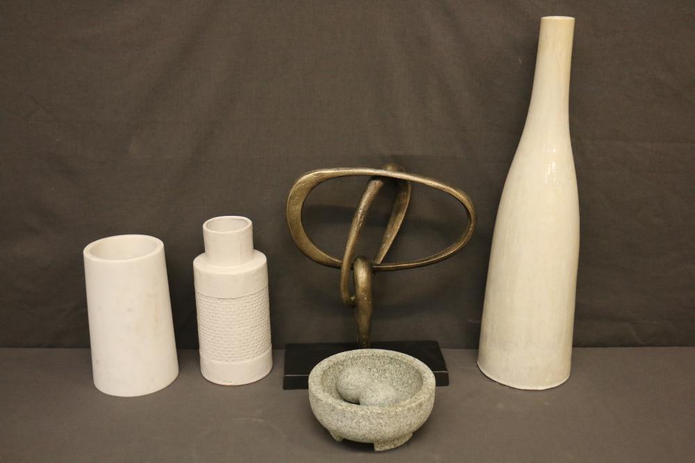Ceramic, Stone, and Metal Decorative Items. Includes ceramic vases, a stone mortar in the style of a molcajete with two rounded stones, and a metal sculpture with an abstract design on a black base. Pickup only.