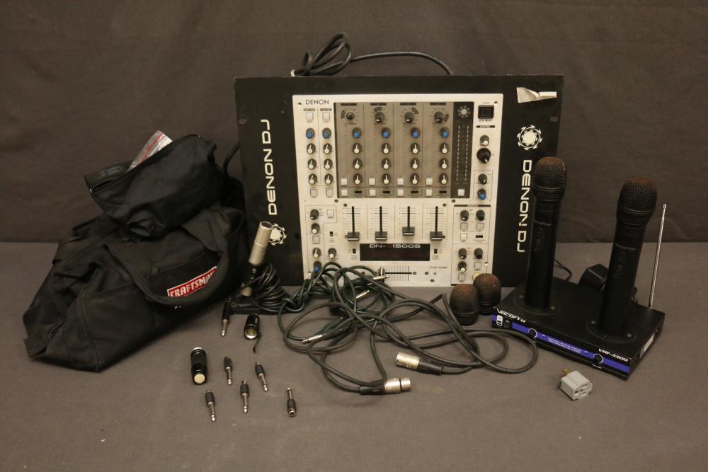 Denon DJ DN-X1500S Mixer with VocoPro VHF-3300 Microphone Set. DJ Mixer comes with faders, control knobs, input/output connections, and a power cable, designed for professional DJ settings with digital and analog input compatibility. The set also includes a VocoPro VHF-3300 Dual Channel VHF Rechargeable Wireless Microphone System featuring two handheld wireless microphones, and a vintage Panasonic WM-1240 wired microphone with a coiled cord and stand. A bag with cables and accessories, including XLR and power supply cables, is included. Channel 1 L-selector dial is broken. Pickup only.