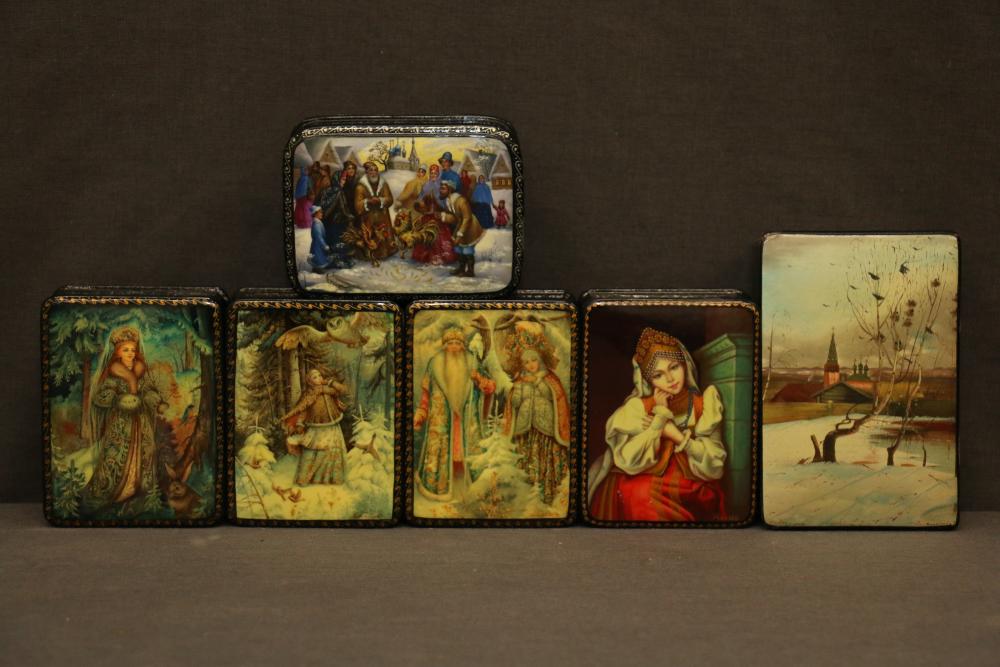 Six hand-painted lacquer boxes featuring intricate Folk Art scenes, including winter landscapes, figures in traditional attire, and festive gatherings. Each box showcases detailed artistry with fine patterns and shimmering accents. Pickup only.