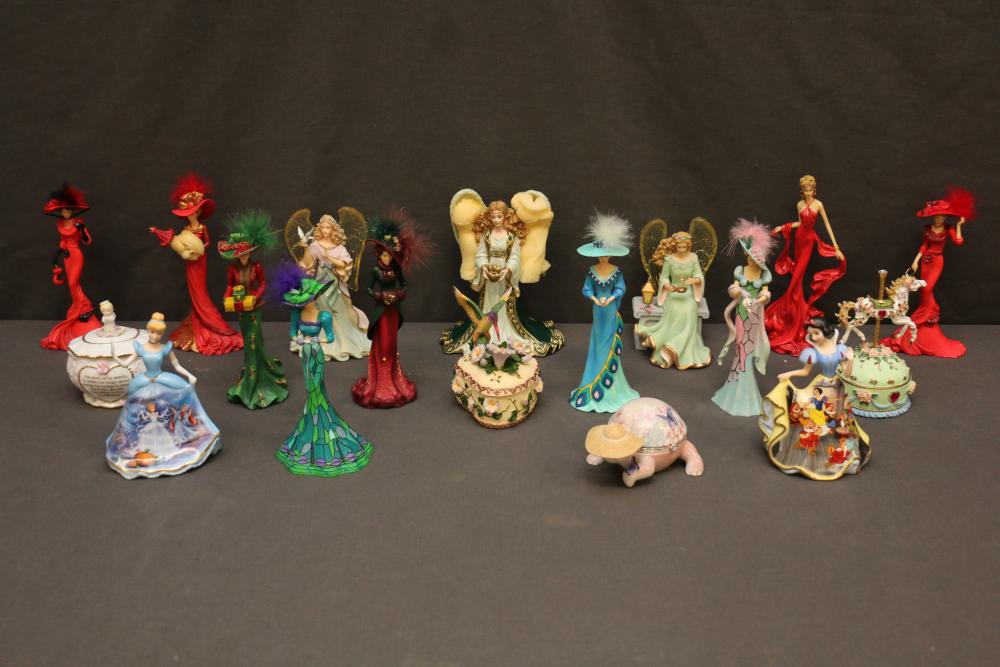 Hamilton Collection Angel Figurines and Disney Princess Porcelain Collectibles with titles including Delivering Gifts, A Timeless Pause with Coca-Cola, Companion Of Caring, Red At Heart, and Red Carpet Premier. Includes certificates of authenticity and protective cases. Figurines feature detailed designs with vibrant colors and delicate accents. Pickup only.