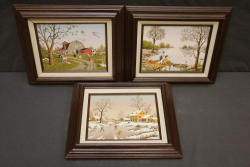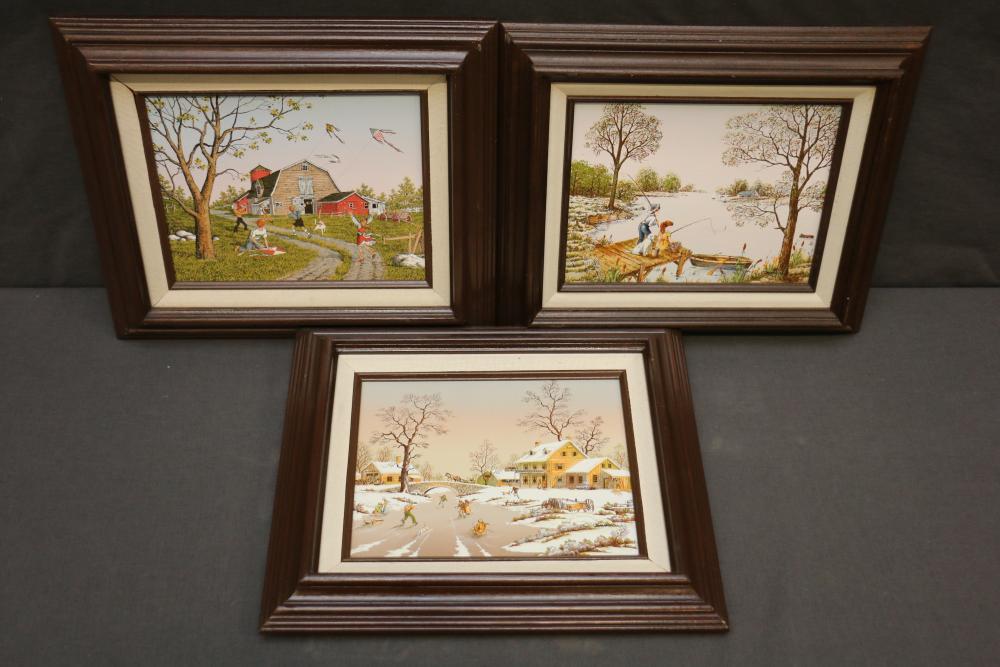Three Framed Rural Scenes signed in lower right of each by "C. Carson", featuring detailed depictions of a snowy landscape with ice skaters, a countryside road with kite flying, and a lakeside fishing scene. Pickup only.