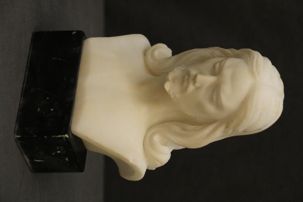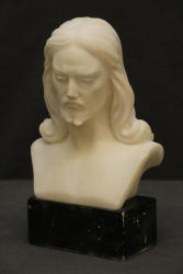 White Marble bust featuring long flowing hair and a solemn expression, mounted on a rectangular black stone base. Engraved signature on back appears to read "Prof. G. Bessi". 8.5" in height. Pickup only.