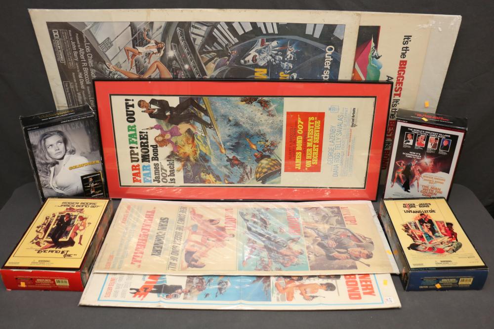 James Bond, Star Wars, Tarzan, and other memorabilia including action figures, collectible items in original packaging, and vintage James Bond movie posters featuring Thunderball, You Only Live Twice, and Moonraker. Items include Star Wars toys, a Tarzan action figure, vintage toy cars, and Superman boxed items. Pickup only.