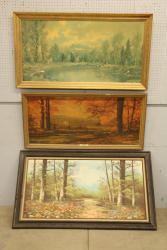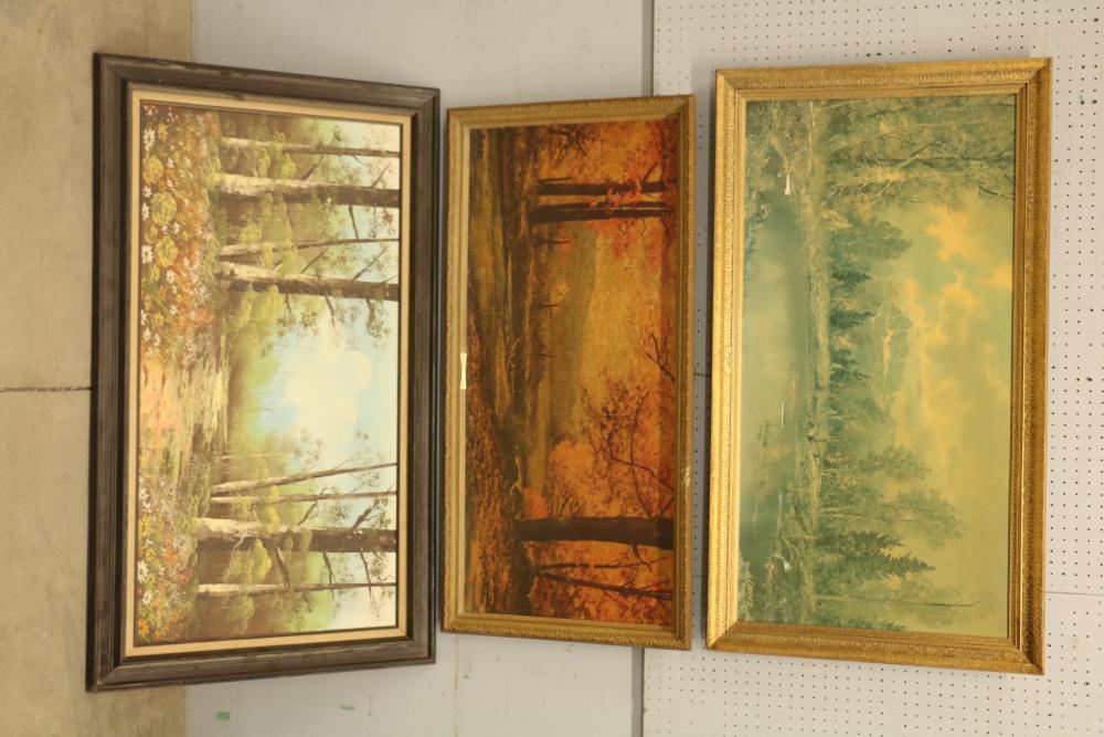 Three Framed Landscape Art Pieces by Various Artists. Includes "Mountain Retreat" by Lorenz, "October Gold" by Robert Wood, and an canvas from "Carl Hager". (56" x 31.25") Pickup only.