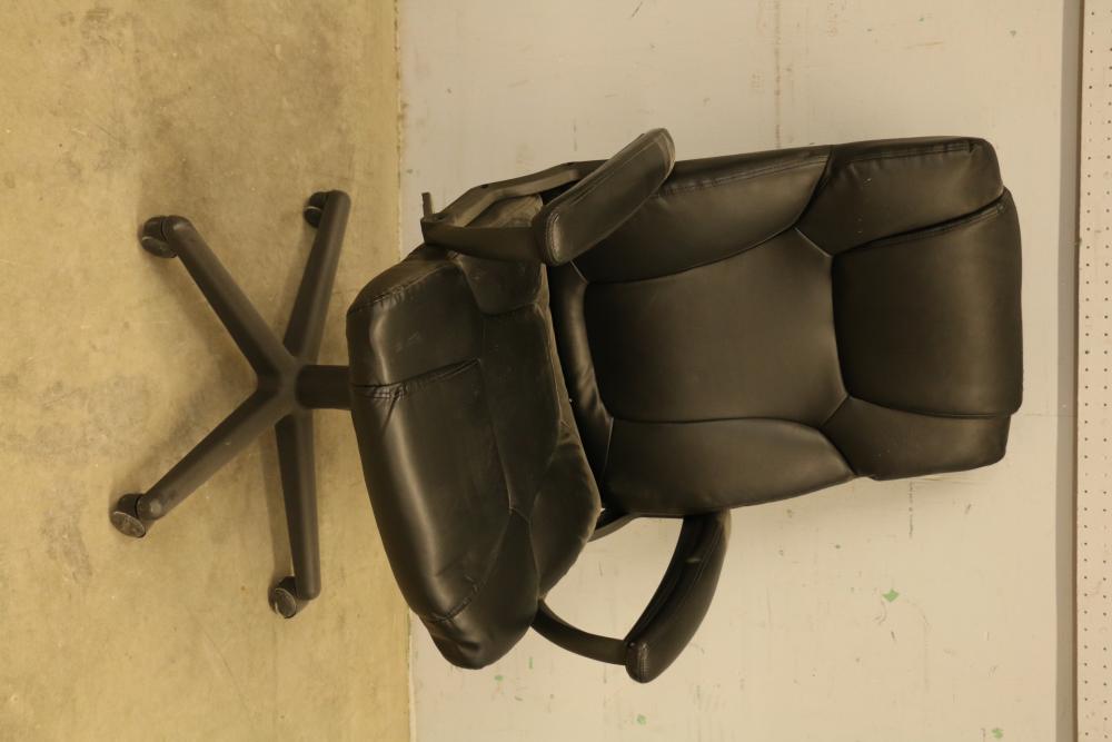 Black Adjustable Office Chair with Armrests and Casters. Chair features a padded backrest and seat, adjustable height function, armrests, and a five-wheel caster base for mobility. Chair control includes settings for height adjustment and locking positions. Pickup only.