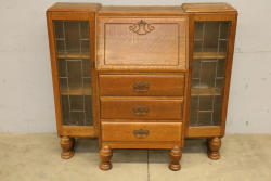 Secretary Cabinet with Glass-Paned Doors and Three Drawers. Features a central drop-front writing surface with interior dividers, two cabinet compartments with glass-paned swing doors and three drawers with detailed metal pulls and turned wood feet. (43.5"H x 48.25"L x 15.25"W) Pickup only.