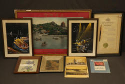 Framed Artworks and Ivorex Illustrations. Includes various framed pieces featuring a signed governmental certificate with a fountain pen, two Asiatic-themed art prints appearing to be signed by "Kyun", a framed floral illustration, a framed print of a ballerina, Ivorex relief images depicting Niagara Falls and Parliament of Canada, and a photo of Keir Dullea. (22" x 34" Pickup only.