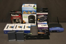 Electronics bundle including Harman Kardon desktop speakers, 500GB Samsung 860 EVO SSD with box and manual, ProjectCam timelapse video camera, a Spyder3 Elite display calibration tool, Linksys router, Belkin N600 DB Wi-Fi dual-band adapter, Wave indoor digital HDTV antennas, and an Illumination LED light wizard. Pickup only.