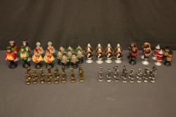 Medieval-Themed Chess Set with Metal and Ceramic Hand-Painted Pieces. Includes detailed brass chess pieces alongside hand-painted pieces representing medieval characters and themes. Pieces feature various forms such as knights, rooks, and pawns with a variety of finishes and decorative bases. Pickup only.