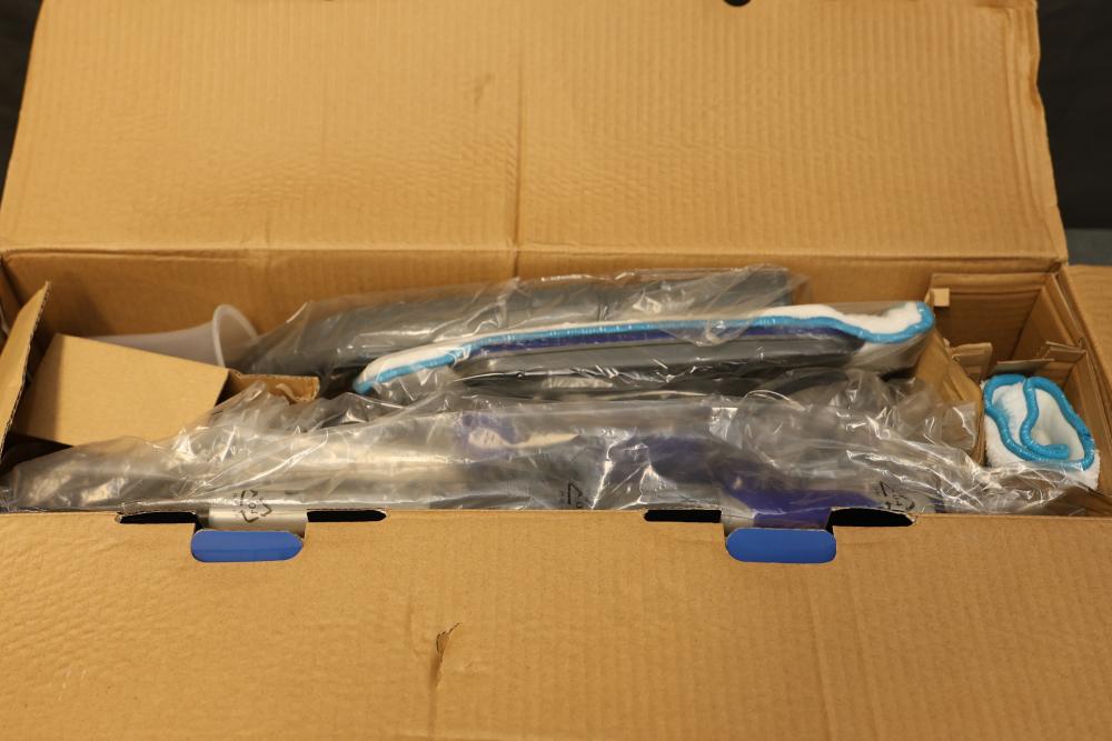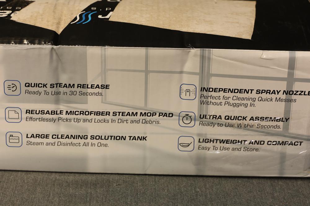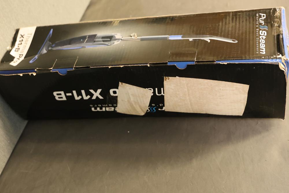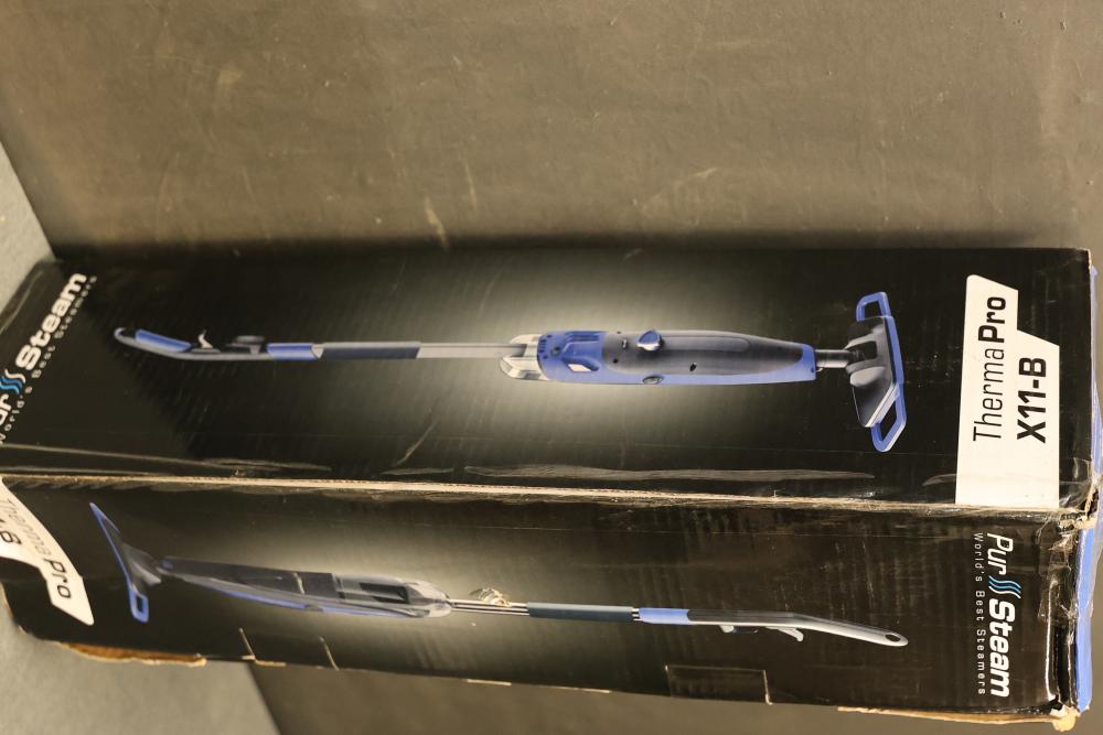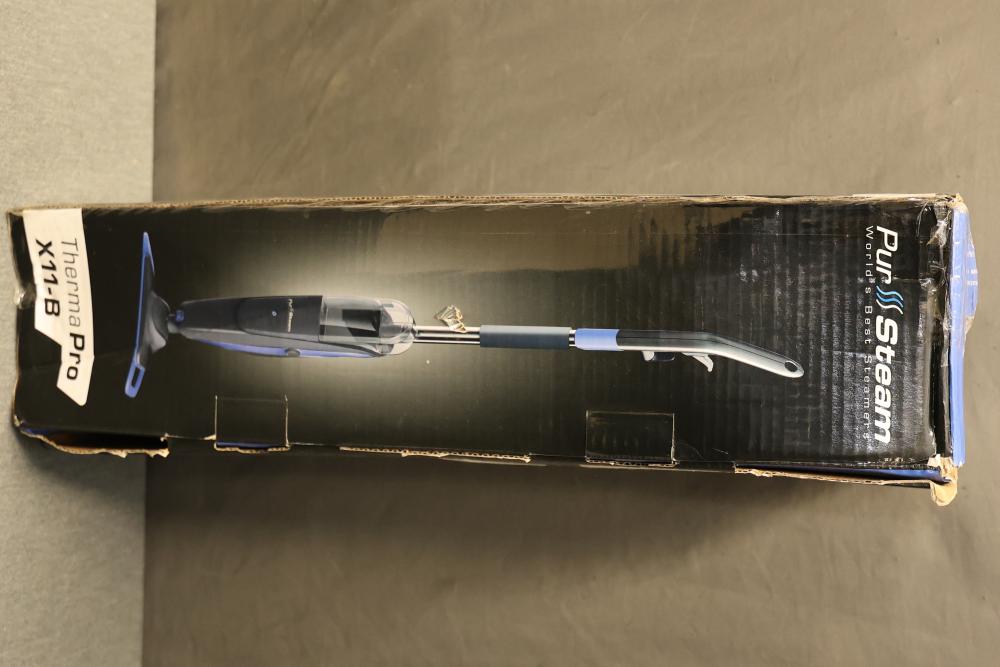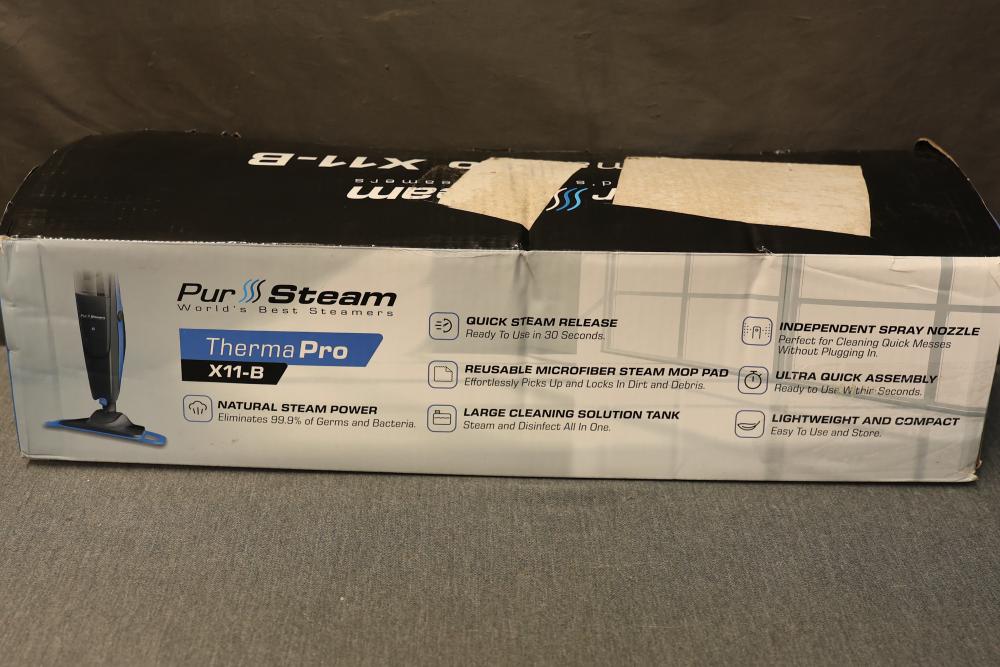 PurSteam X11-B ThermaPro 10-in-1 Steam Mop Cleaner. Features include quick steam release, reusable microfiber steam mop pad, large cleaning solution tank, independent spray nozzle, and lightweight design. Designed for versatile cleaning, it is ready to use in 30 seconds and offers ultra-quick assembly. The item is in its original box and appears unused. Pickup only.