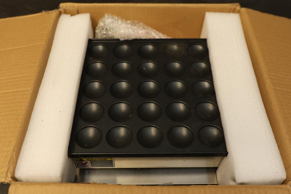 Livosa HYX-2240B 110V 25 Pc Mini Pancake and Muffin Maker. Designed for creating multiple mini pancakes or muffins simultaneously, featuring a durable structure, temperature control knobs, and various included accessories. Comes packaged in its original box. Pickup only.