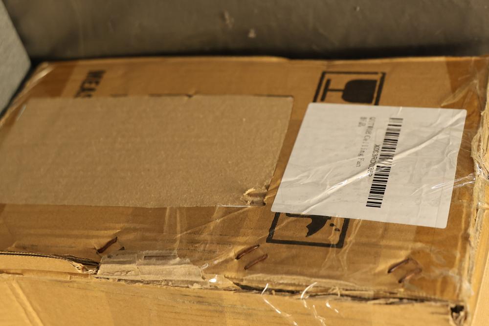 Qutwob 3 Blade 60 Inch Wood Ceiling Fan with Light Set and Remote in Black Walnut. Features a sleek design with a black walnut finish on the blades. Includes integrated LED light set and remote control for convenient operation. Packaged in its original box with included components securely stored. Pickup only.