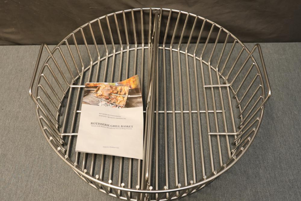 Onlyfire 8554 Rotisserie Grill Basket for Charcoal and Ash, designed to fit 24-inch diameter XL Big Green Egg grills and similarly sized ceramic grills. Made of durable stainless steel, it includes a divider and features a spacious circular design for efficient heat distribution. Includes the original manual. Pickup only.