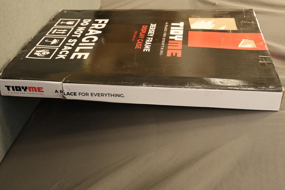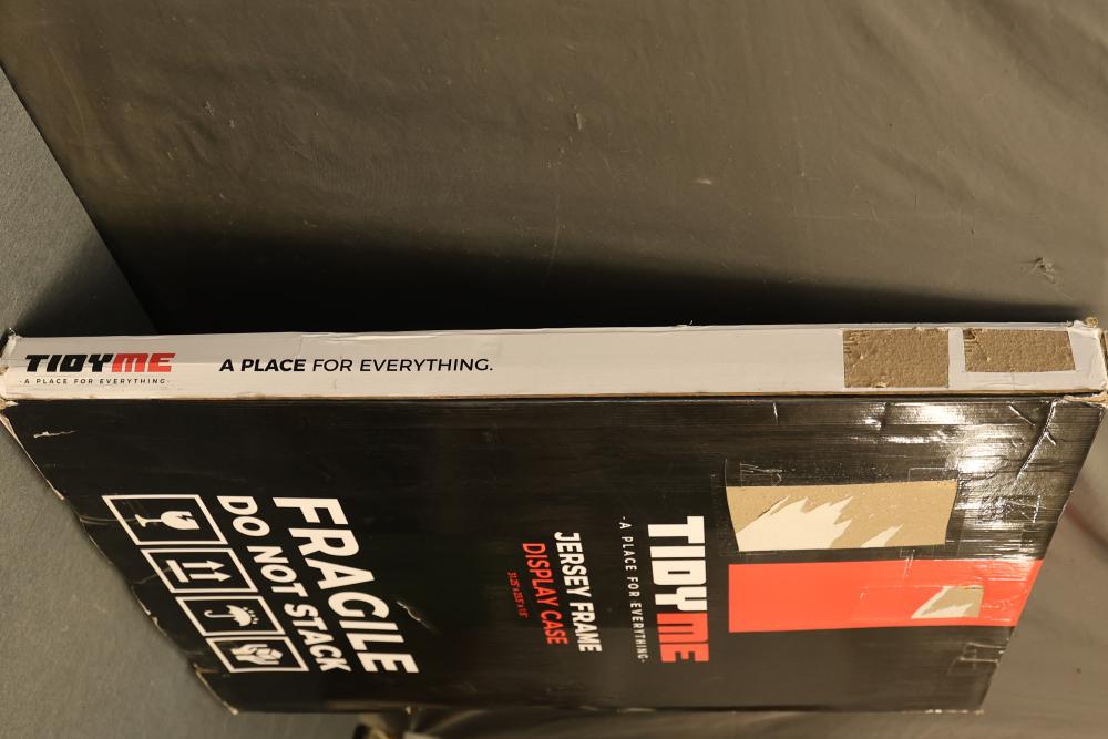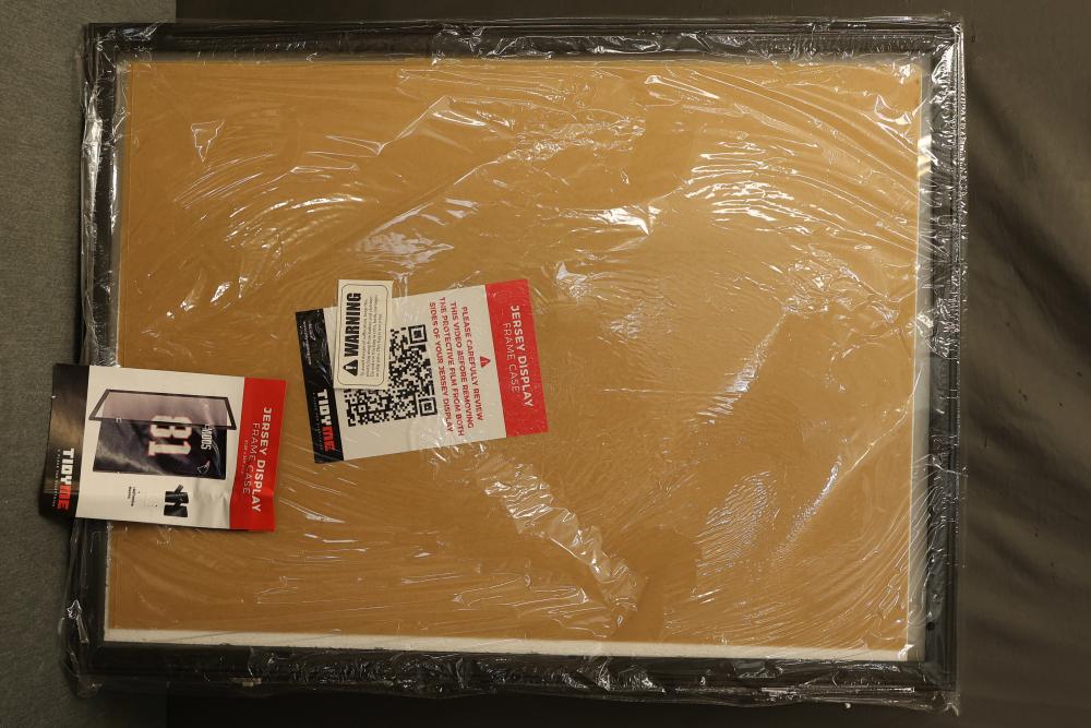 TidyMe Jersey Frame Display Case, Measuring 31.25 Inches Long 23.5 Inches Wide and 1.5 Inches Deep. Designed for displaying sports jerseys, the frame features a secure enclosure and sleek design. The item is new and includes the original box. Pickup only.